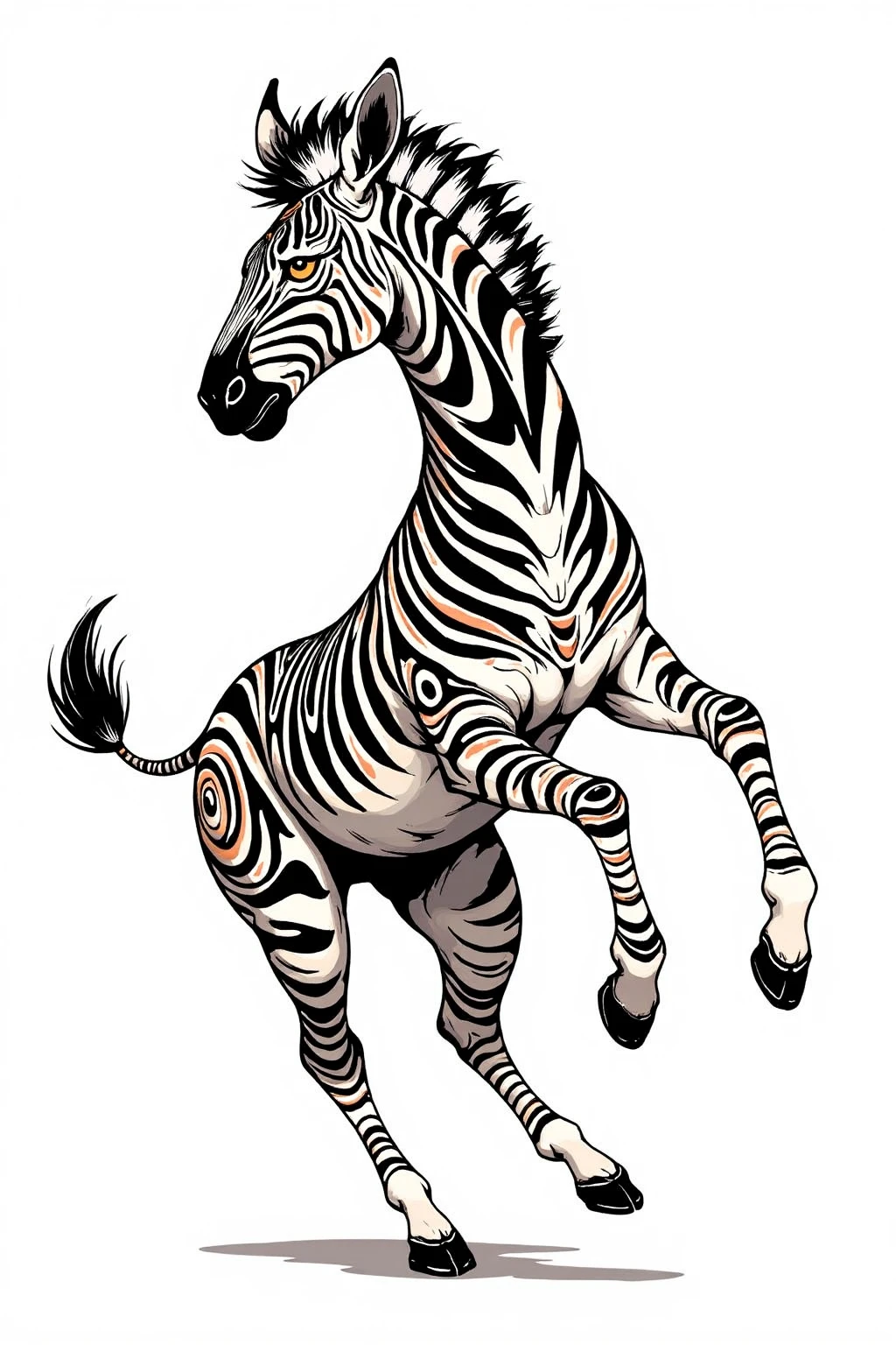 Tribal patterns and dynamic postures, make a tribal - patterned zebra, galloping, patterns enhancing its unique look, dynamic stripes.