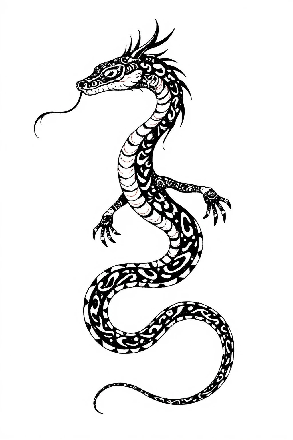 Tribal patterns and dynamic postures, draw a tribal - styled snake, slithering, body with intricate patterns, mysterious and flexible.