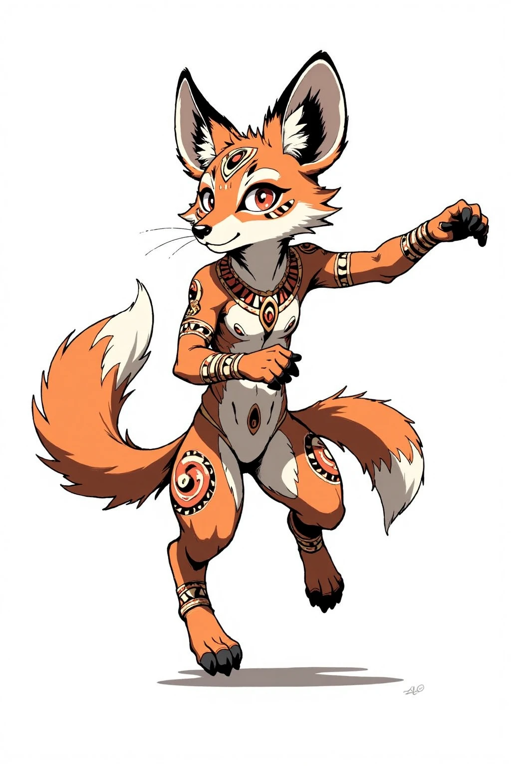 Tribal patterns and dynamic postures, design a tribal - styled fox, pouncing, patterns on its coat, sly and energetic movement.
