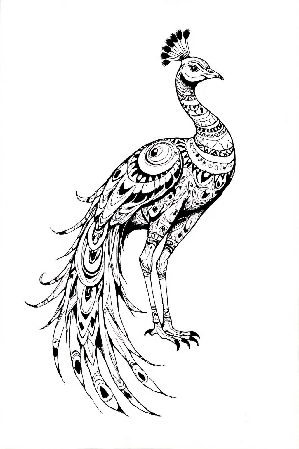 Tribal patterns and dynamic postures, sketch a tribal - themed peacock, displaying feathers, patterns adding mystery, dynamic and elegant.