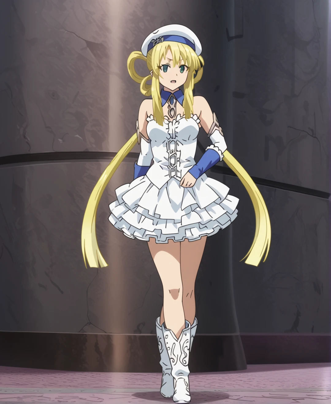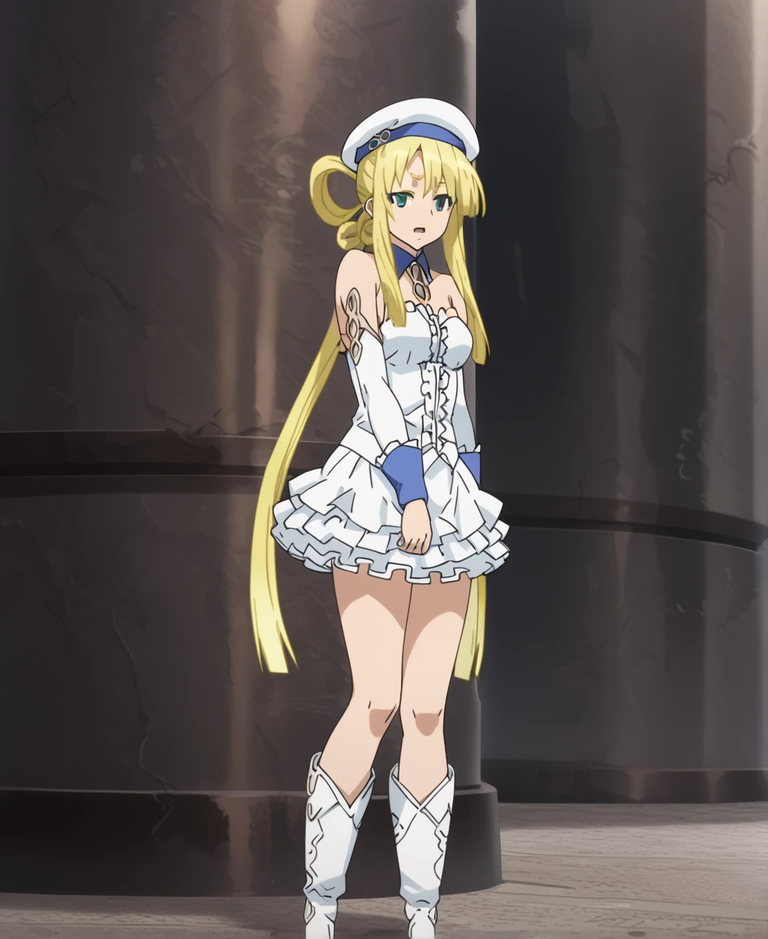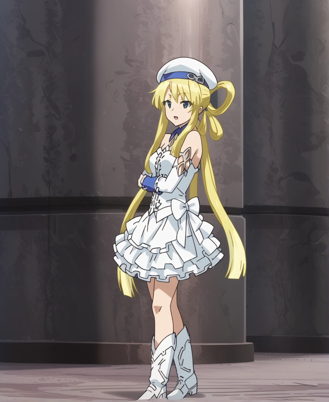 hat, boots, skirt, detached sleeves, beret, white footwear, bare shoulders, elbow gloves, dress, frills, gloves,
