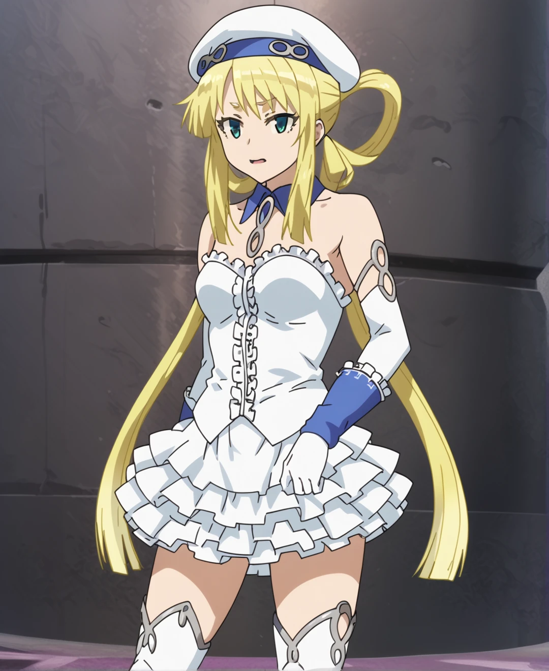 akizuki maxi, green eyes, aqua eyes, 1girl, solo, blonde hair, long hair, twintails, hair rings,