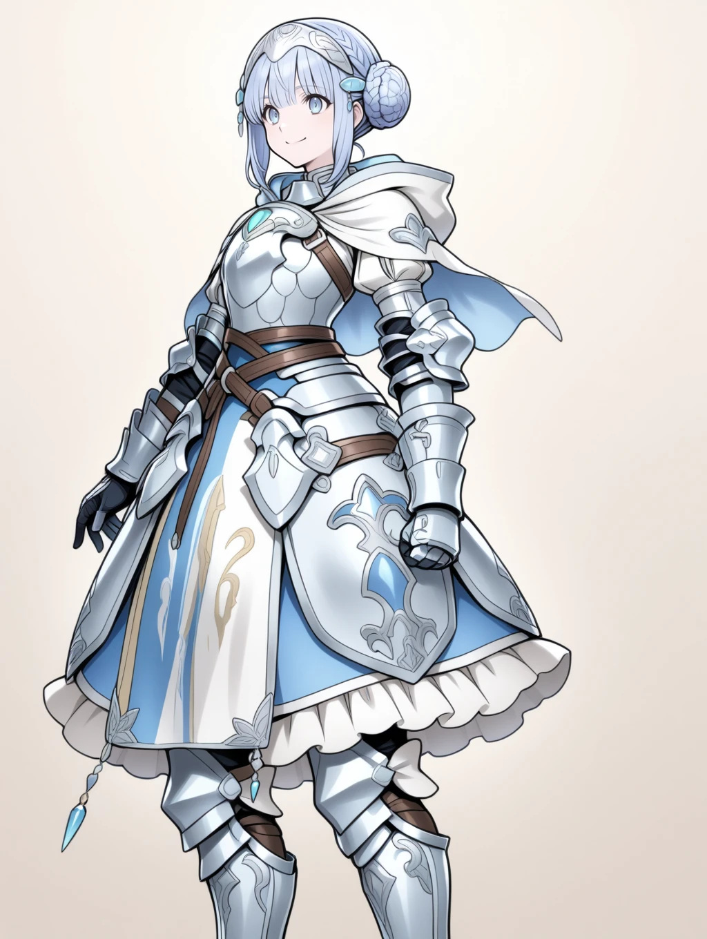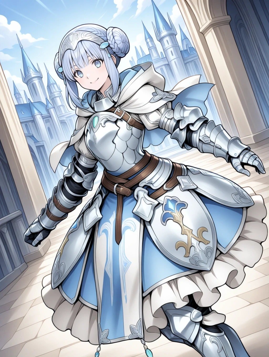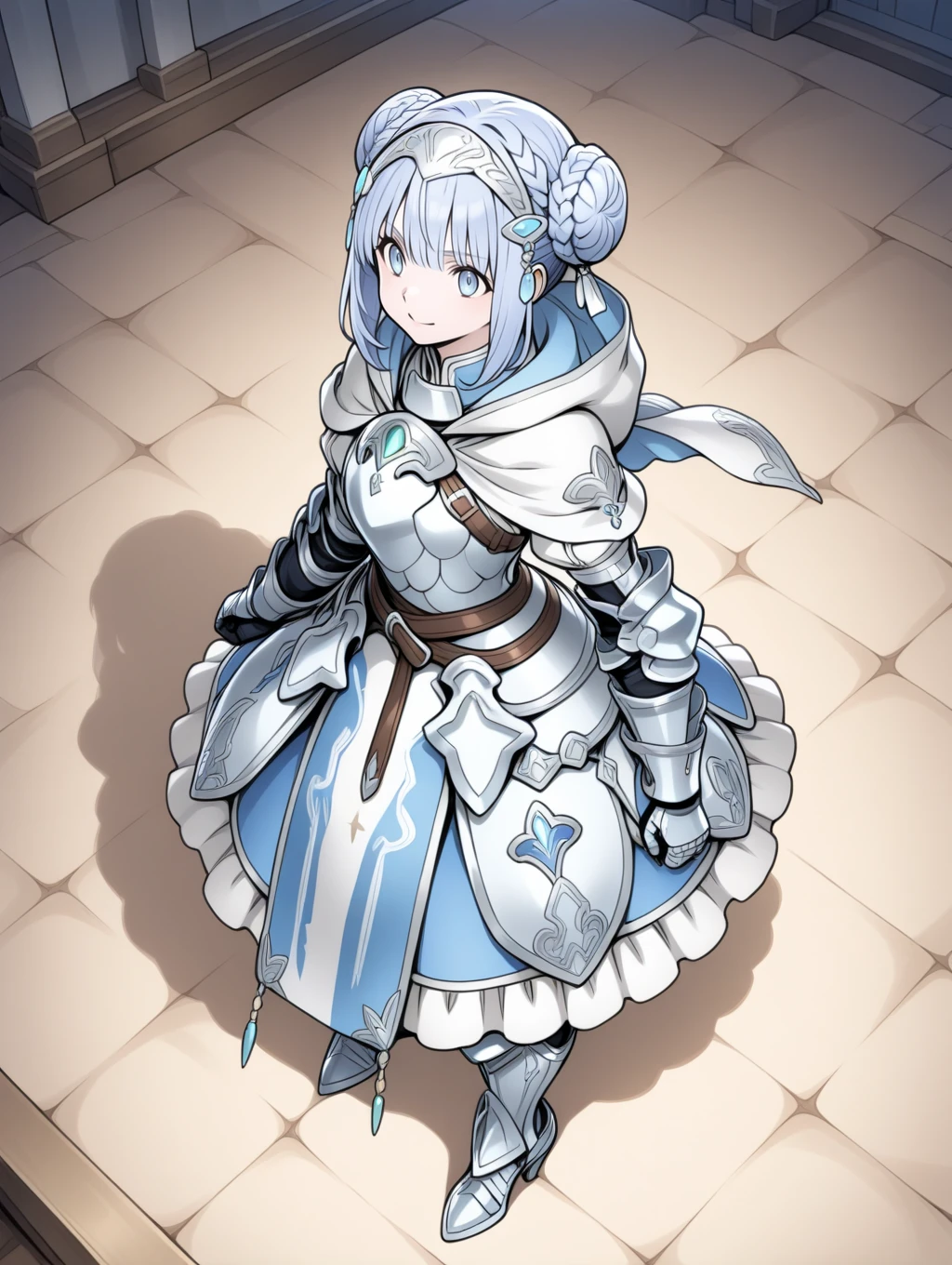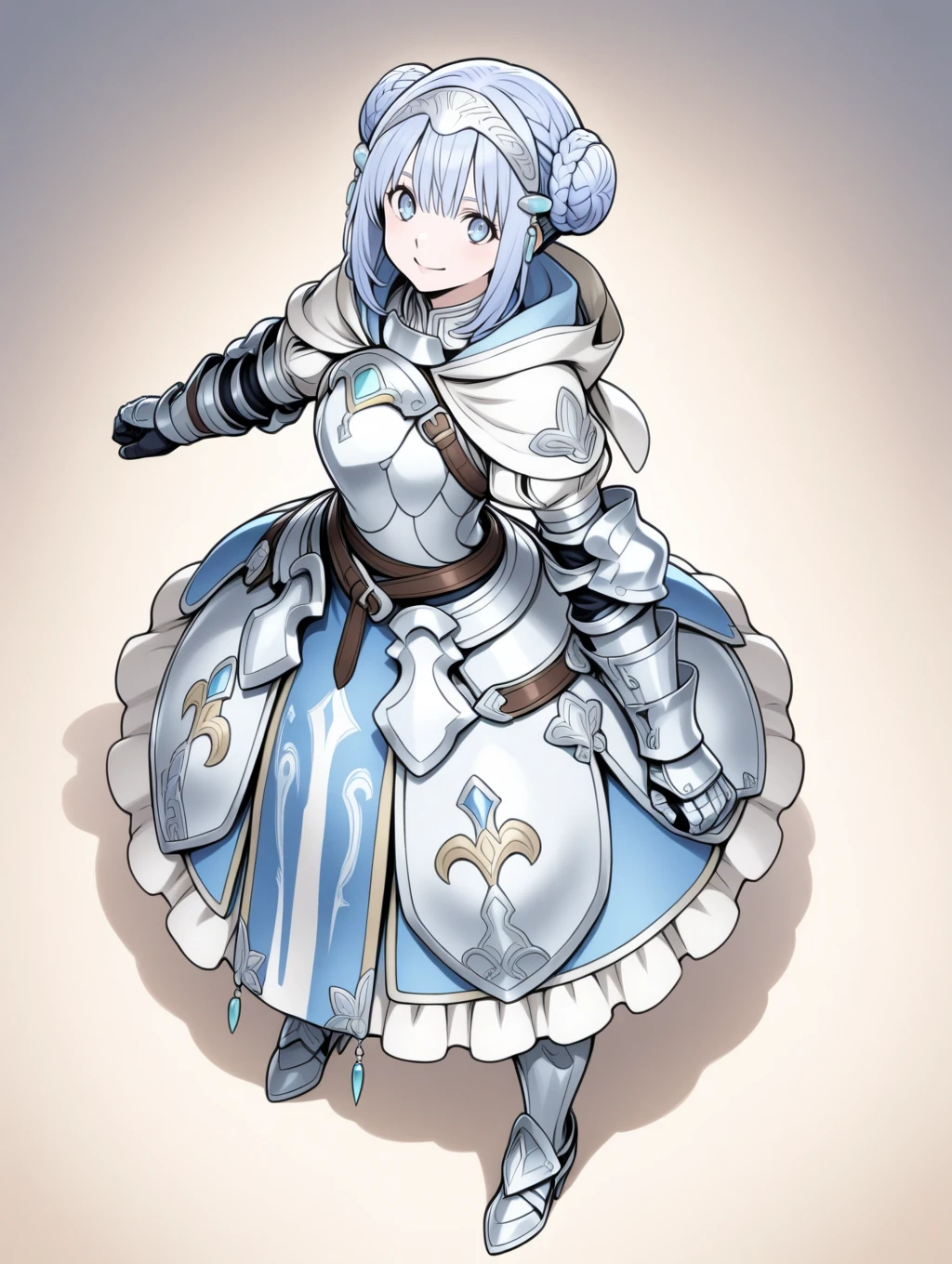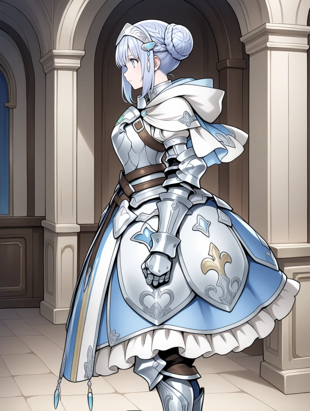 retelisia,blue eyes,blue silver hair,braided bun,hair ornament,hooded capelet,hood down,braid,capelet,armored dress,gauntlets,greaves,low double bun,