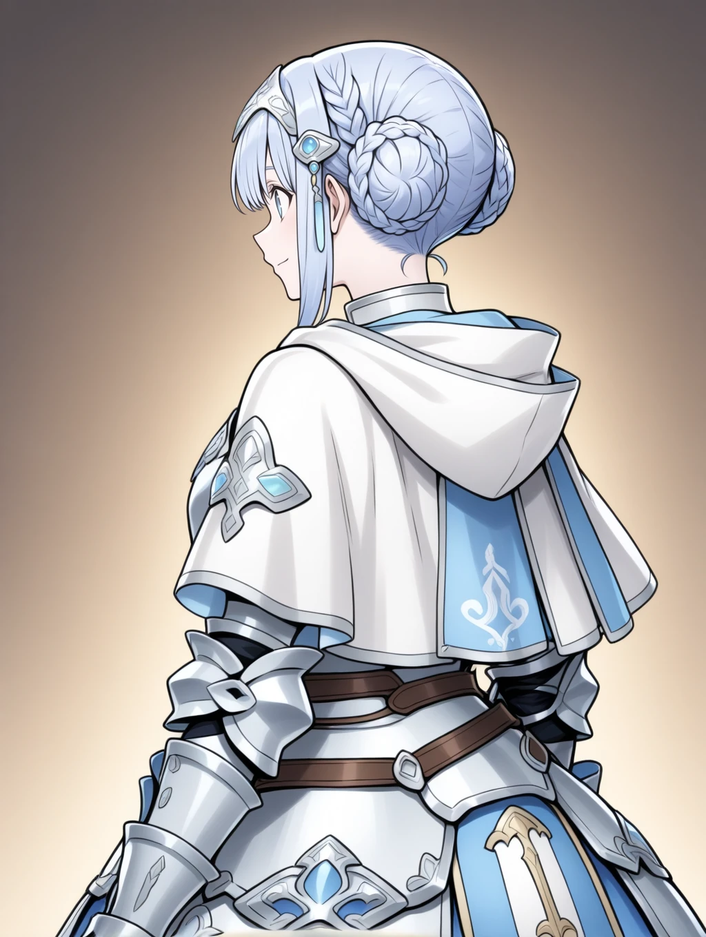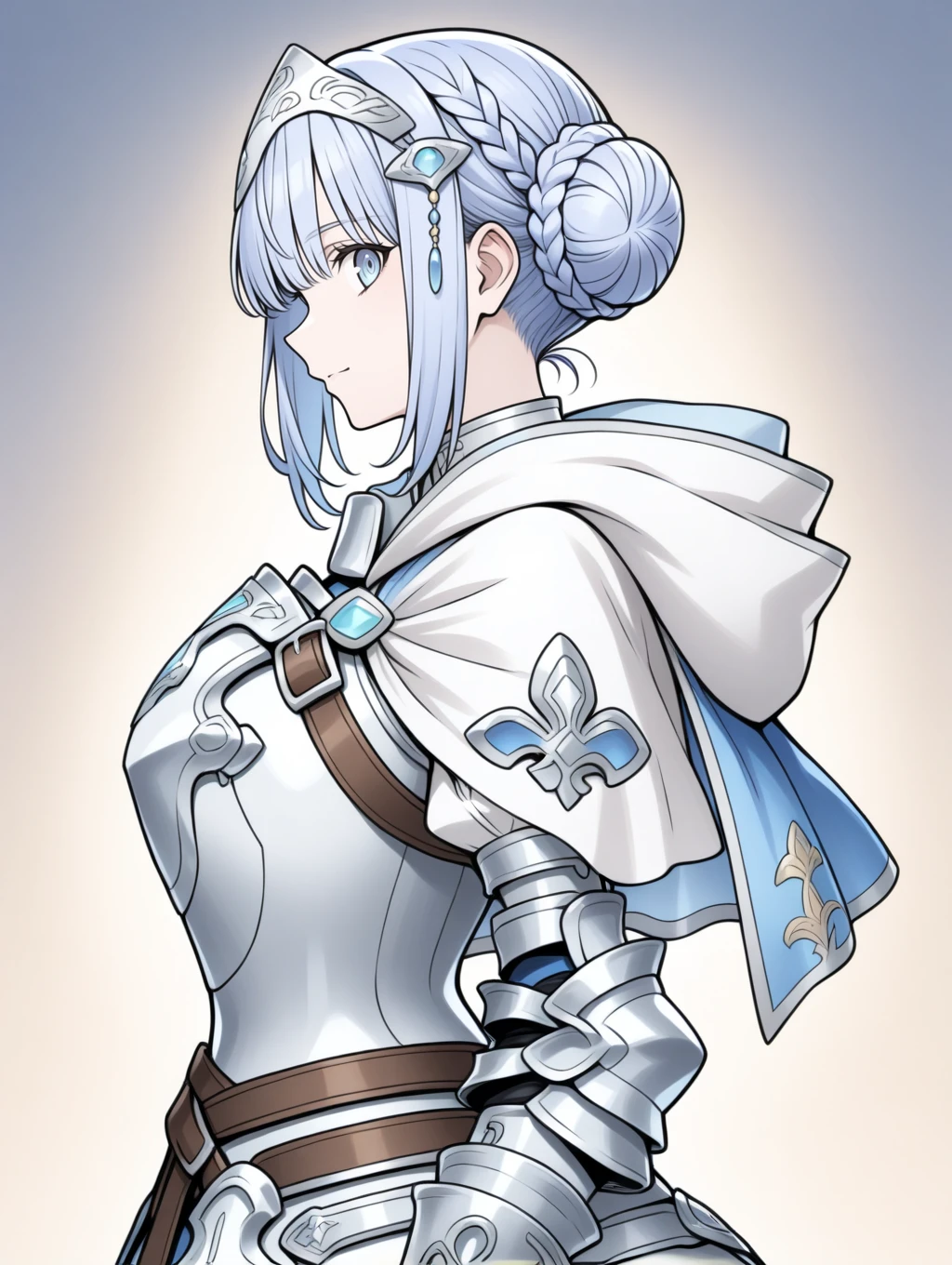 prompt example :retelisia,blue eyes,blue silver hair,braided bun,hair ornament,hooded capelet,hood down,braid,capelet,armored dress,gauntlets,greaves,low double bun,