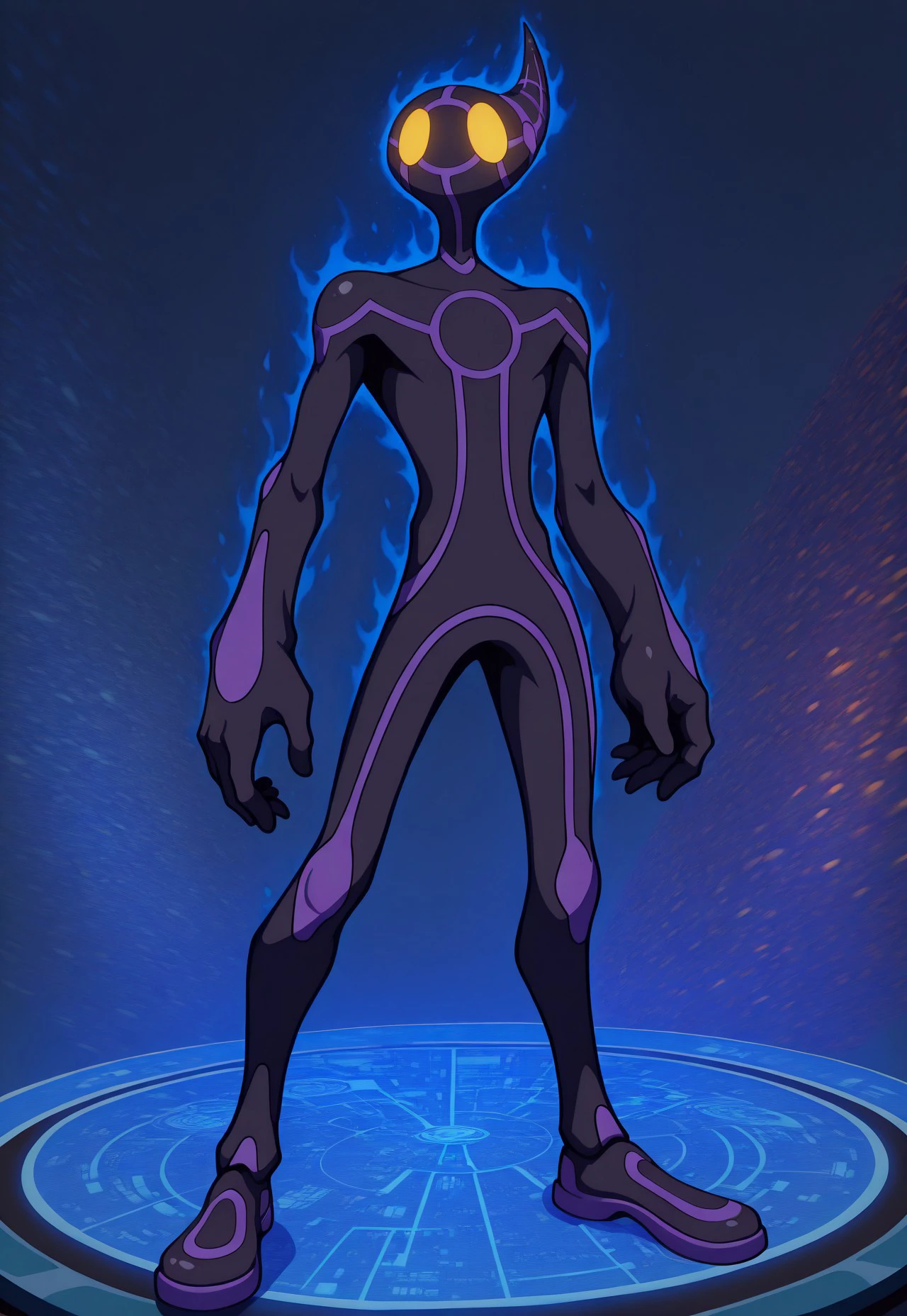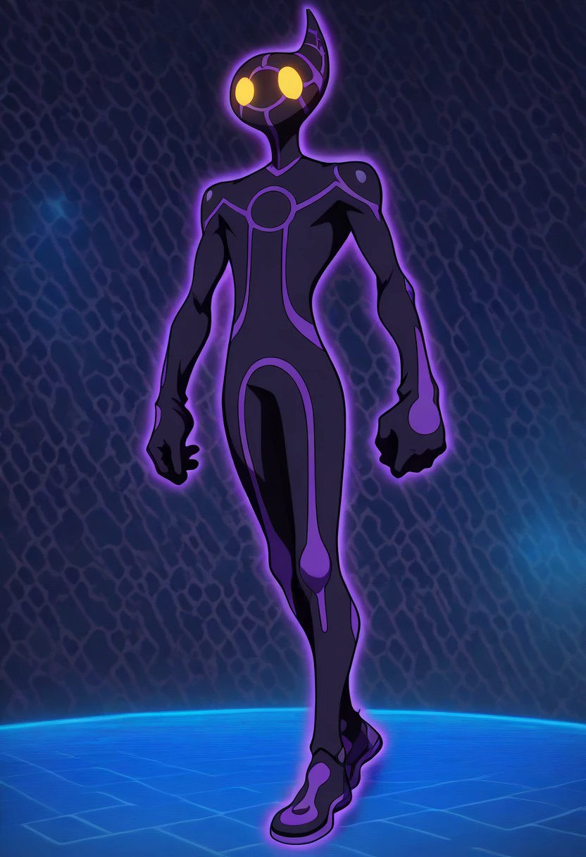 TAGS: aiyugioh, 1boy, colored skin, yellow eyes, no pupils, neon trim, no humans, glowing eyes, outline, shiny