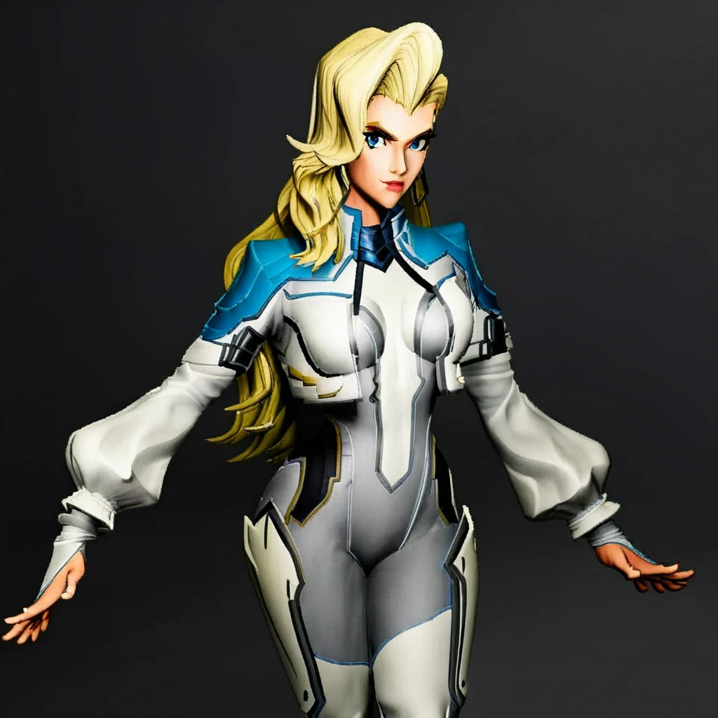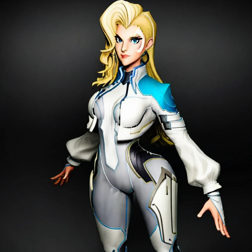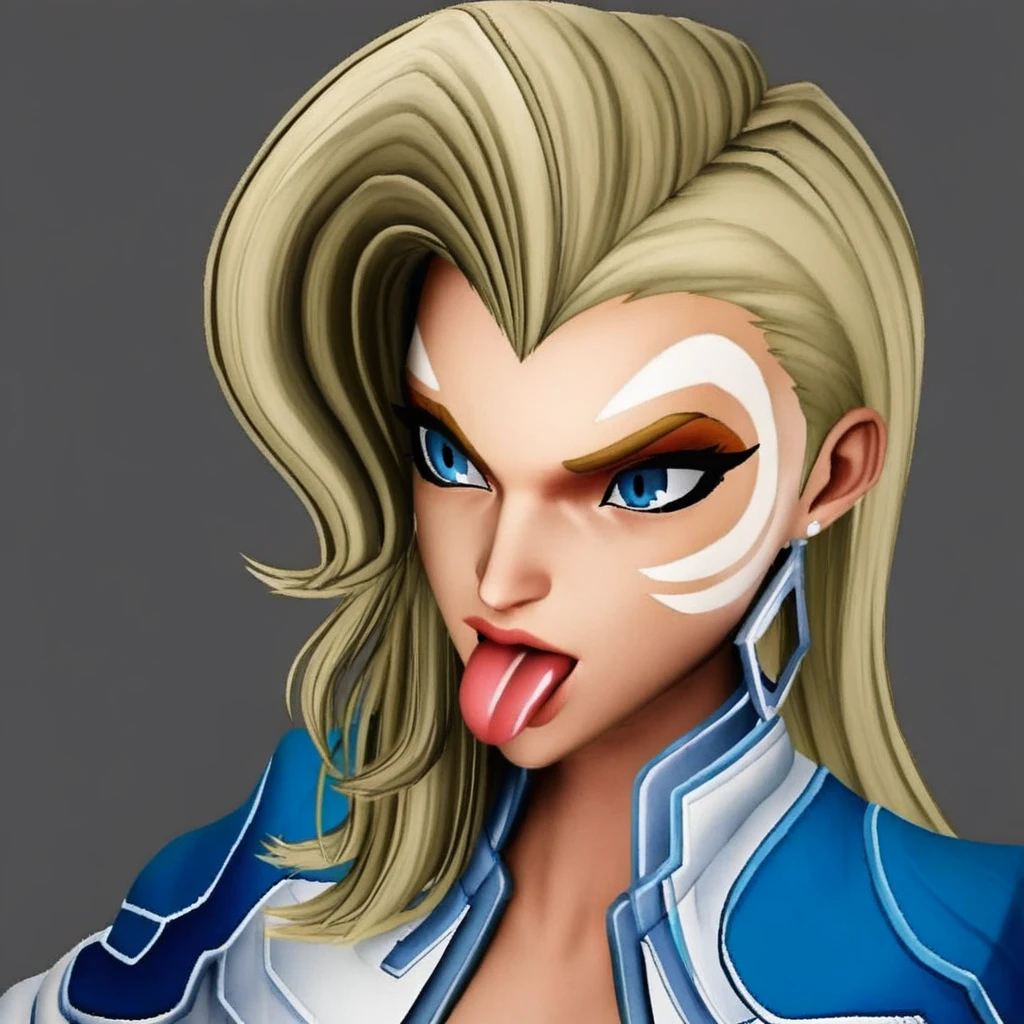 Dagger, blue eyes, moon face paint, blonde hair, bang, white bodysuit, white and blue jacket,