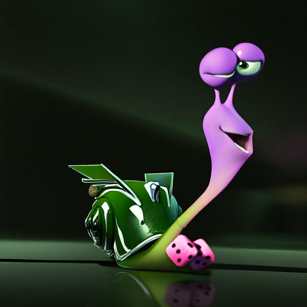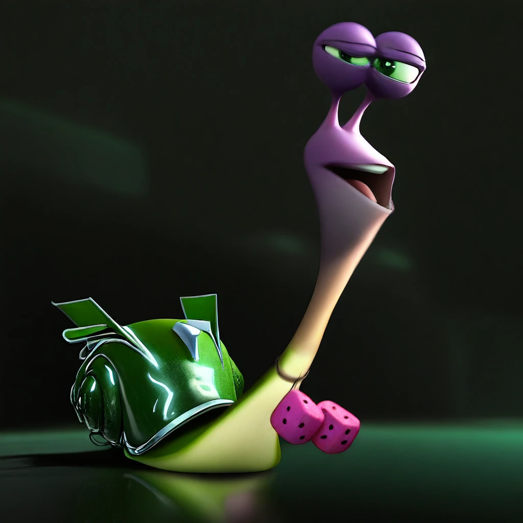 Smoove move, snail, pinkish purple head, green stalk eyes, stalk eyes, dark green body skin, fuzzy pink dice necklace, green racing shell, furry