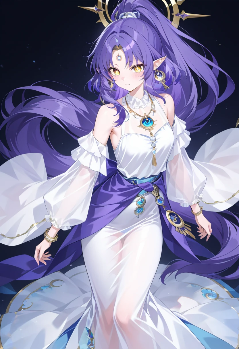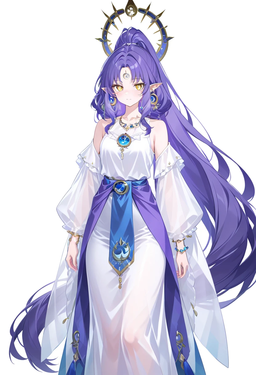 syy, 1girl, solo, yellow eyes, blue hair, purple hair, long hair, very long hair, high ponytail, ponytail, parted bangs, sidelocks, shoulders, long dress, white dress, long sleeves, white sleeves, wide sleeves, clothes, detached sleeves, puffy sleeves, blue gemstone, bracelet, crescent, earrings, mark, halo, jewelry, necklace, pointy ears
