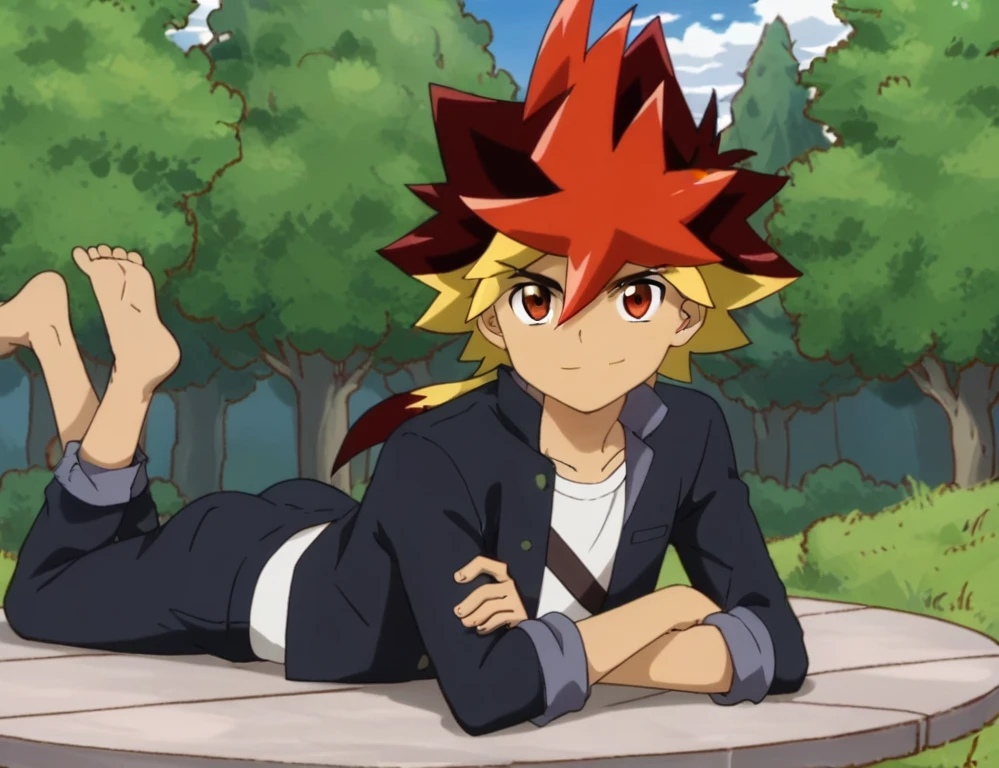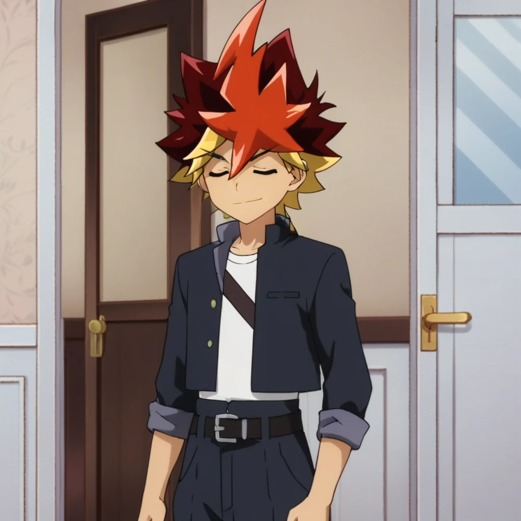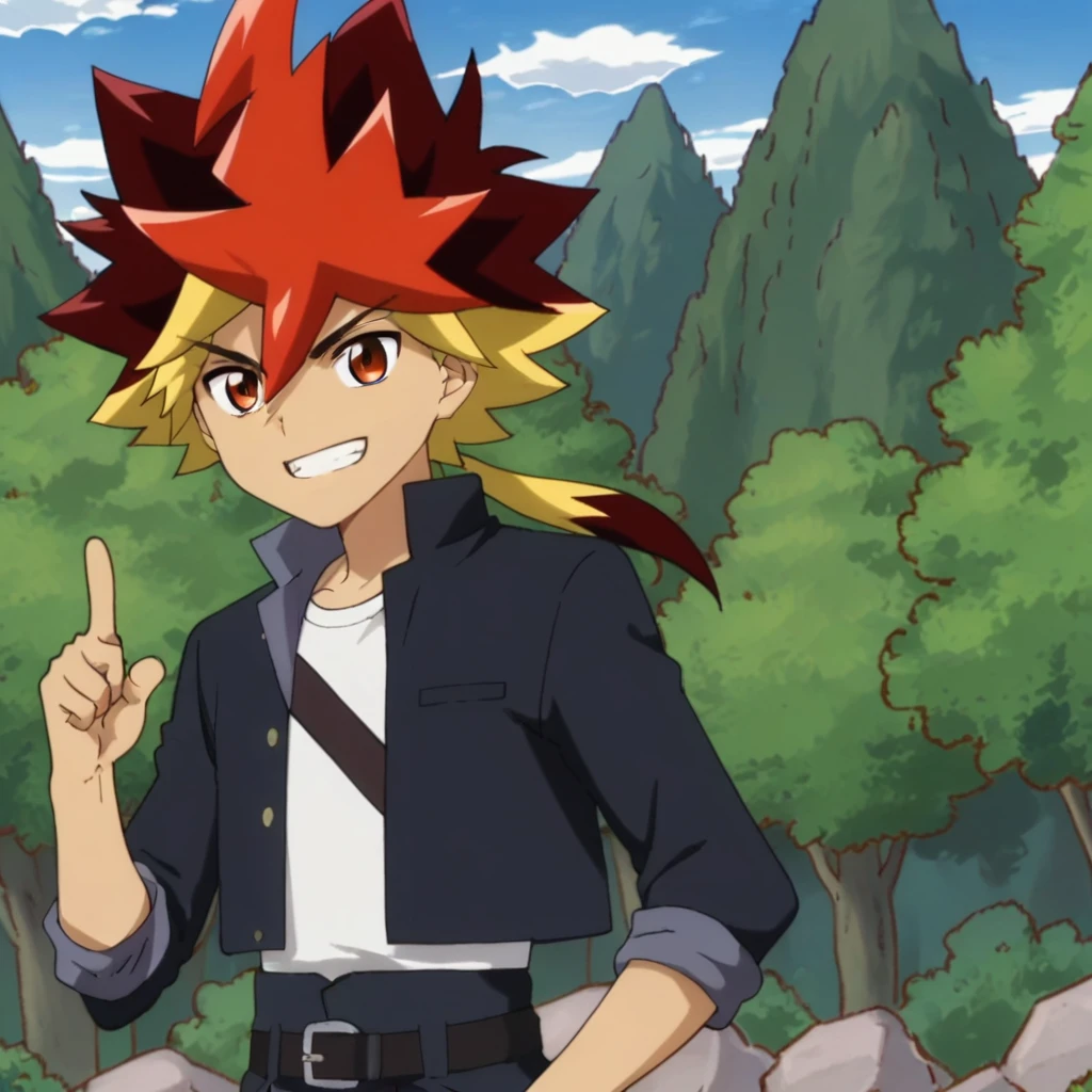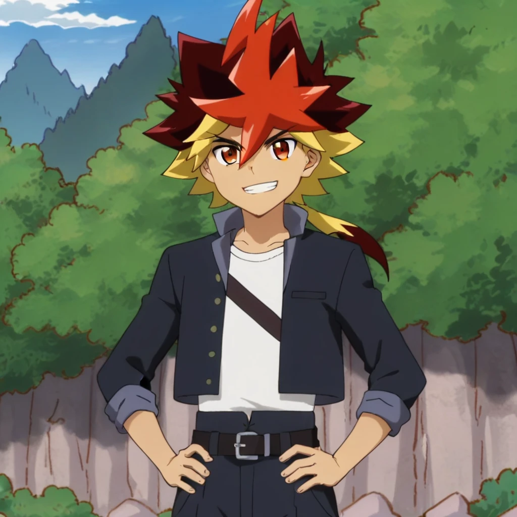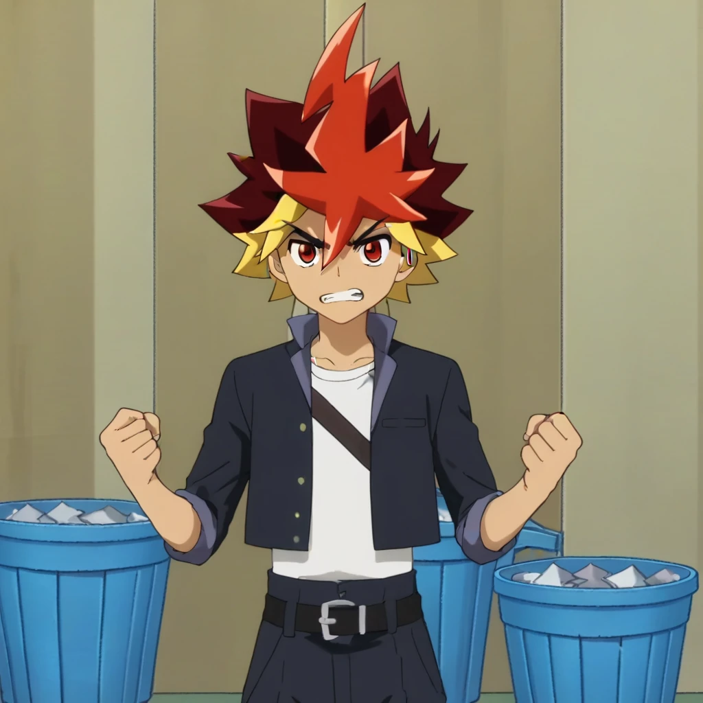 Prompts: male, multicolored hair, three-tone hair, blonde hair, dark red hair, light red hair, spiked hair, ponytail, red eyes, black jacket, sleeves rolled up, white shirt, blue fingerless glove on left hand, black pants, black belt, black loafers, indoors (bedroom/pink wall/pink wallpaper), indoors (mail room/trash can), outdoors (park/water tower), outdoors (forest), outdoors (mountains)