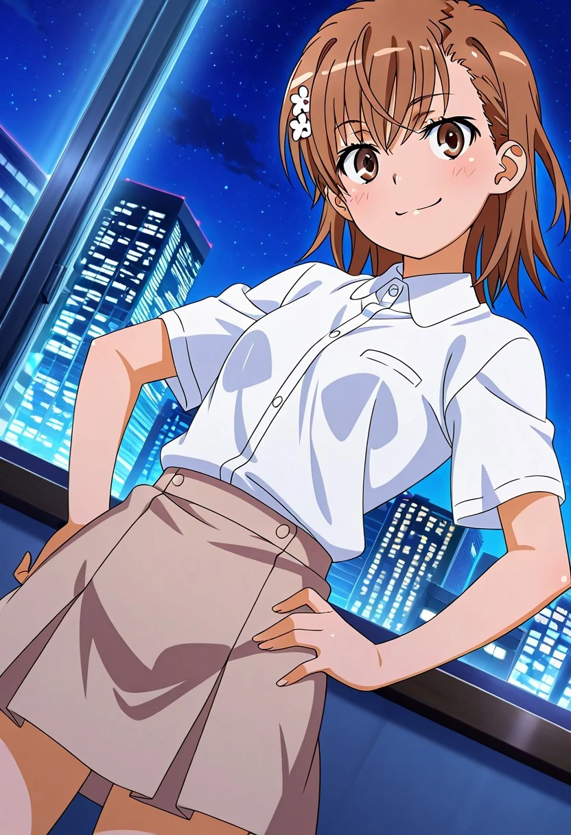 Mikoto Misaka,brown_hair, short_hair, hair_ornament, brown_eyes, small breasts,