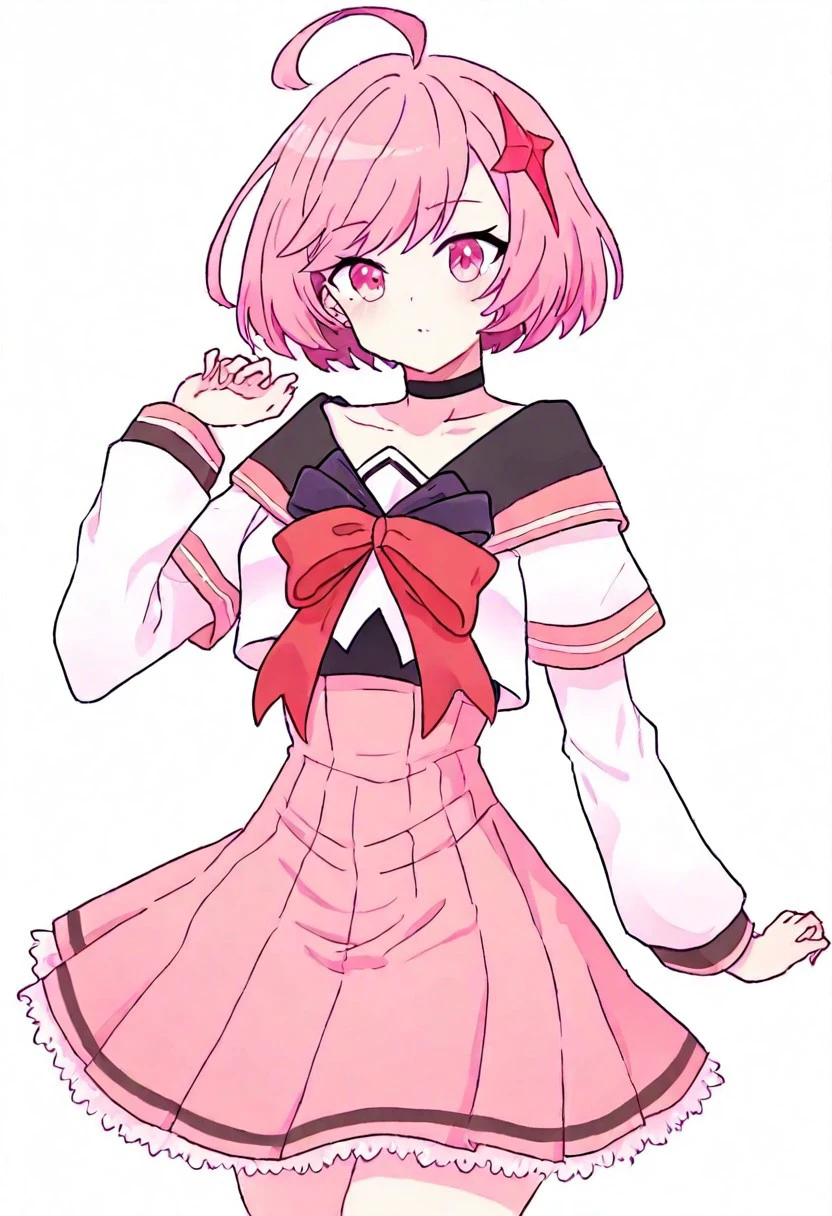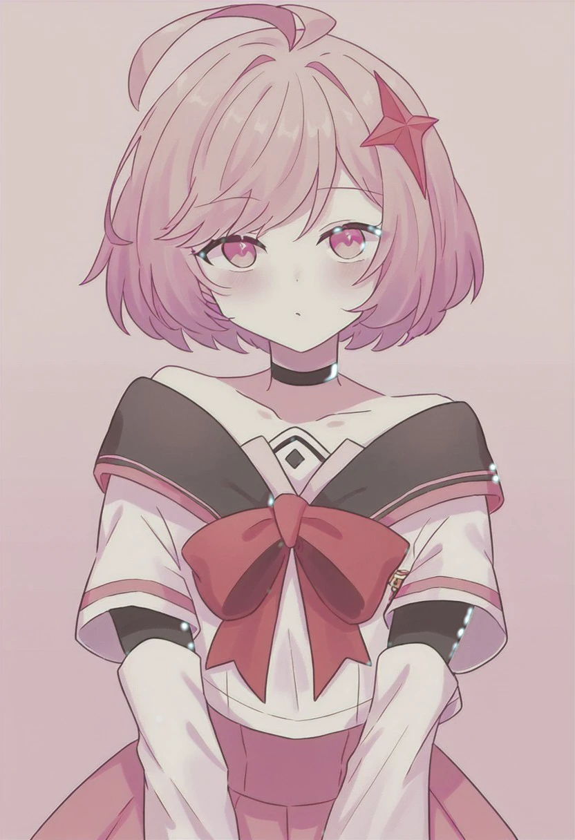 violet dms, original costume, 1girl, pink_hair, ahoge, choker, short_hair, black_choker, bow, pink_eyes, hair_ornament, skirt, dress, bangs, school_uniform, sailor_collar, red_bow, short_sleeves, bowtie,