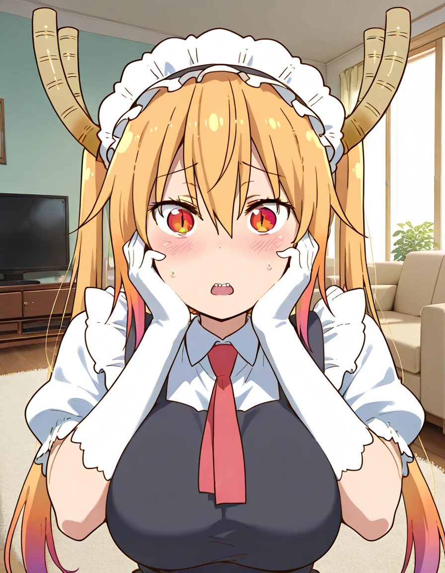 1girl, solo, long hair, blonde hair, dragon horns, dragon girl, twintails, multicolored hair, maid headdress, maid, gradient hair, red necktie, smile, slit pupils, looking at viewer, hair between eyes, white gloves, orange hair, blush, large breasts, short sleeves, red eyes, closed mouth, elbow gloves, bangs, puffy sleeves, maid dress, upper body