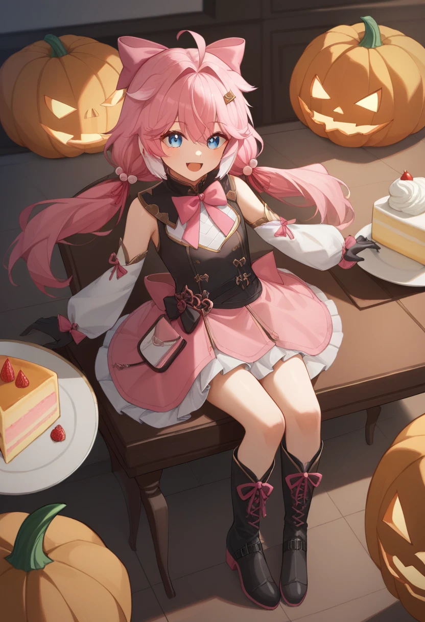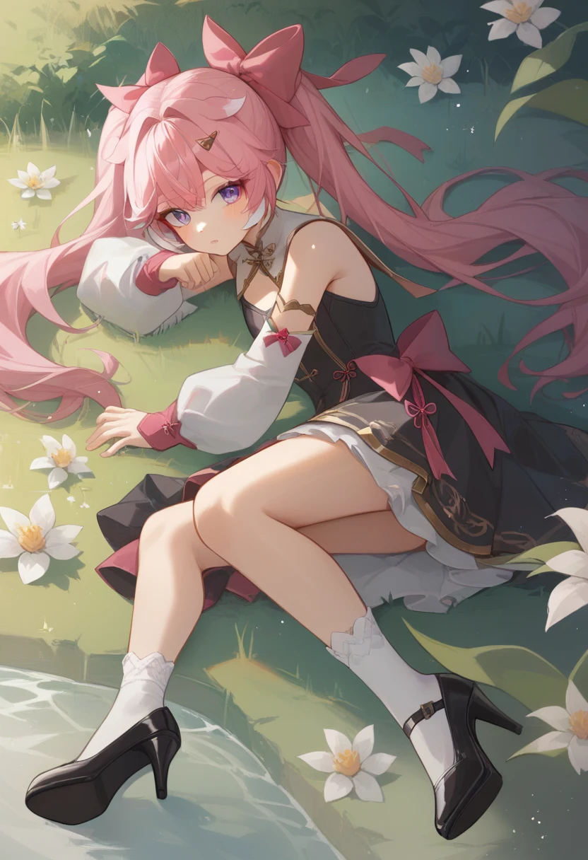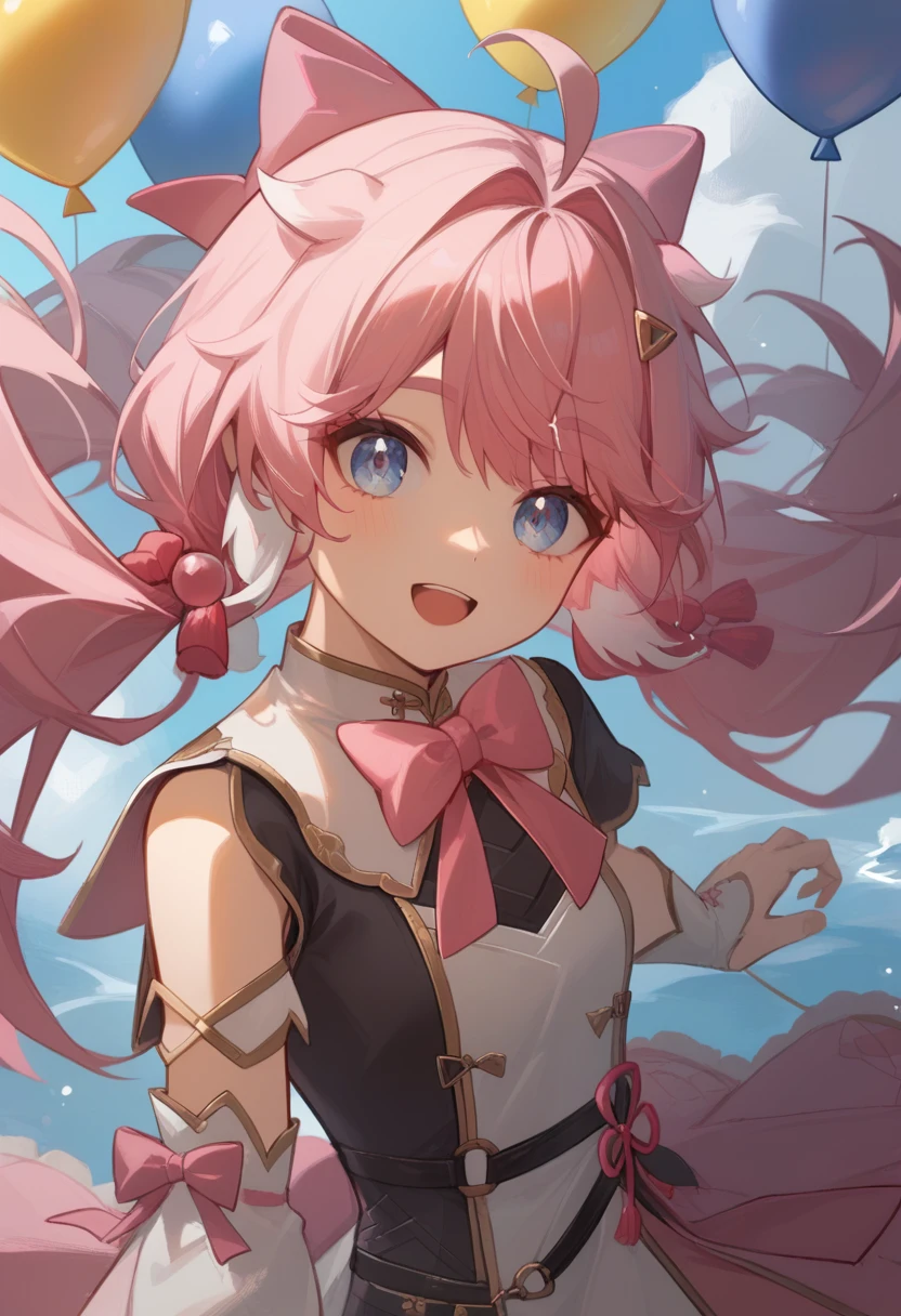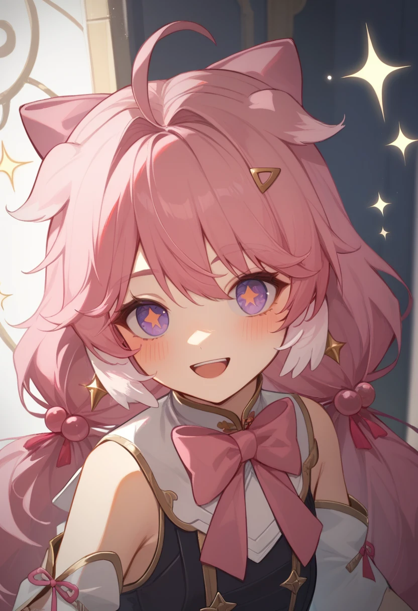 encore_(wuthering_waves), pink_hair, 1girl, long_hair, ahoge, purple_eyes, hair_ornament, hair_bow, virtual_youtuber, pink_bow, long_sleeves, upper_body, low_twintails, detached_sleeves, horns