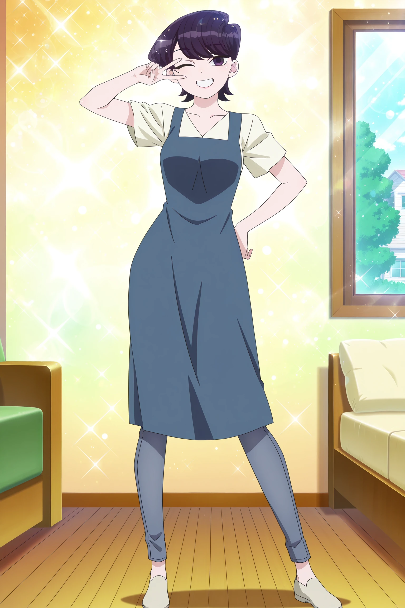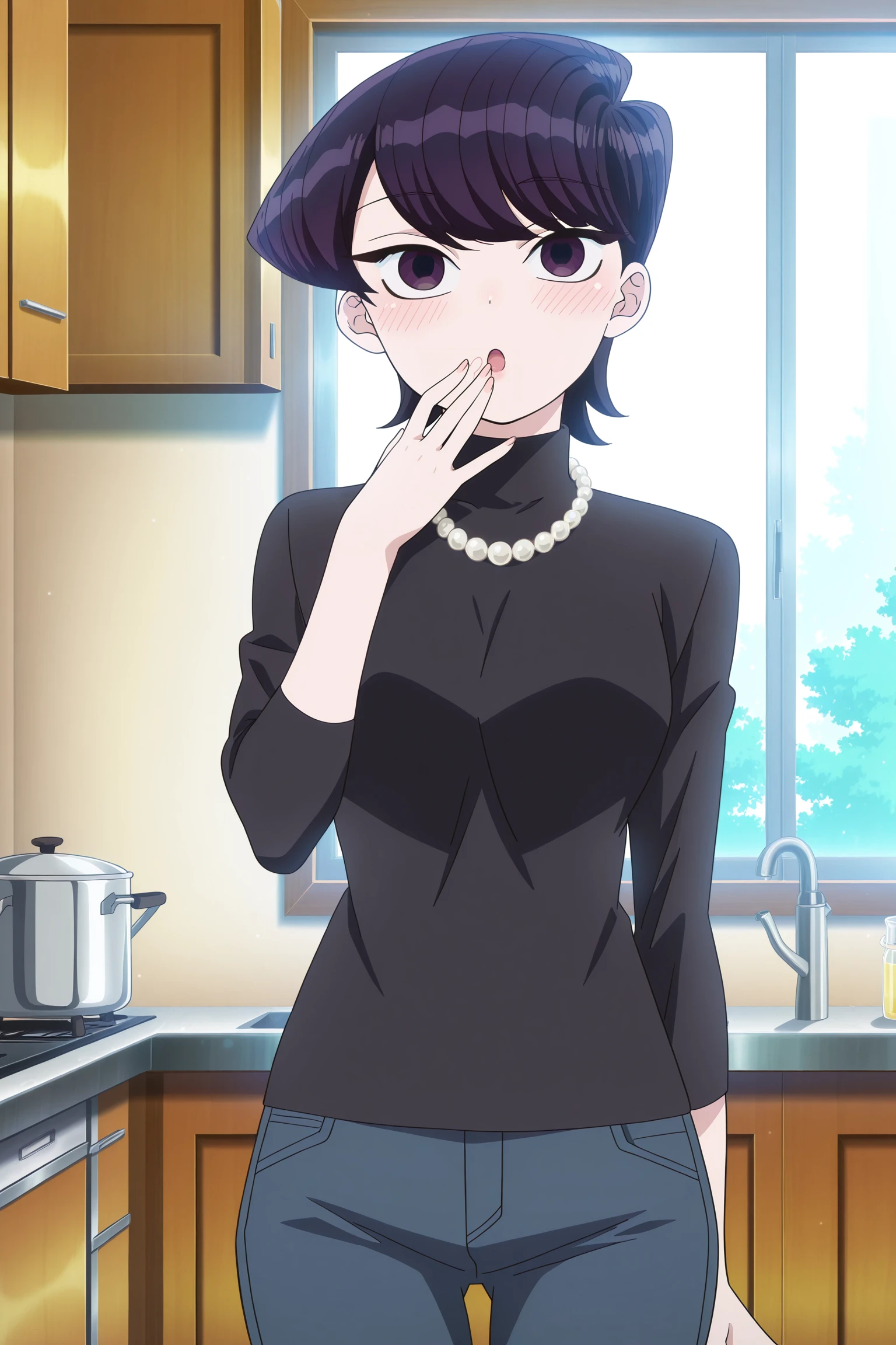 Shuuko Komi (character), 1girl, mature female, short hair, swept bangs, black hair, purple hair, purple eyes