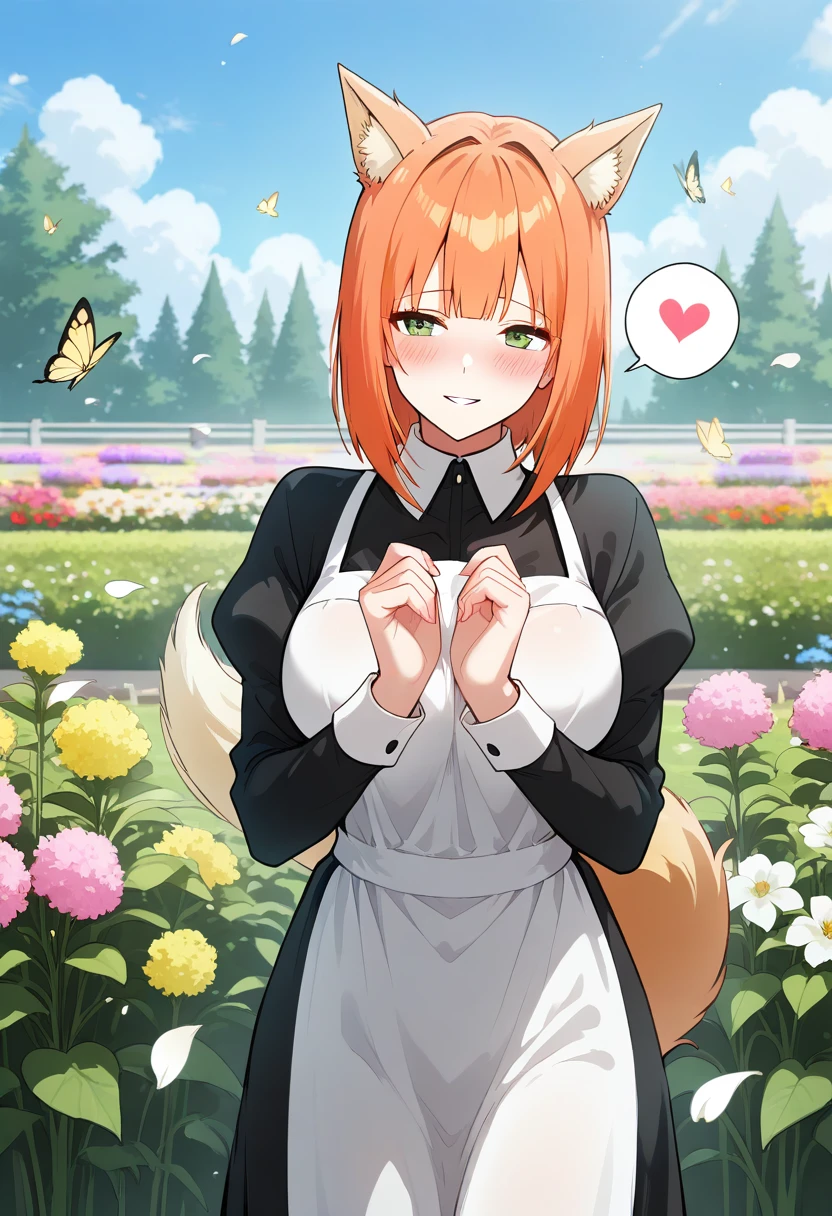 Riel, orange hair, short hair to shoulder, bangs, sidelocks, green eyes, fox ears, fox tail, cleavage, maid dress,