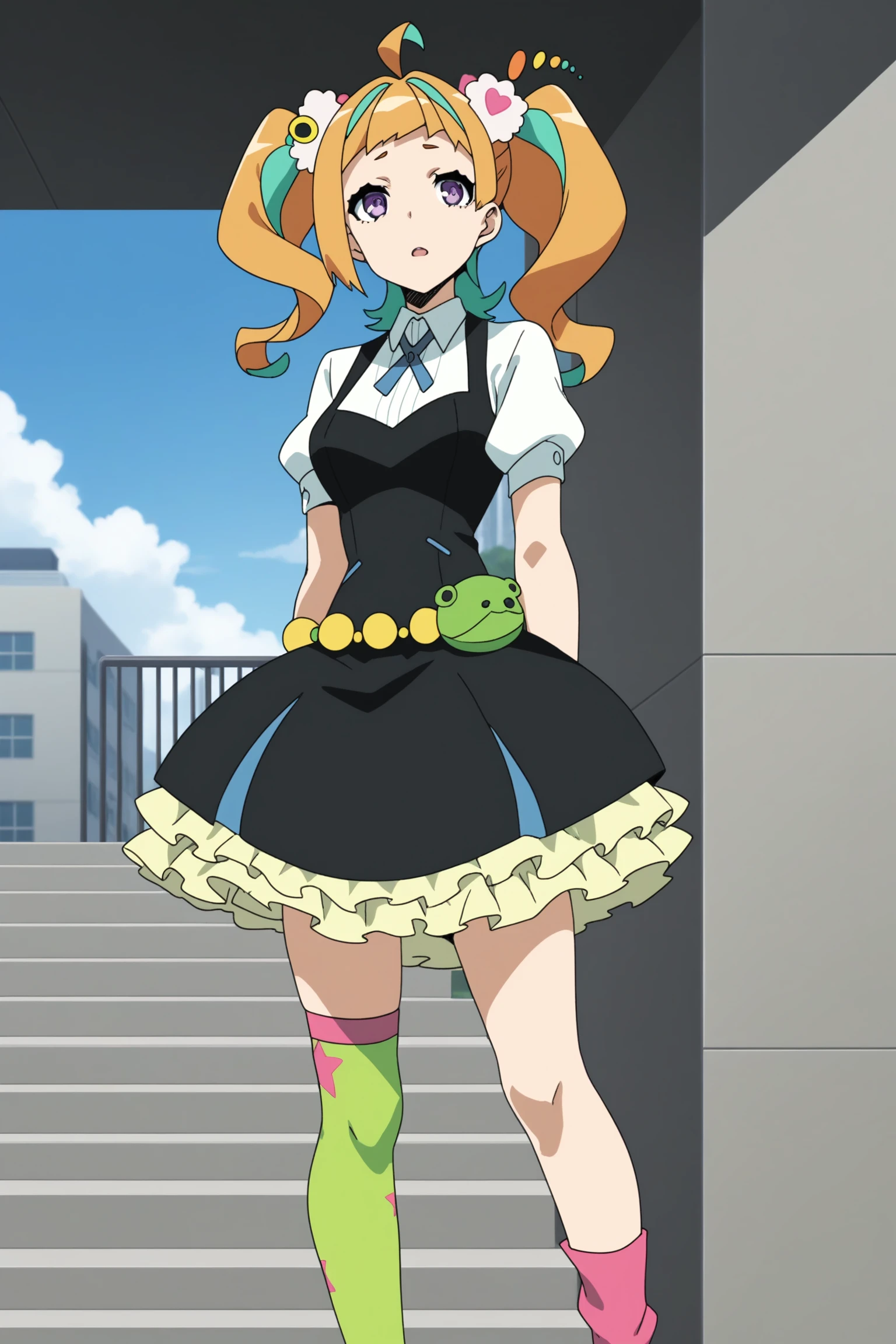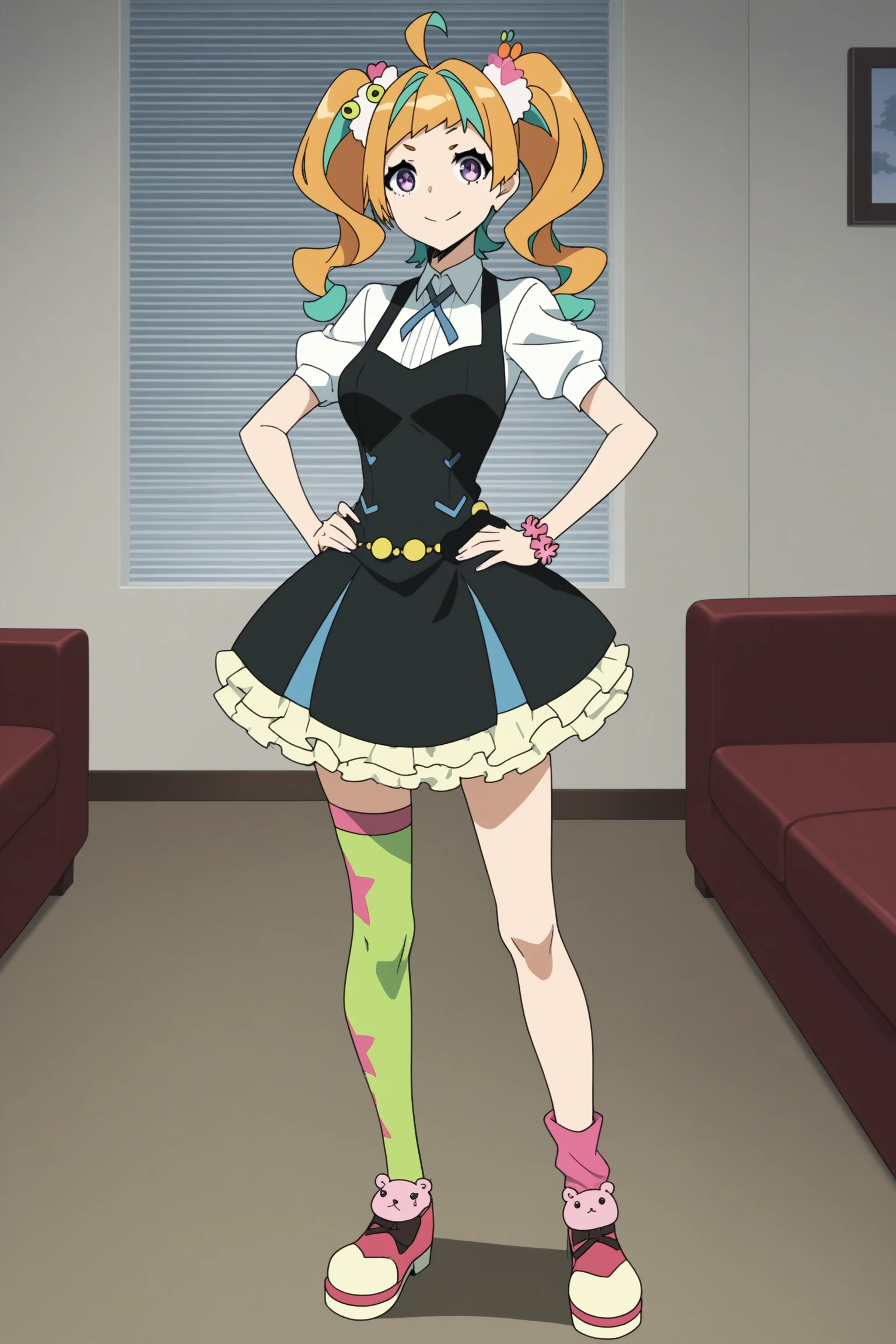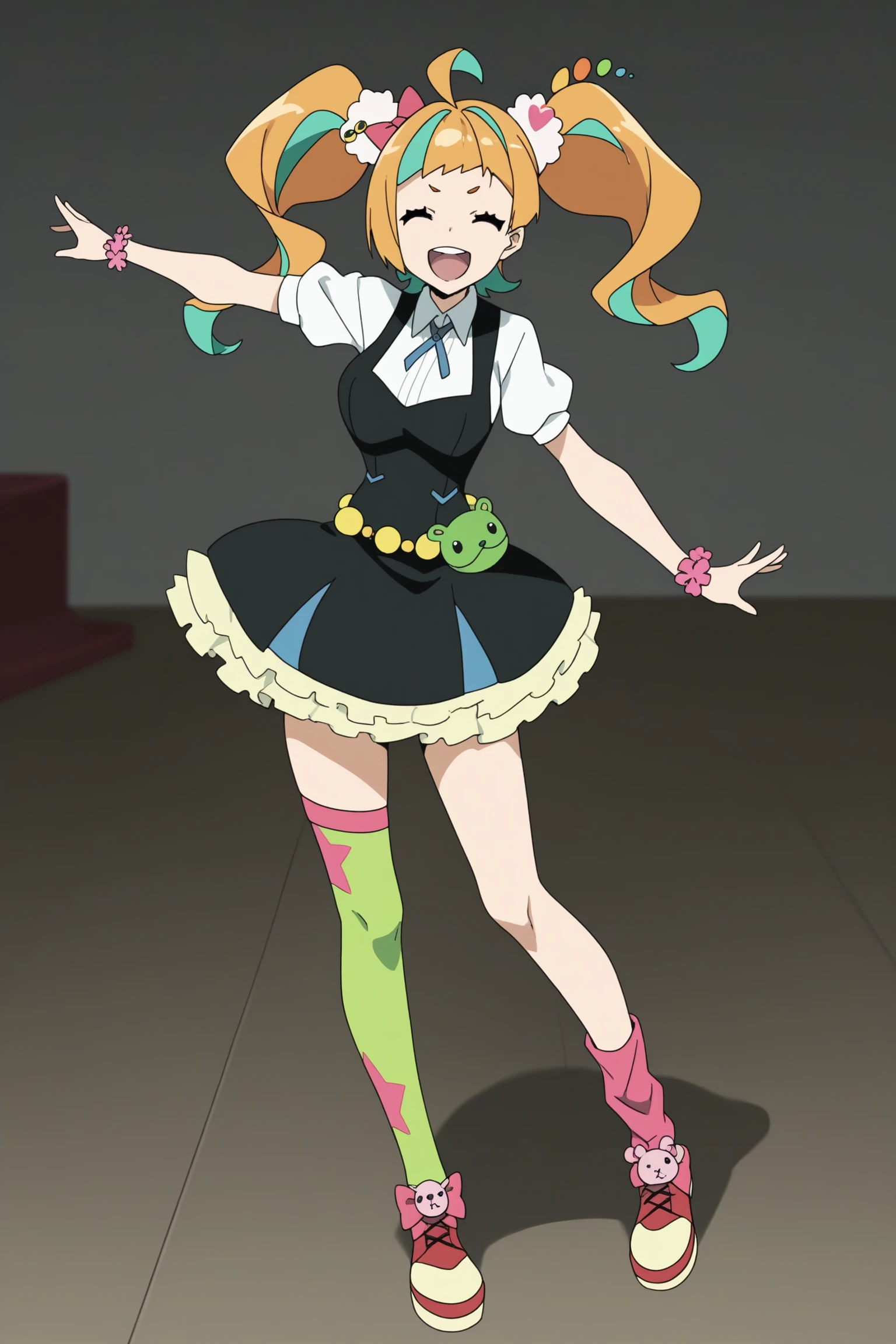 niiyama nico, long hair, multicolored hair, streaked hair, blonde hair, green hair, purple eyes, hair ornaments, hair bow, red bow, ahoge, twintails, puffy short sleeves, flower bracelet, black dress, pinafore dress, frilled dress, sleeveless dress, white shirt, collared shirt, blue neck ribbon, stuffed toy, asymmetrical legwear, uneven legwear, star print thighhigh, single thighhigh, green legwear, pink legwear, bootsNOTE
