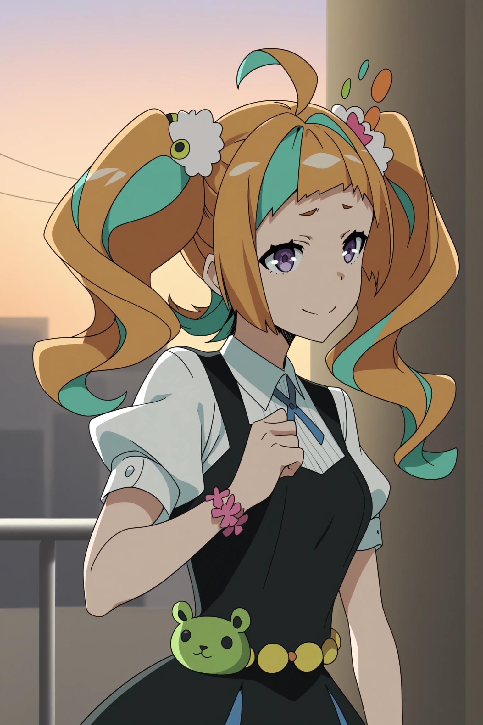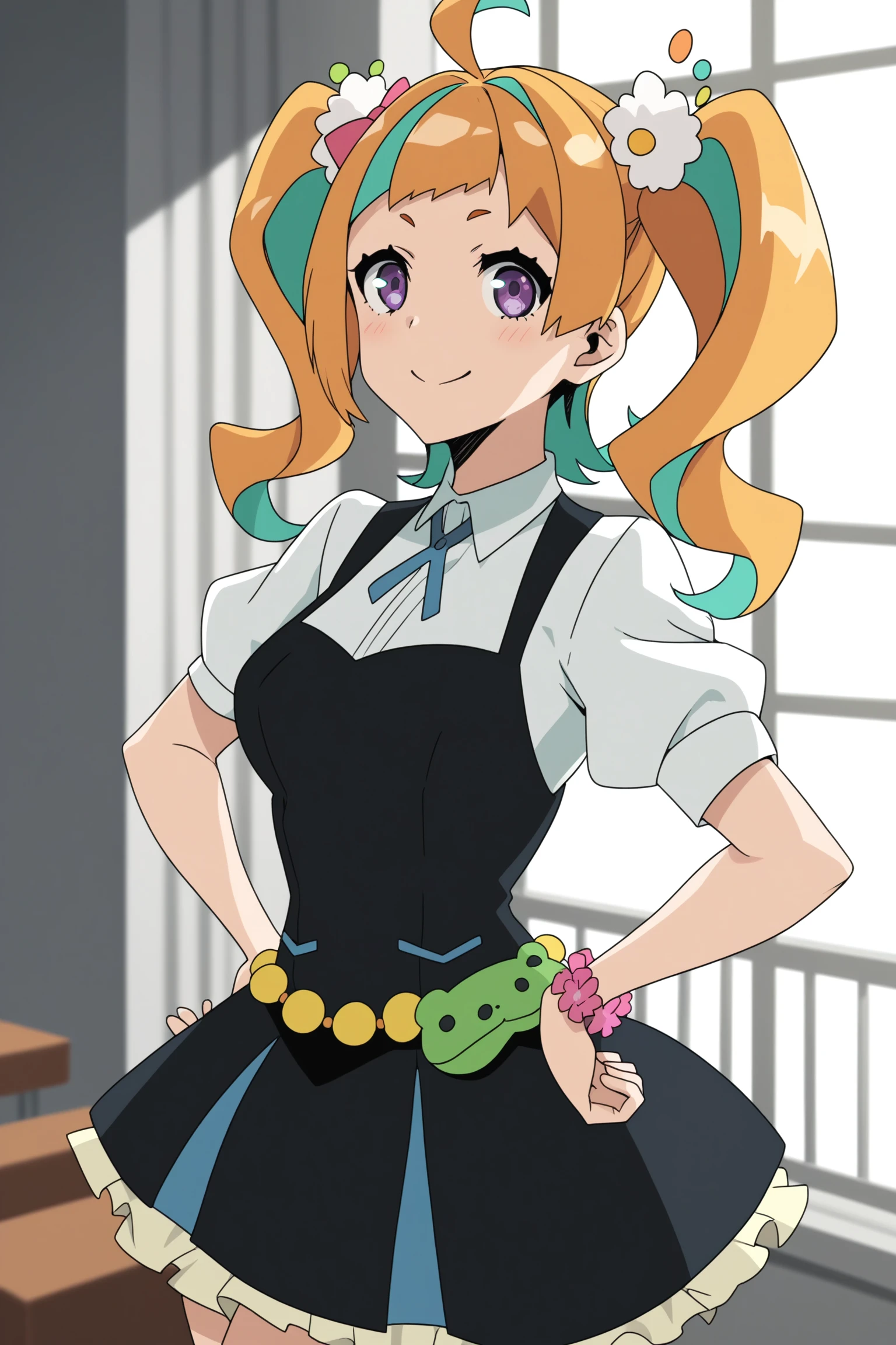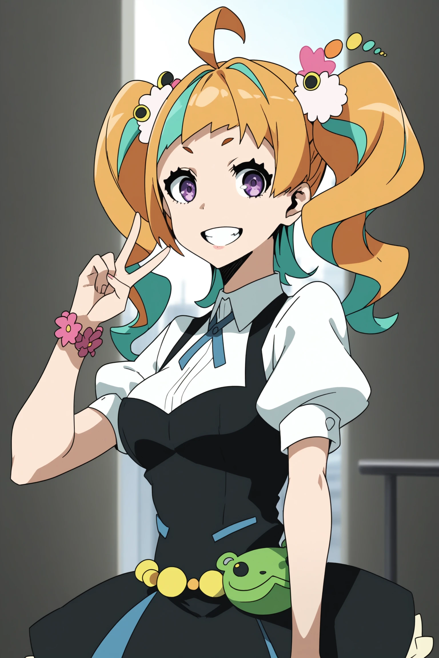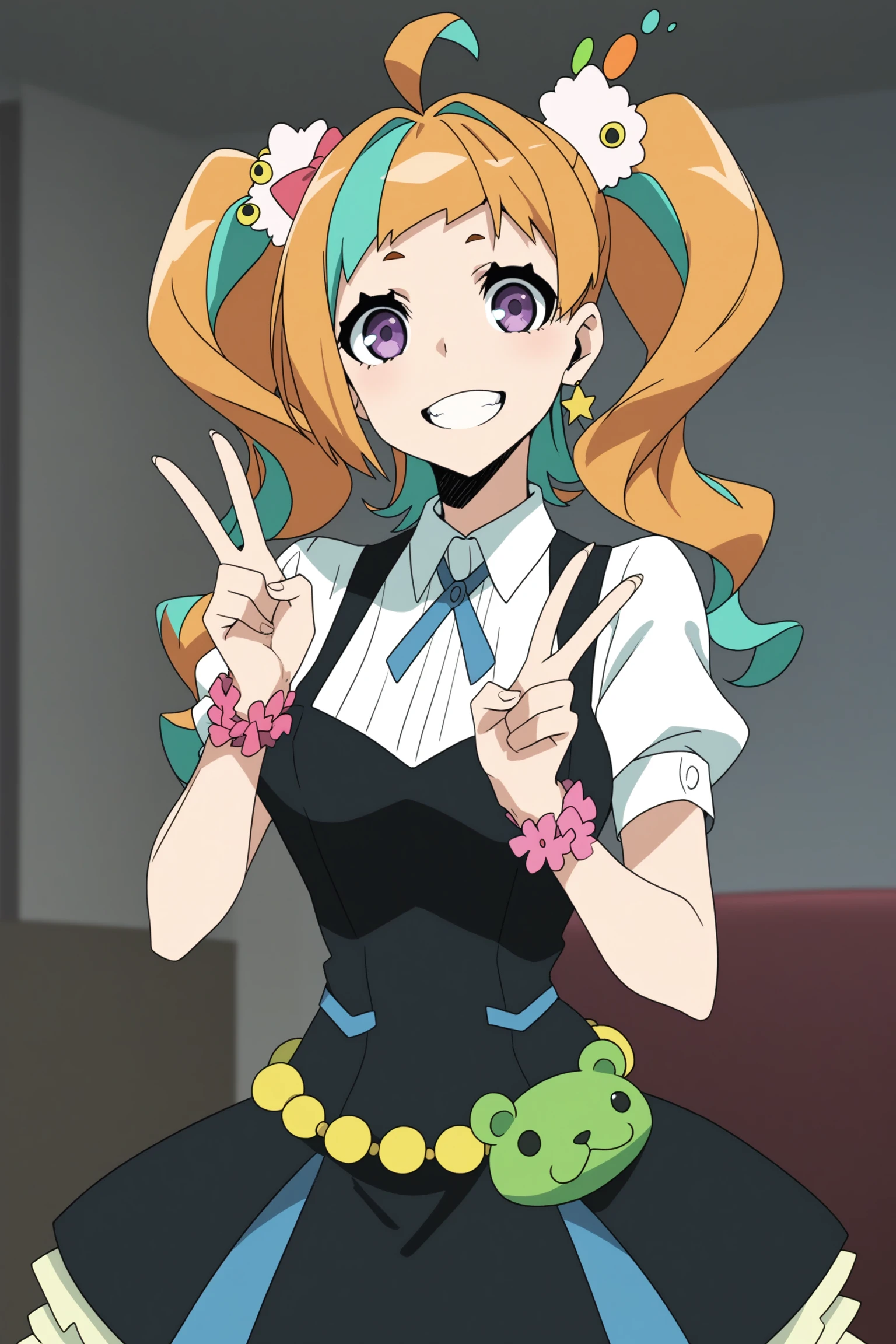 niiyama nico, long hair, multicolored hair, streaked hair, blonde hair, green hair, purple eyes, hair ornaments, hair bow, red bow, ahoge, twintails, puffy short sleeves, flower bracelet, black dress, pinafore dress, frilled dress, sleeveless dress, white shirt, collared shirt, blue neck ribbon, stuffed toy, asymmetrical legwear, uneven legwear, star print thighhigh, single thighhigh, green legwear, pink legwear, bootsNOTE