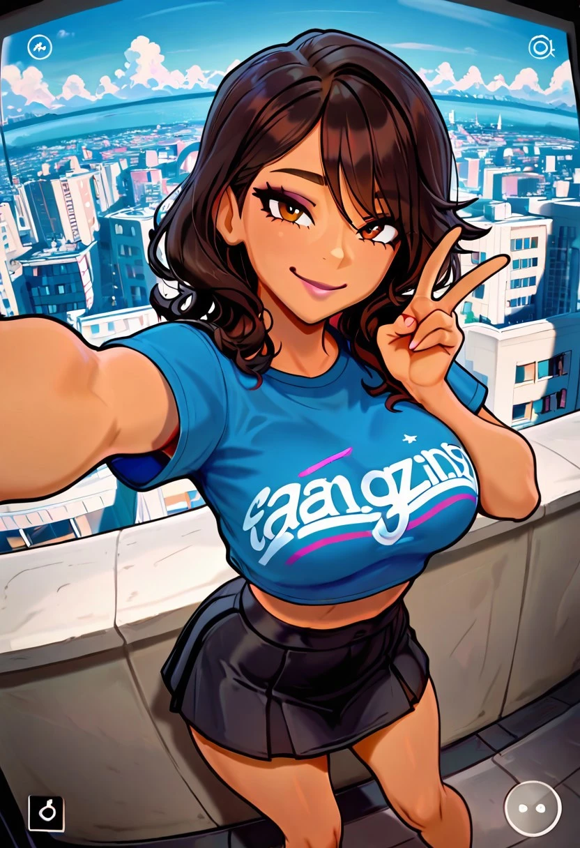 neekolul, 1girl,, brown hair, dark skin, makeup, eyeliner, blue crop top, black miniskirt