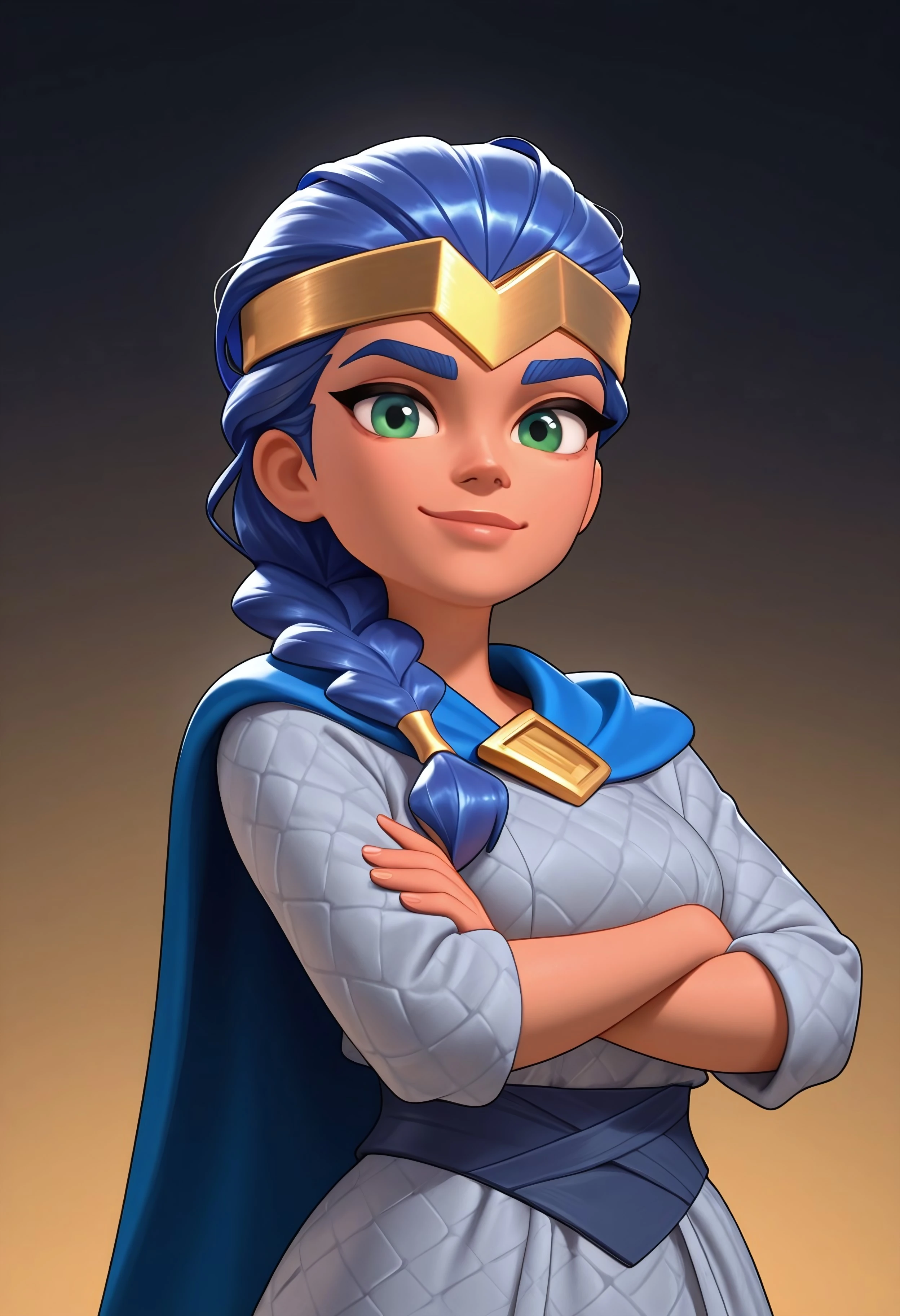 golden tiara, blue cape, grey dress
