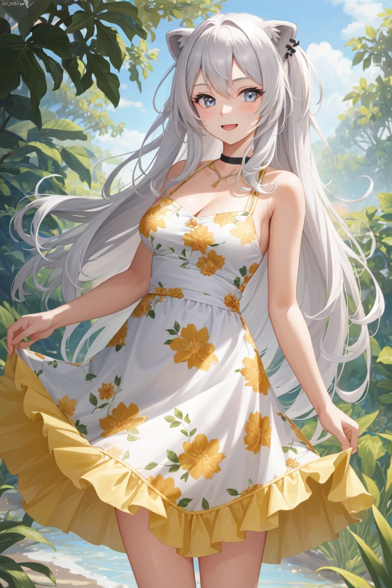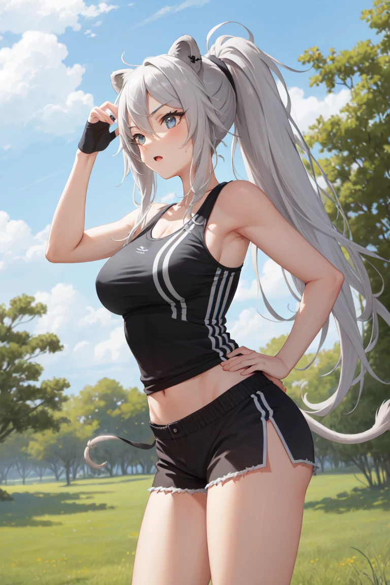 Botan, BotanSuit, grey hair, long hair, black sports bra, navel, midriff, cleavage, bare shoulders, pantyhose, dog tags