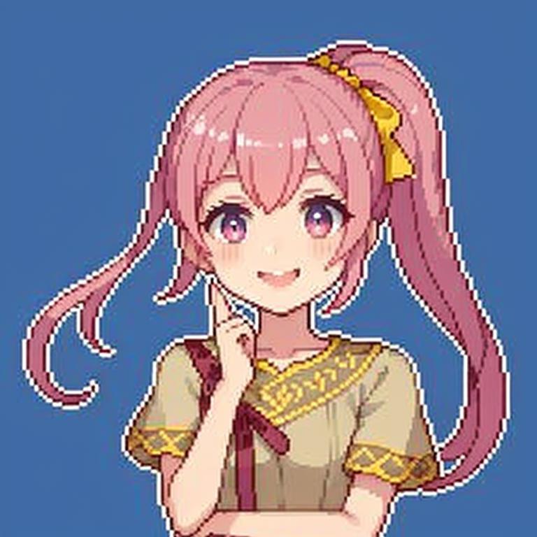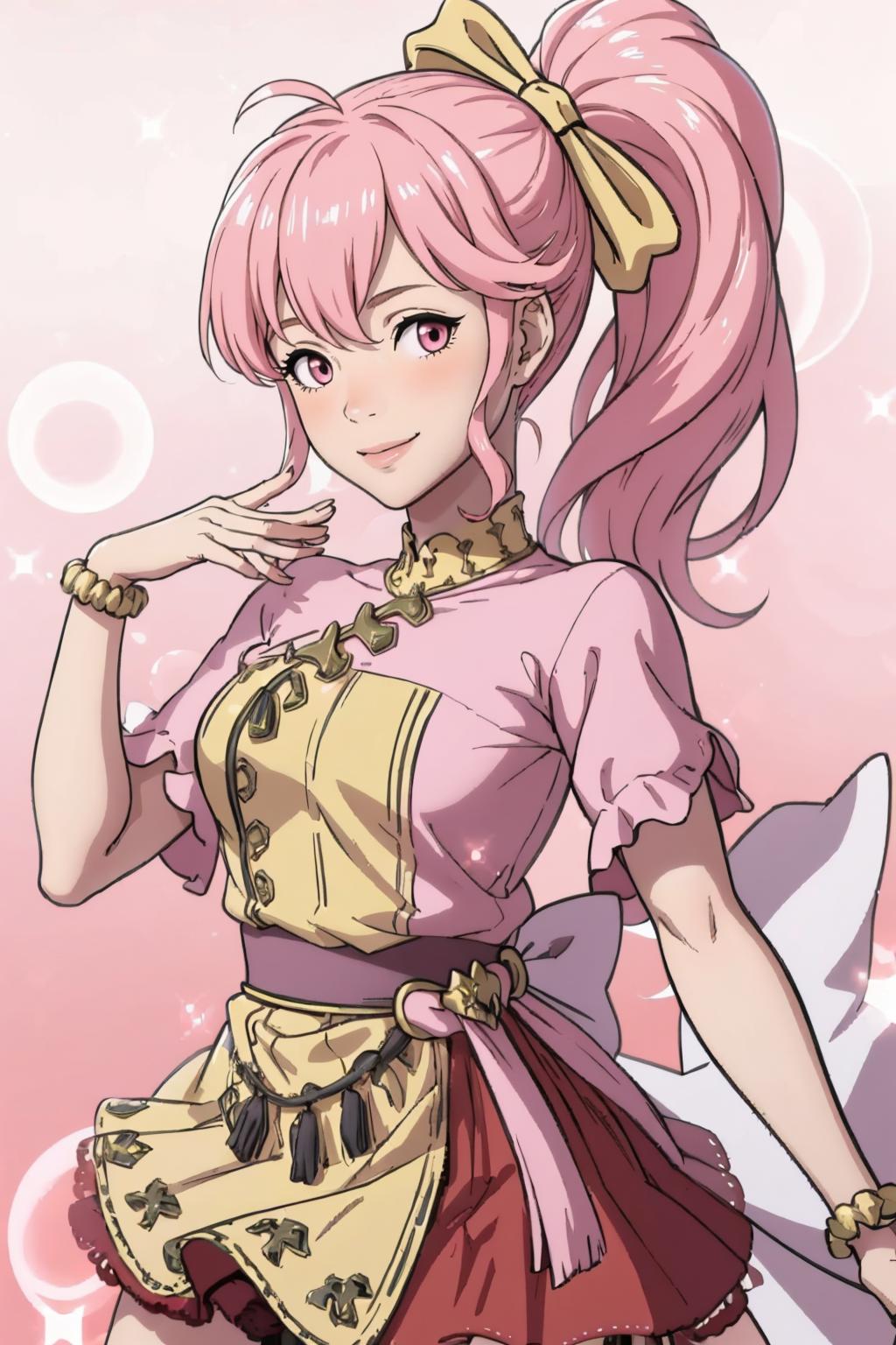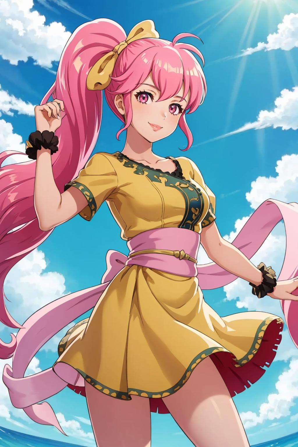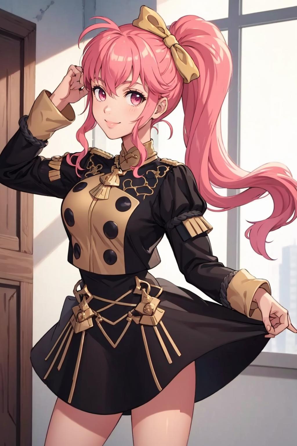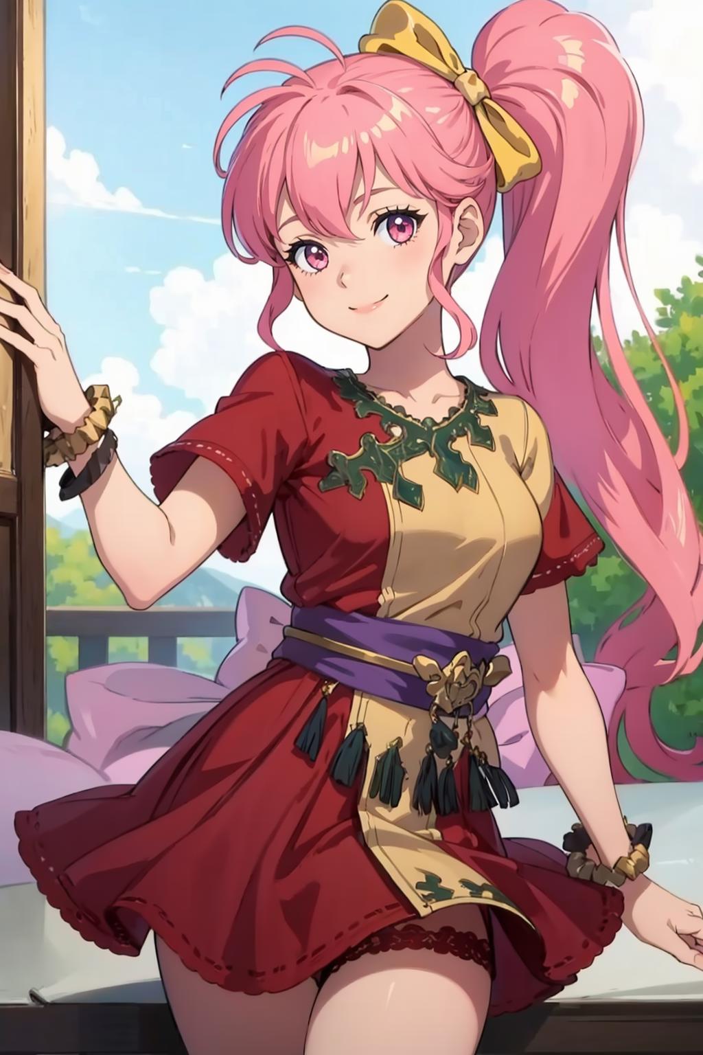 For her default outfit its "ponytail, dress, hair bow, ribbon"