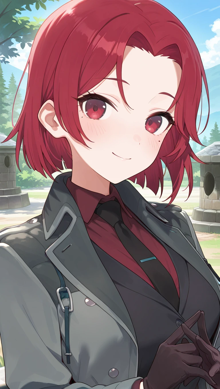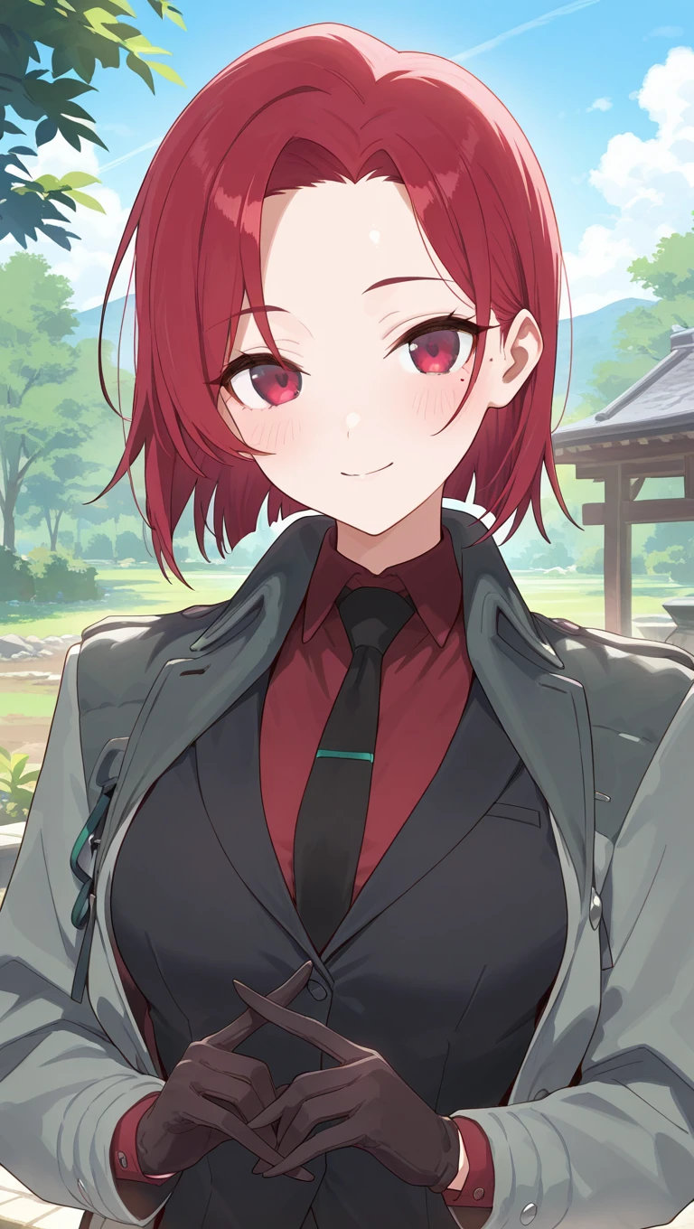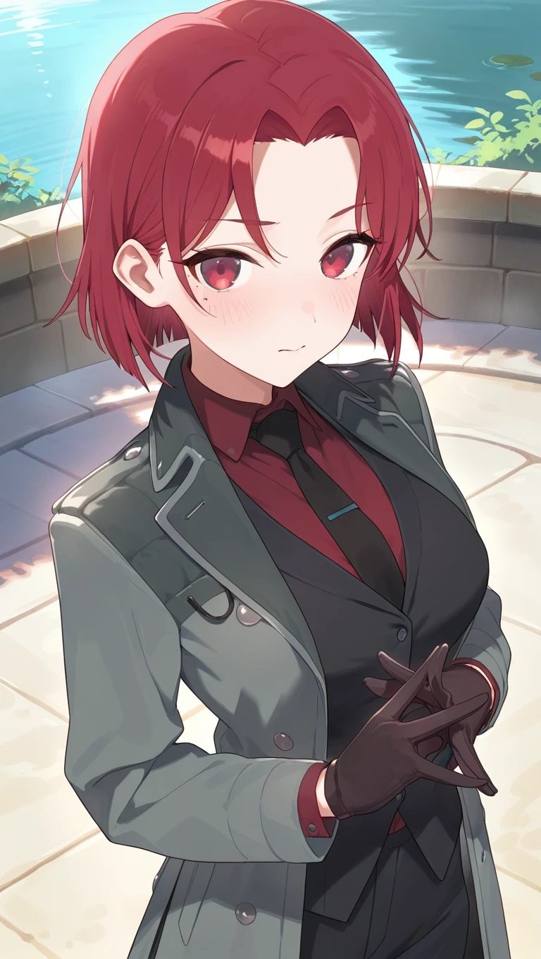 grey coat,open coat,black suit,black vest,red shirt,collared shirt,black necktie,long sleeves,black gloves,medium breasts,skindentation,black pants,leather footwear