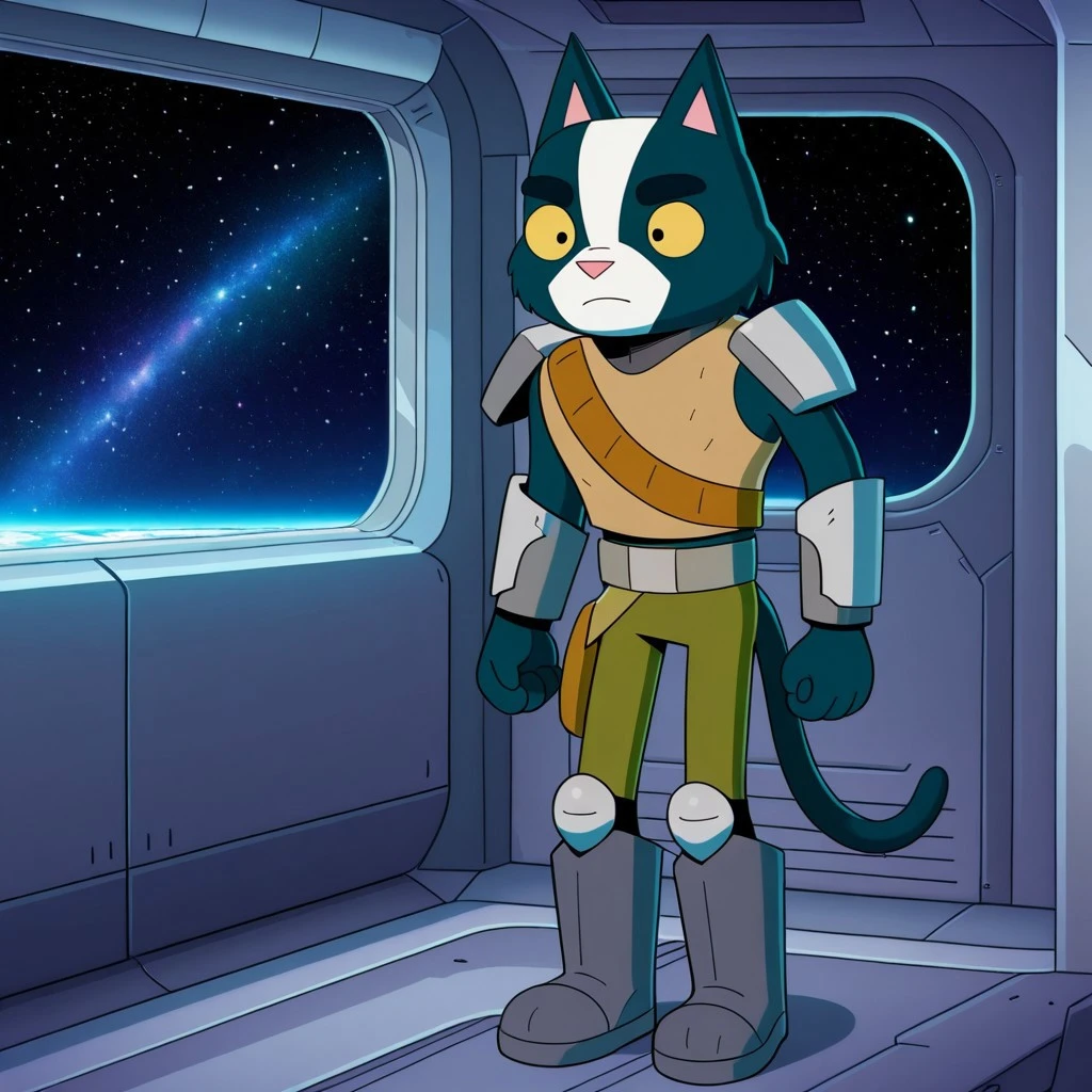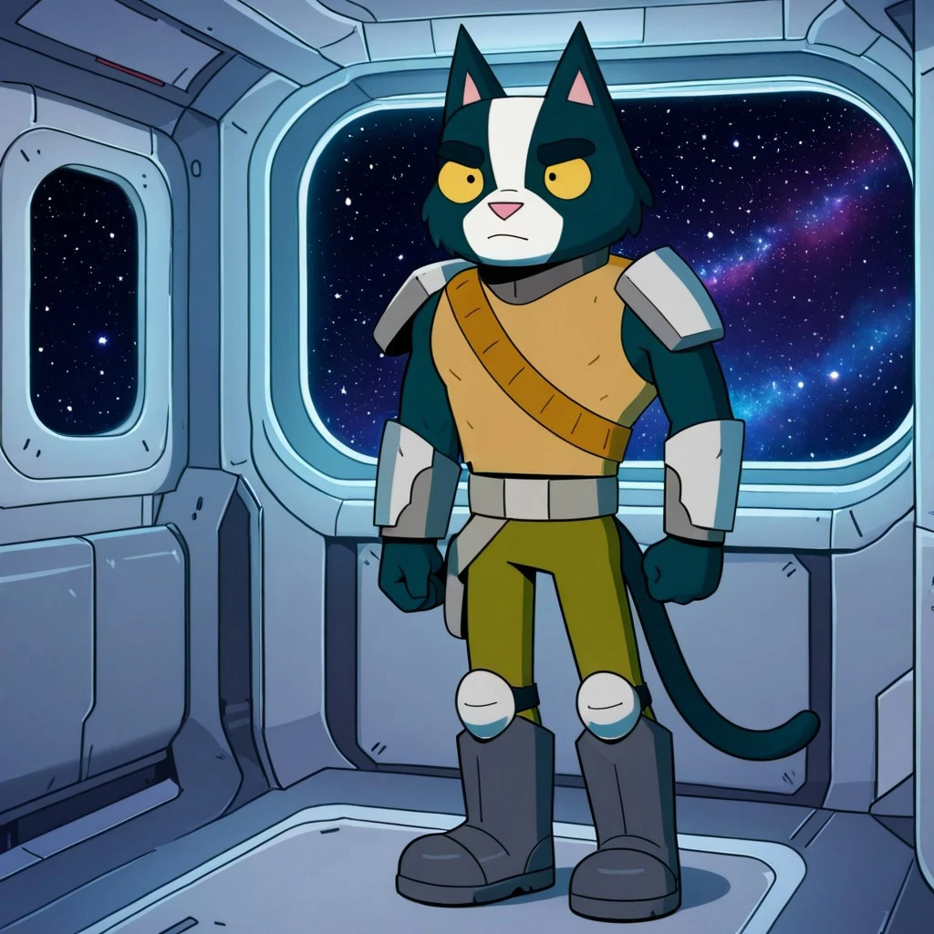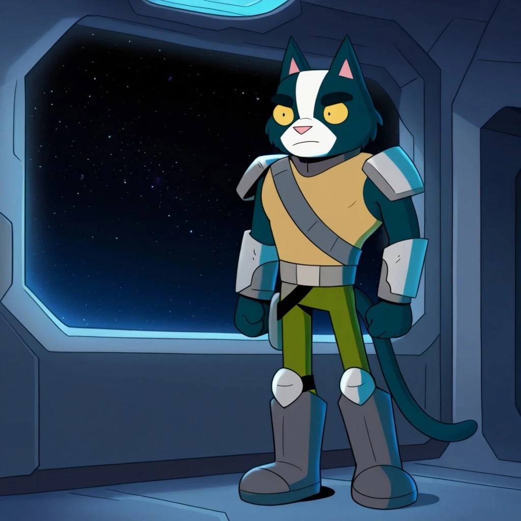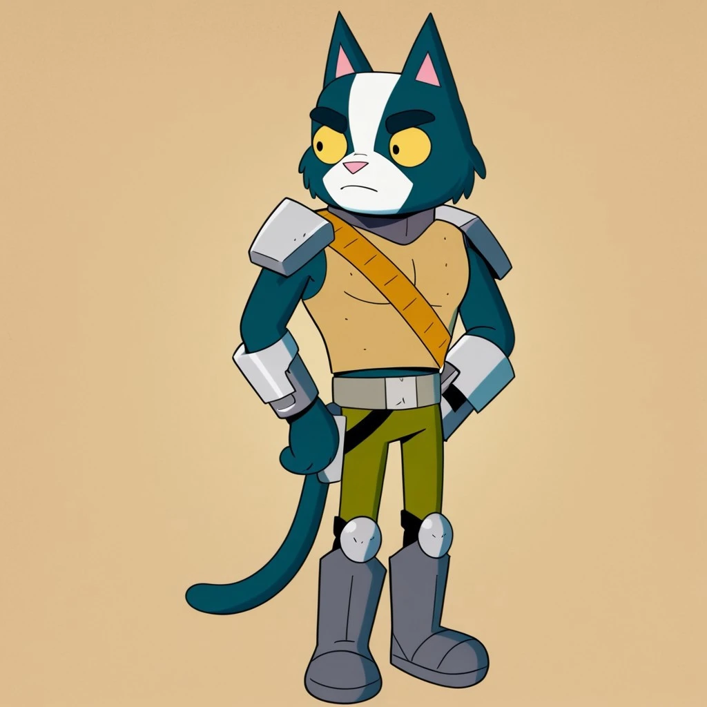 Avocato, furry male, solo, cat, thick eyebrows, pink nose, yellow sclera, black eyes, dark teal fur, white facial markings, tail, boots, grey belt with a silver buckle, greenish leggings, tan vest, pair of the shoulder and knee pads, brown utility sash, arm bracers. sleeveless