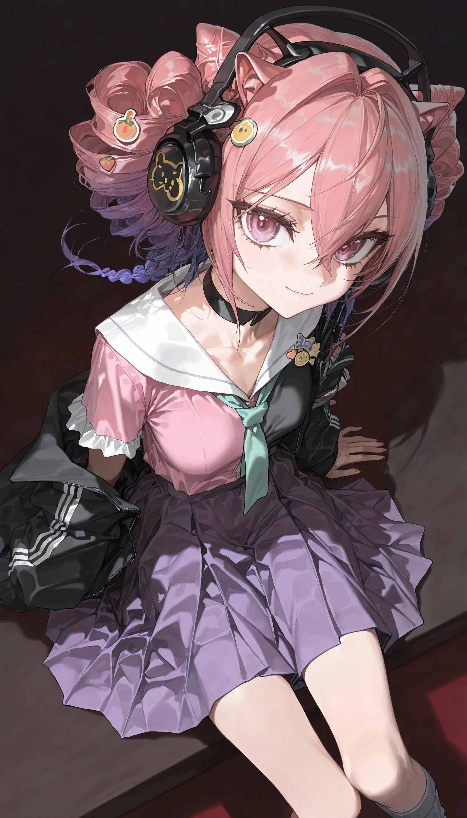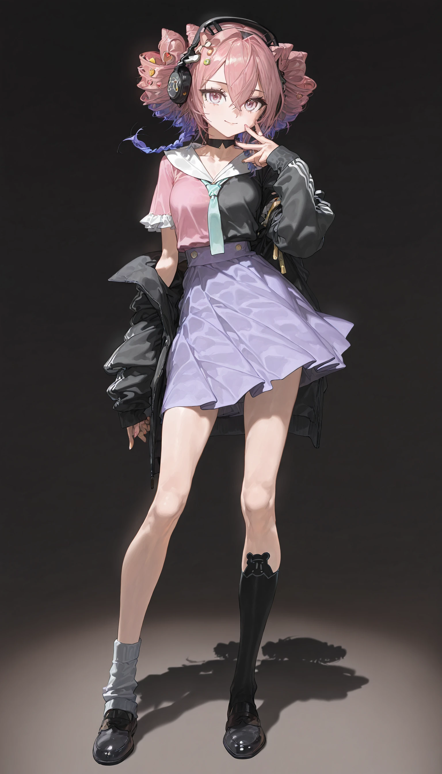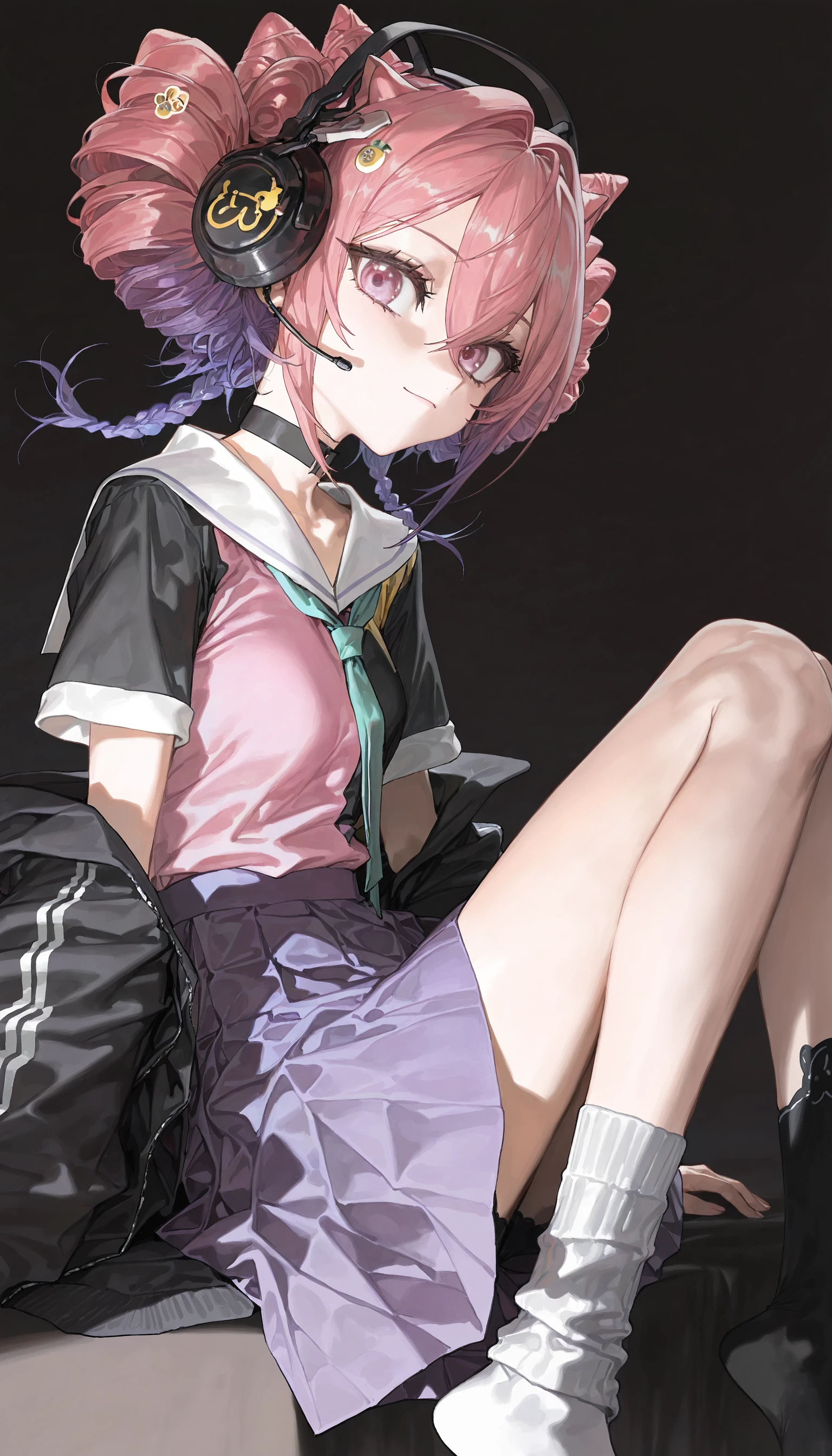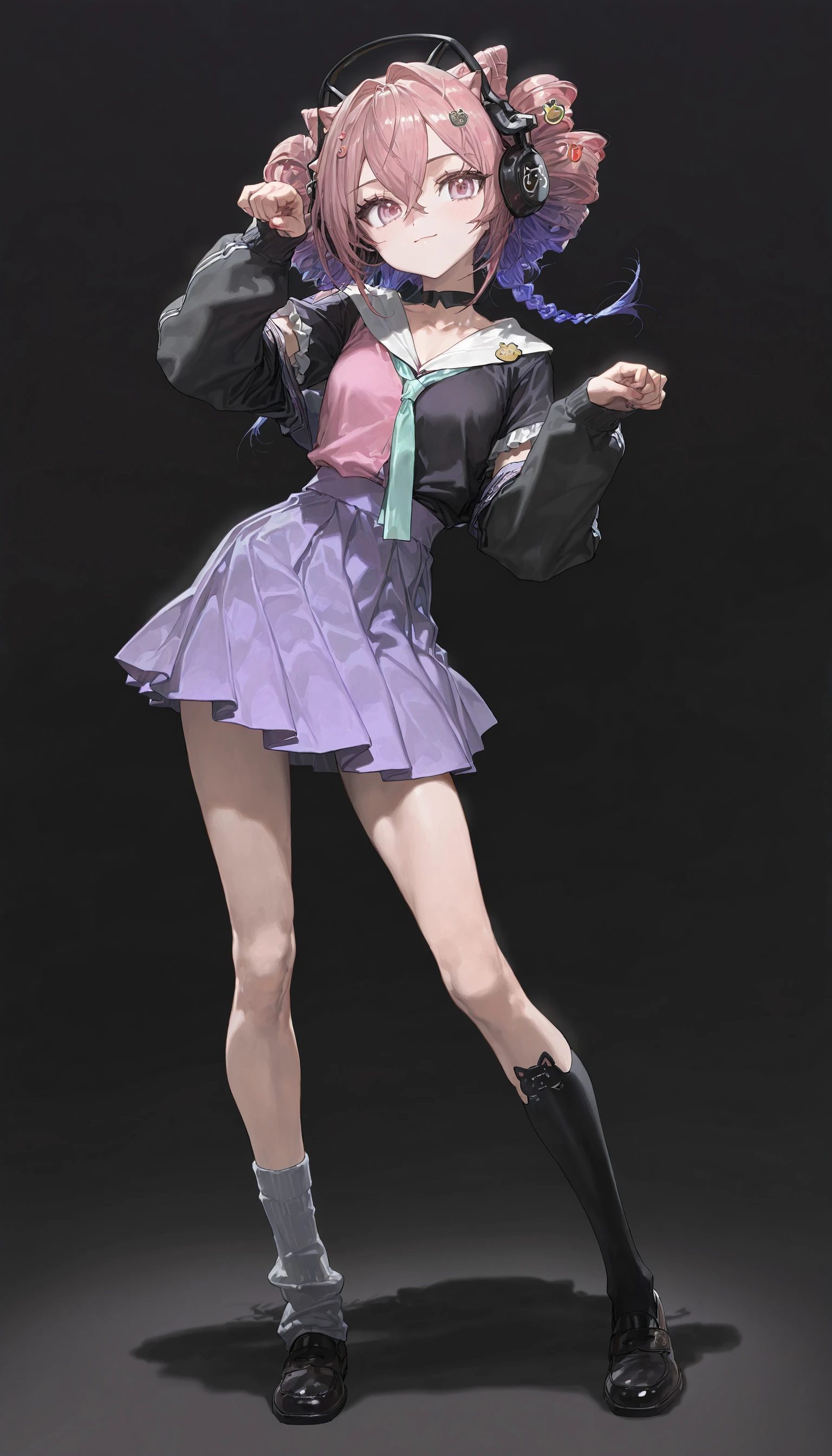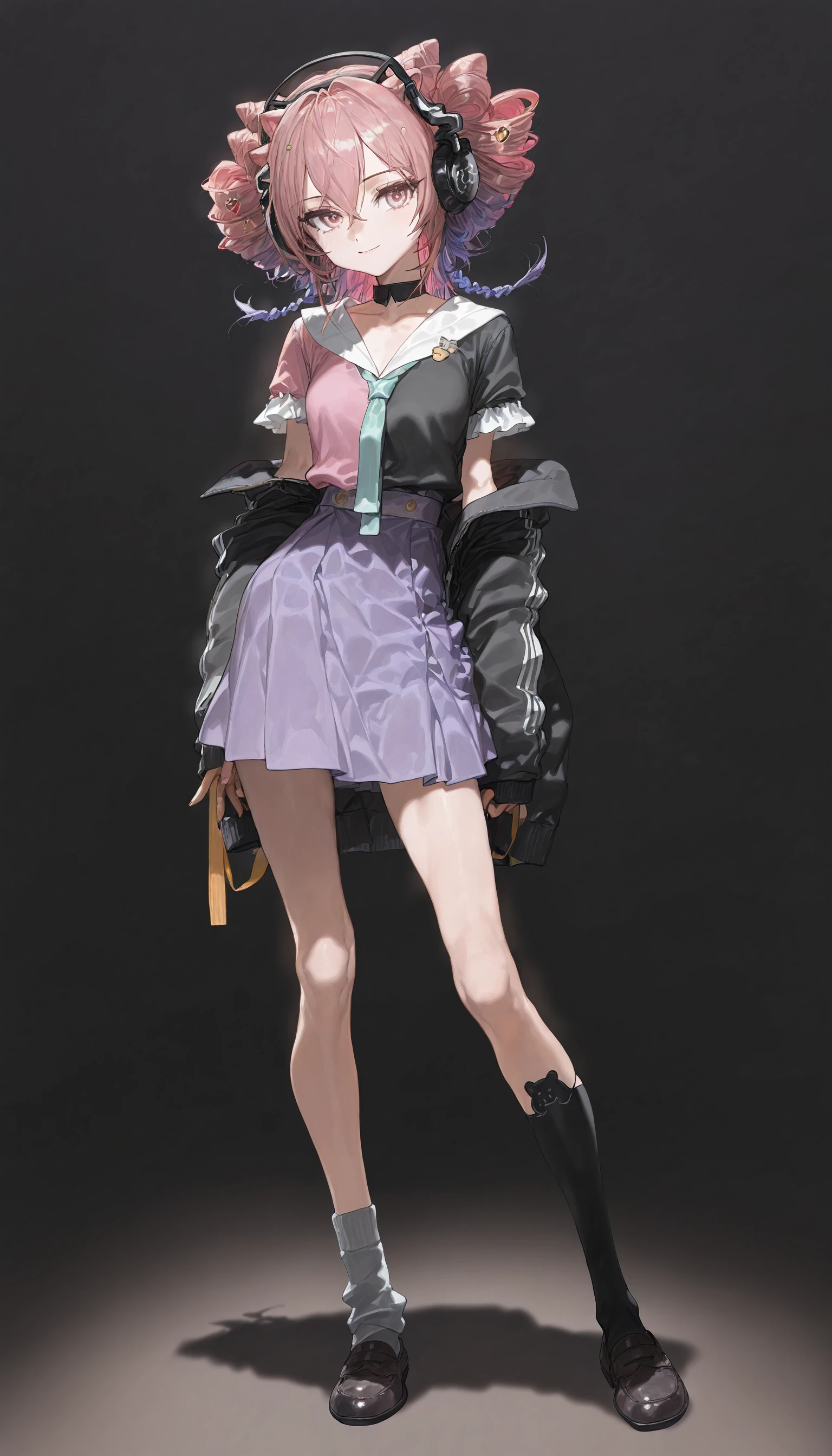 headphones,black choker ,necktie ,purple skirt,asymmetrical legwear ,