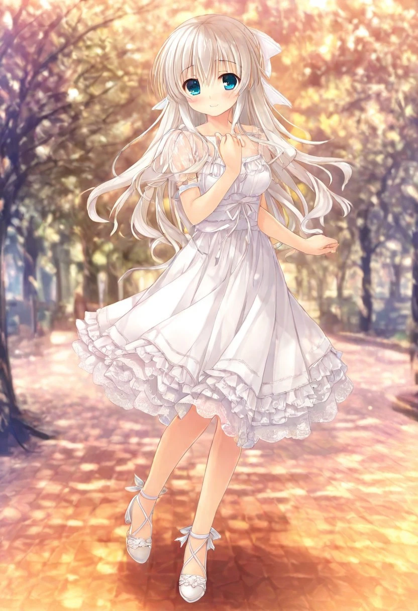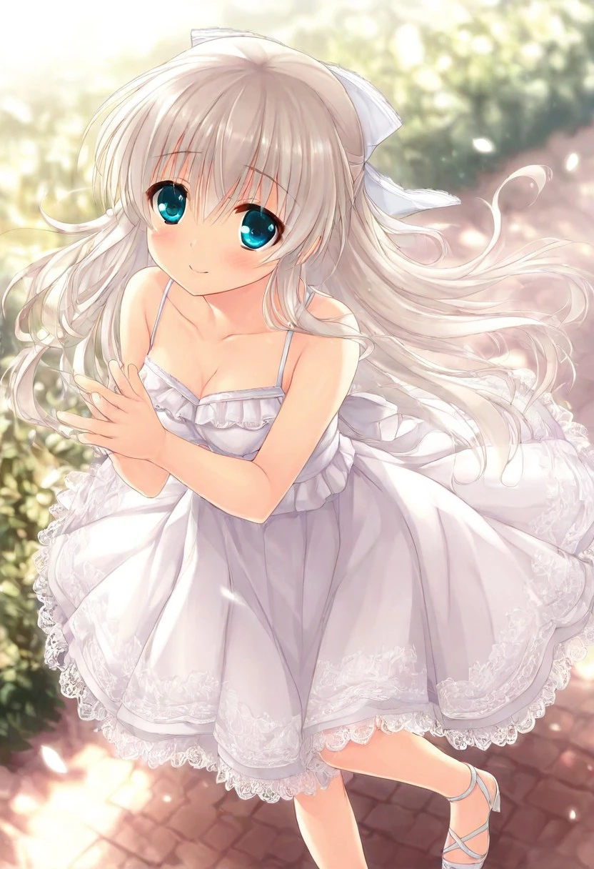 white hair, long hair, bangs, half updo, white hair bow, blue-green eye,
