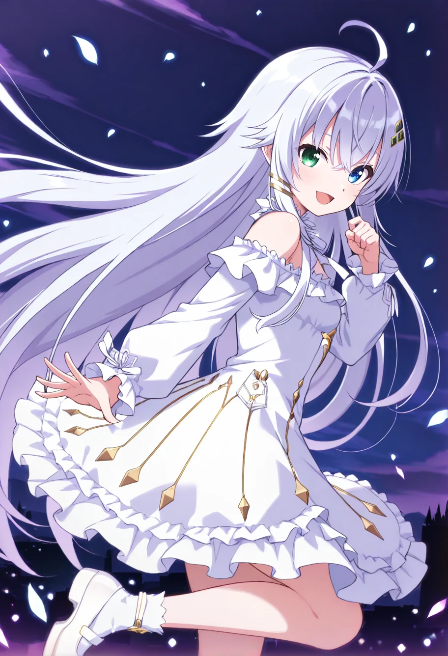 yuricia-default,blue eye,green eye,heterochromia,white hair,very long hair,ahoge,hair ornament,white dress,frilled dress, shoulder cutout,smile,white socks,white footwear,mary janes