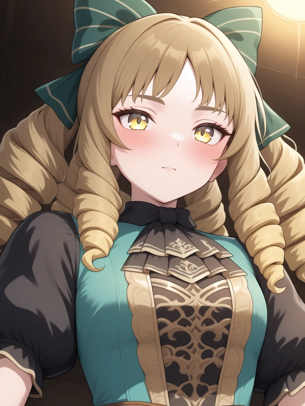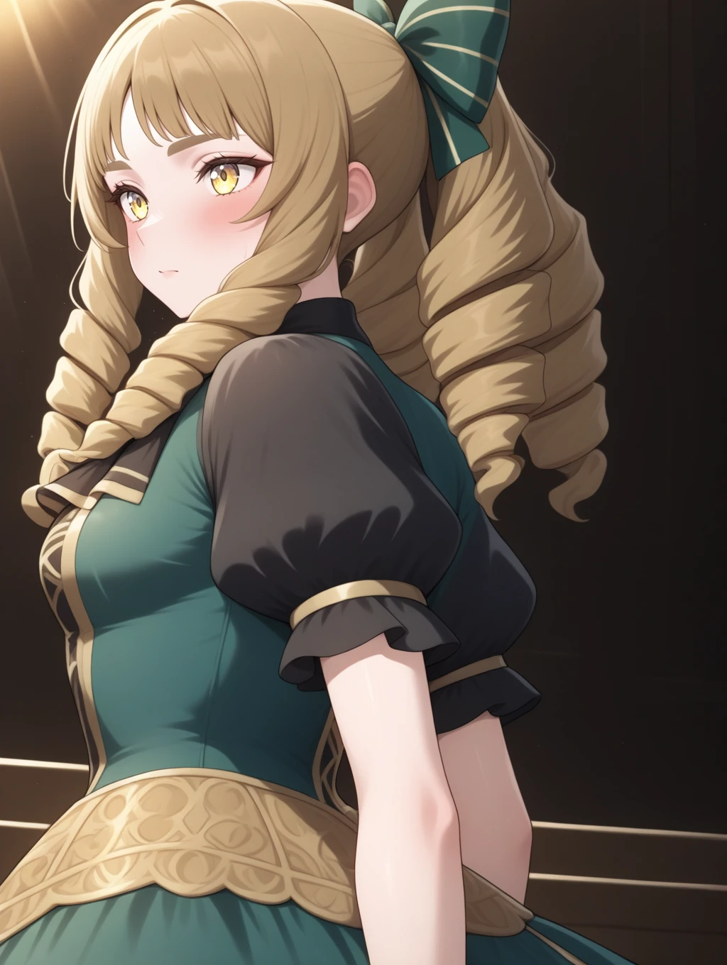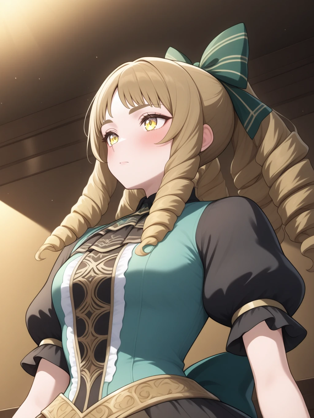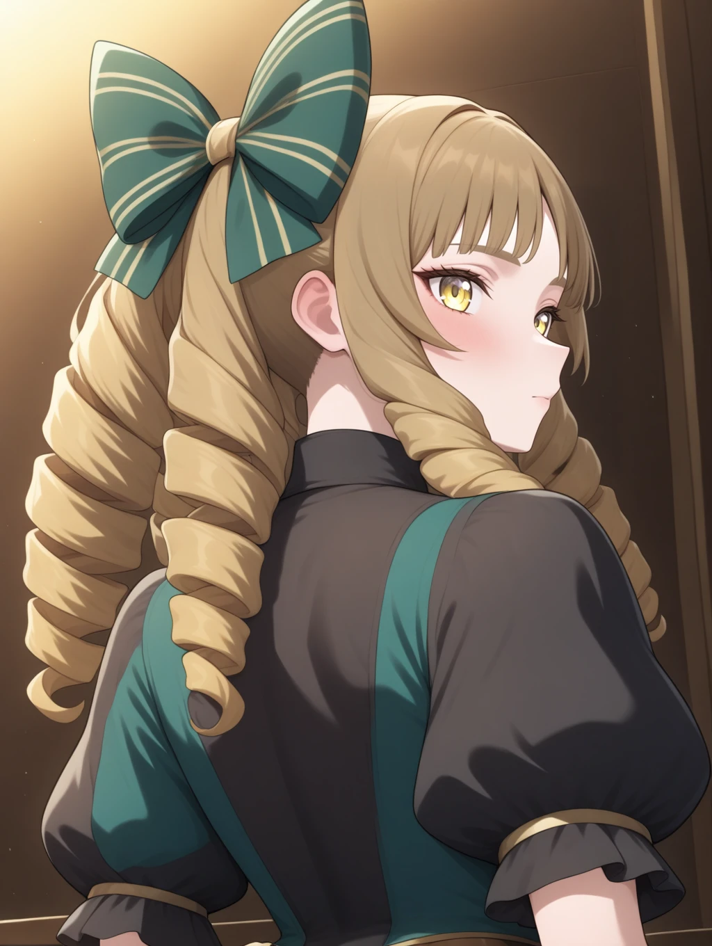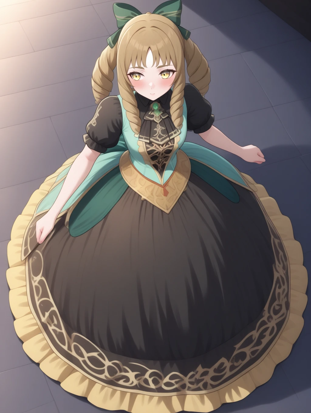 prompt example :SO6pafiy,blonde hair,brown hair,hair ribbon,yellow eyes,drill hair,solo,black puffy short sleeves,black dress,green dress,