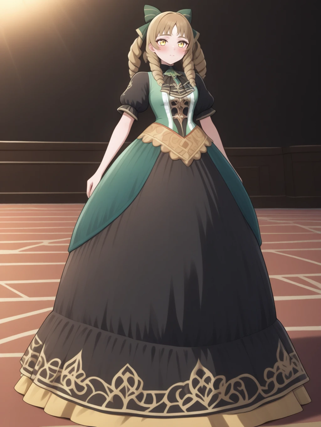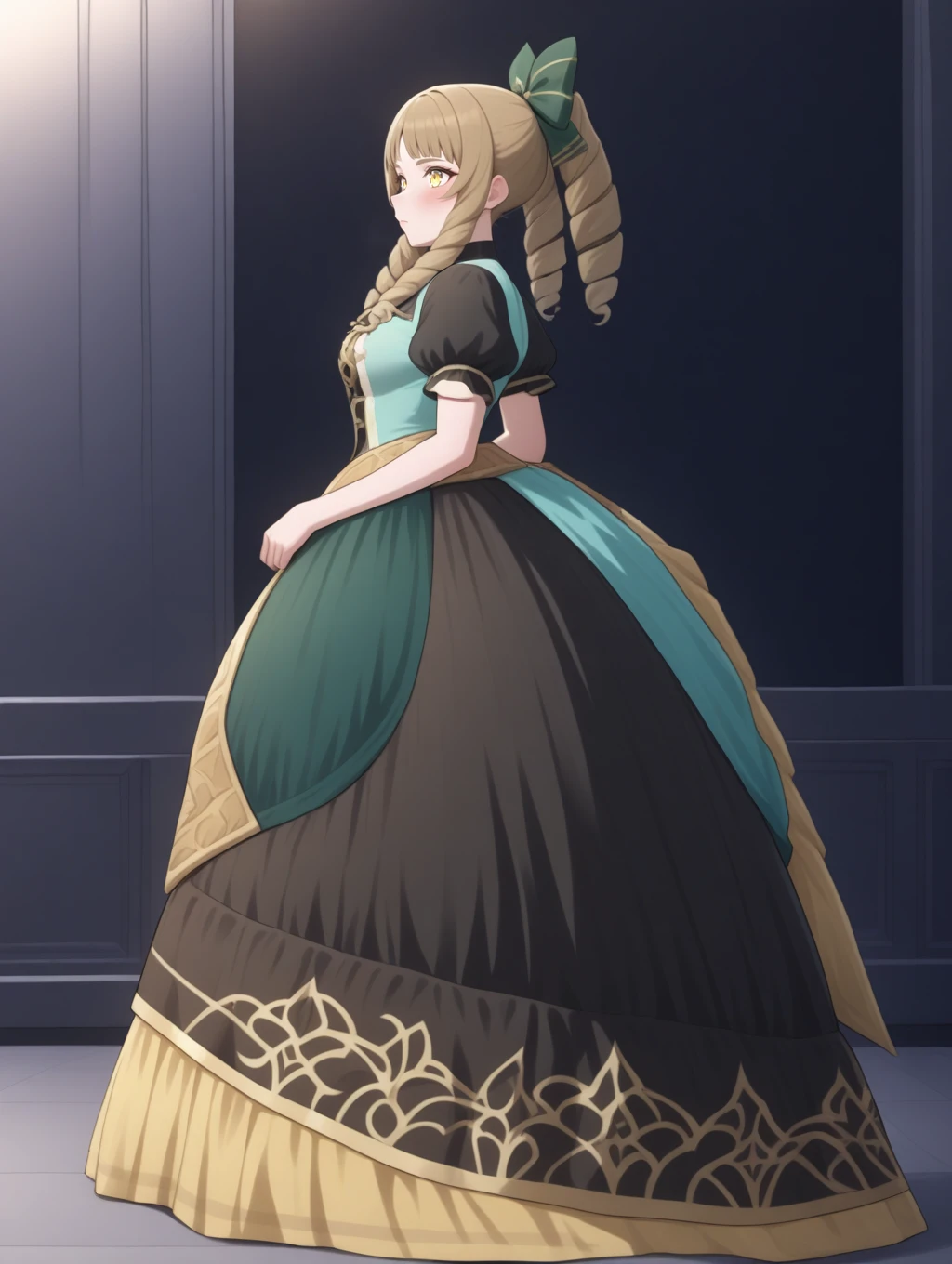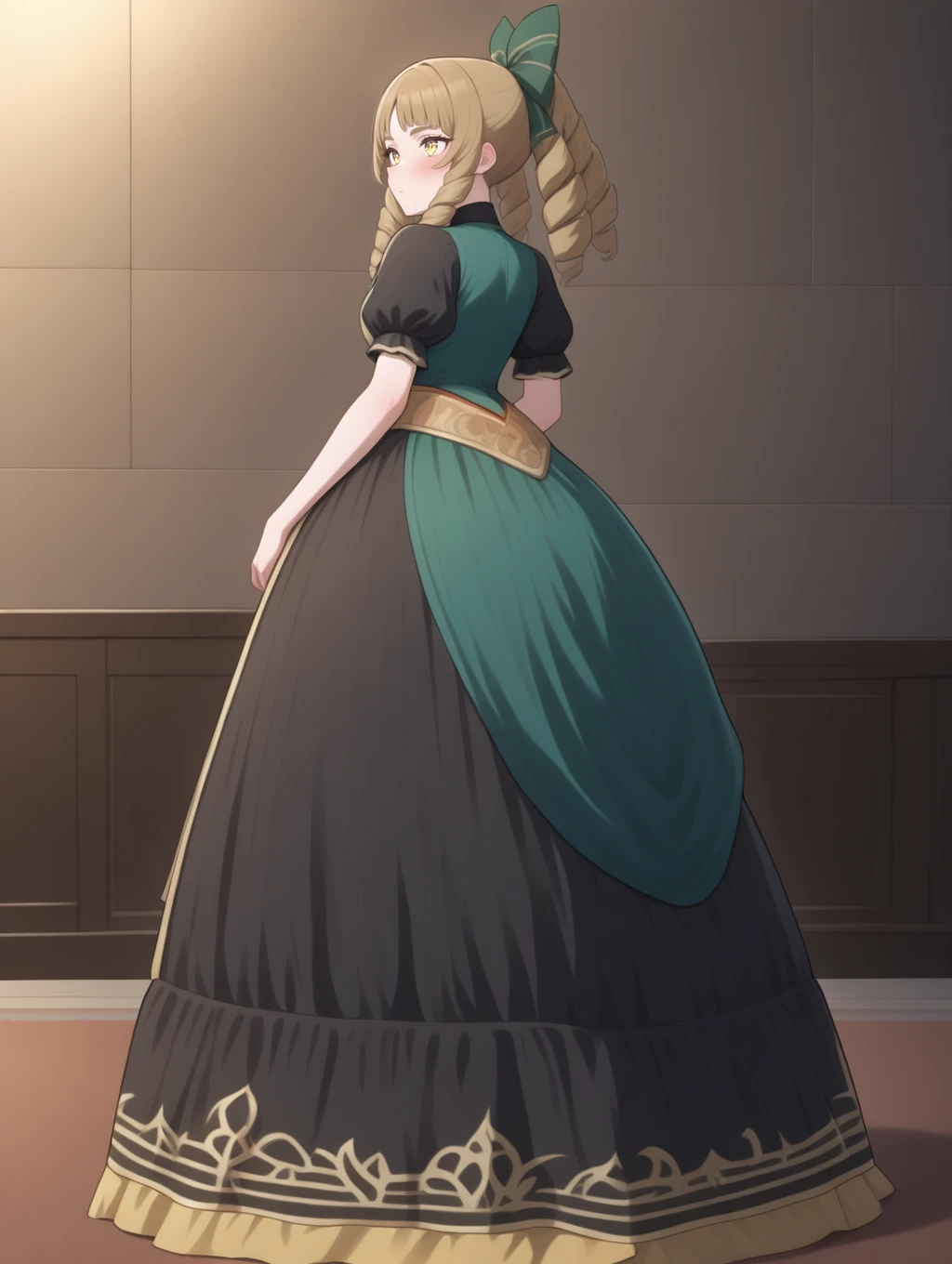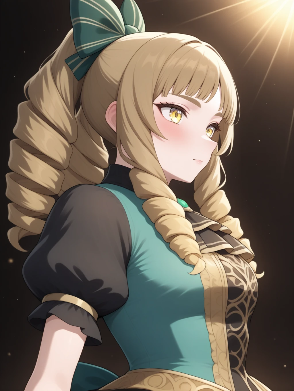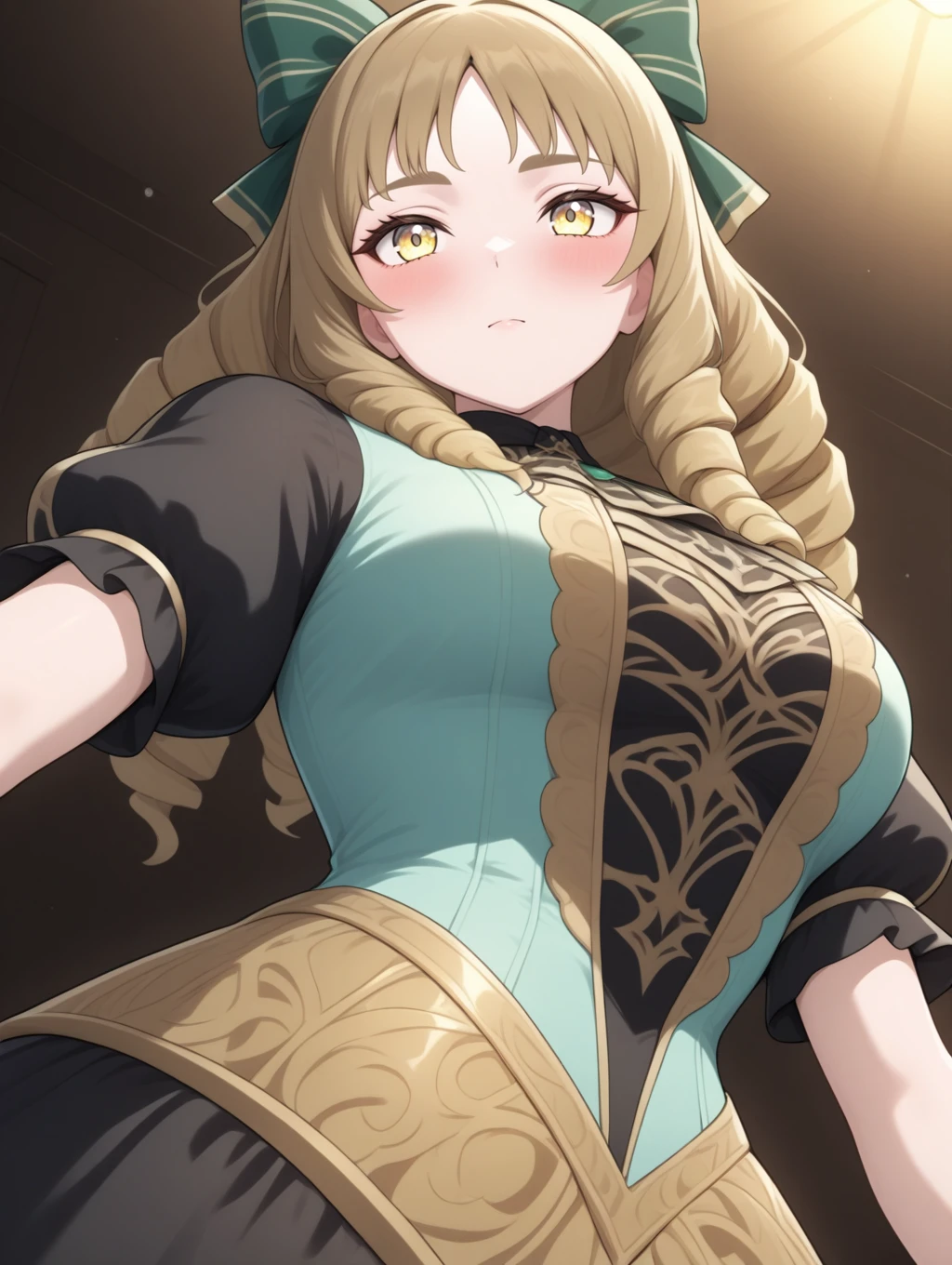 prompt example :SO6pafiy,blonde hair,brown hair,hair ribbon,yellow eyes,drill hair,solo,black puffy short sleeves,black dress,green dress,