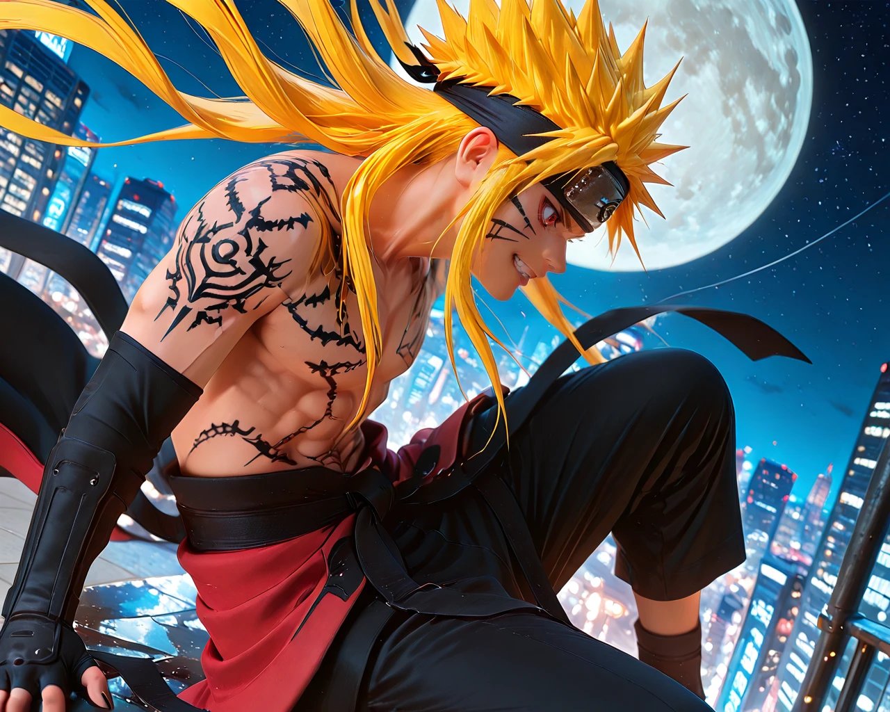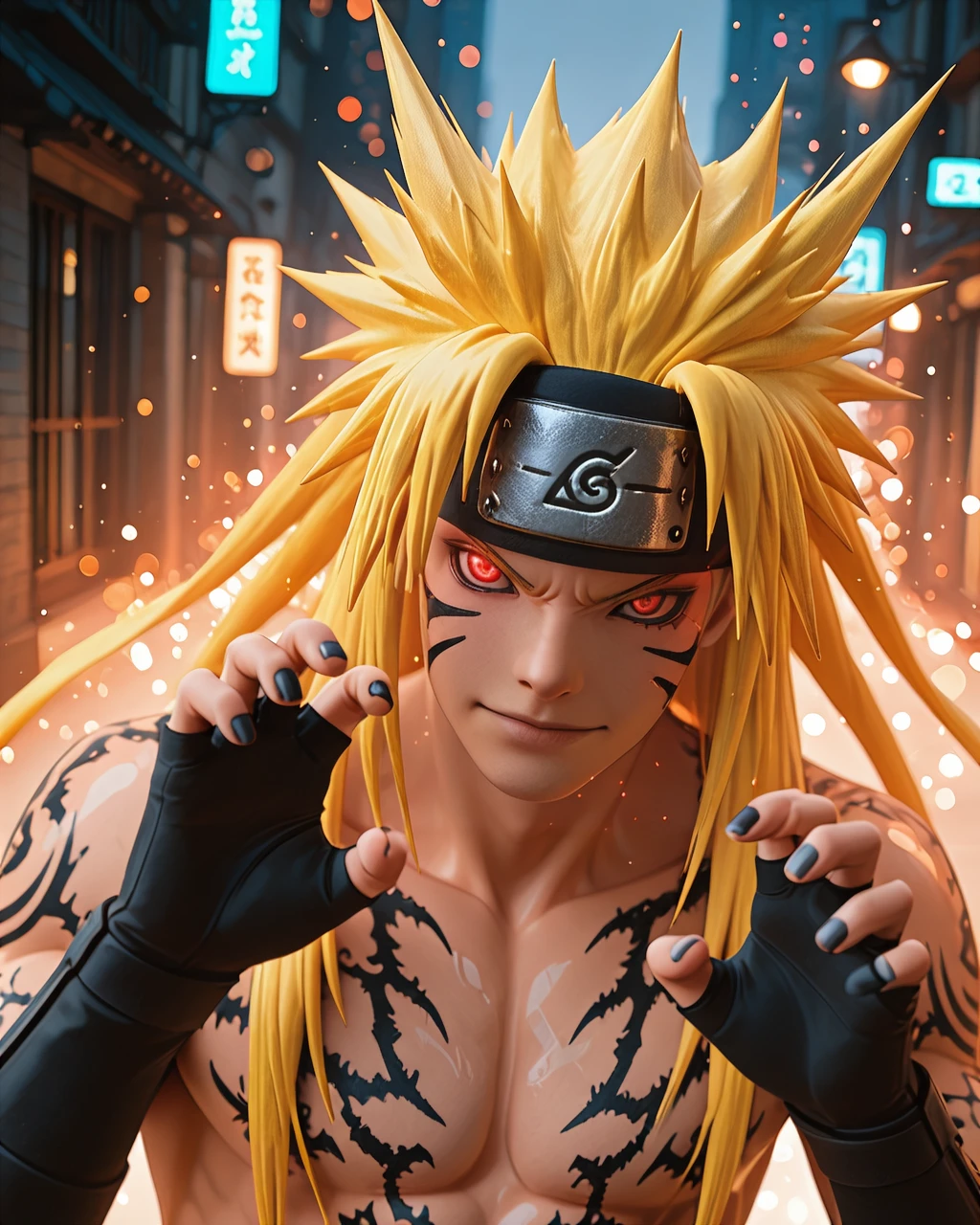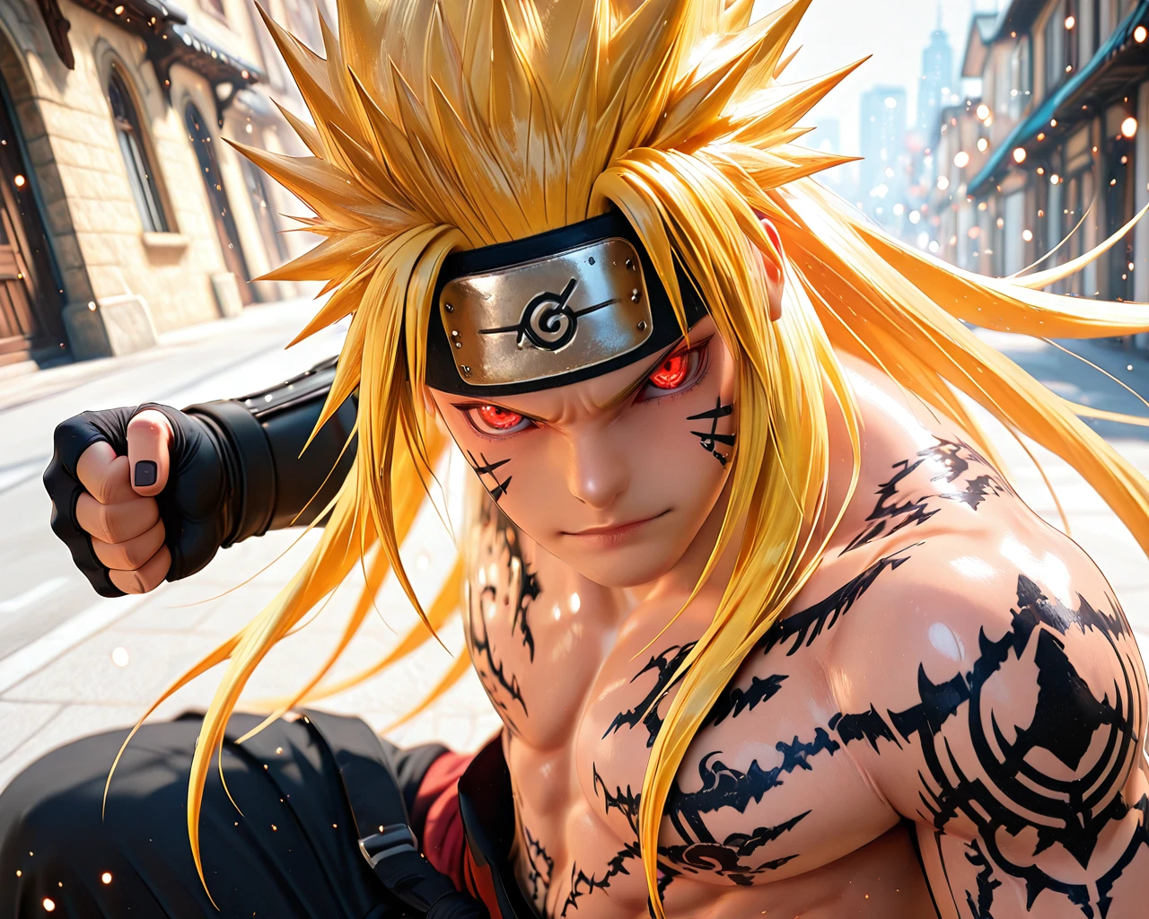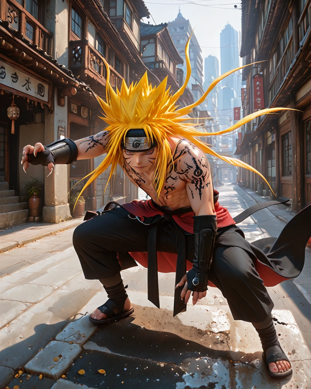 blonde hair, long hair, spiky hair, claws, red eyes, tattoos all over the body, facial mark, forehead protector, black arm guard, black red kimono with belt, black pants, sandals,