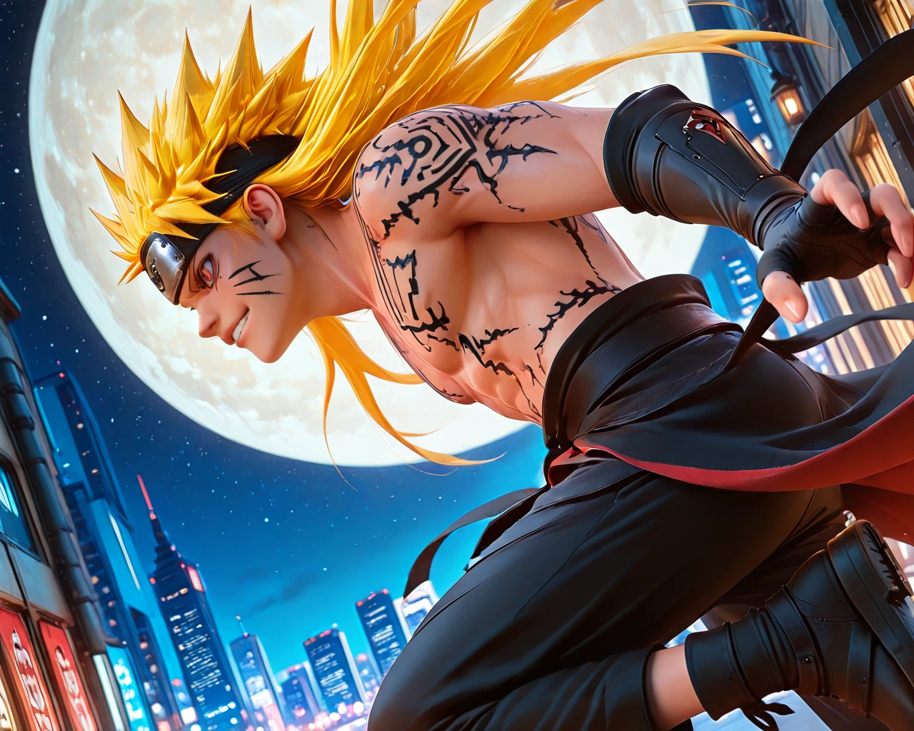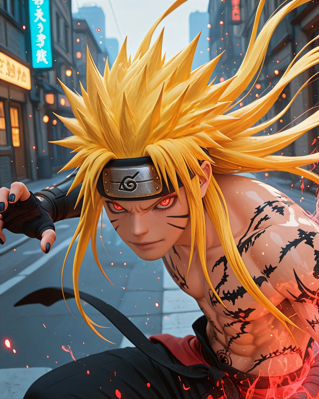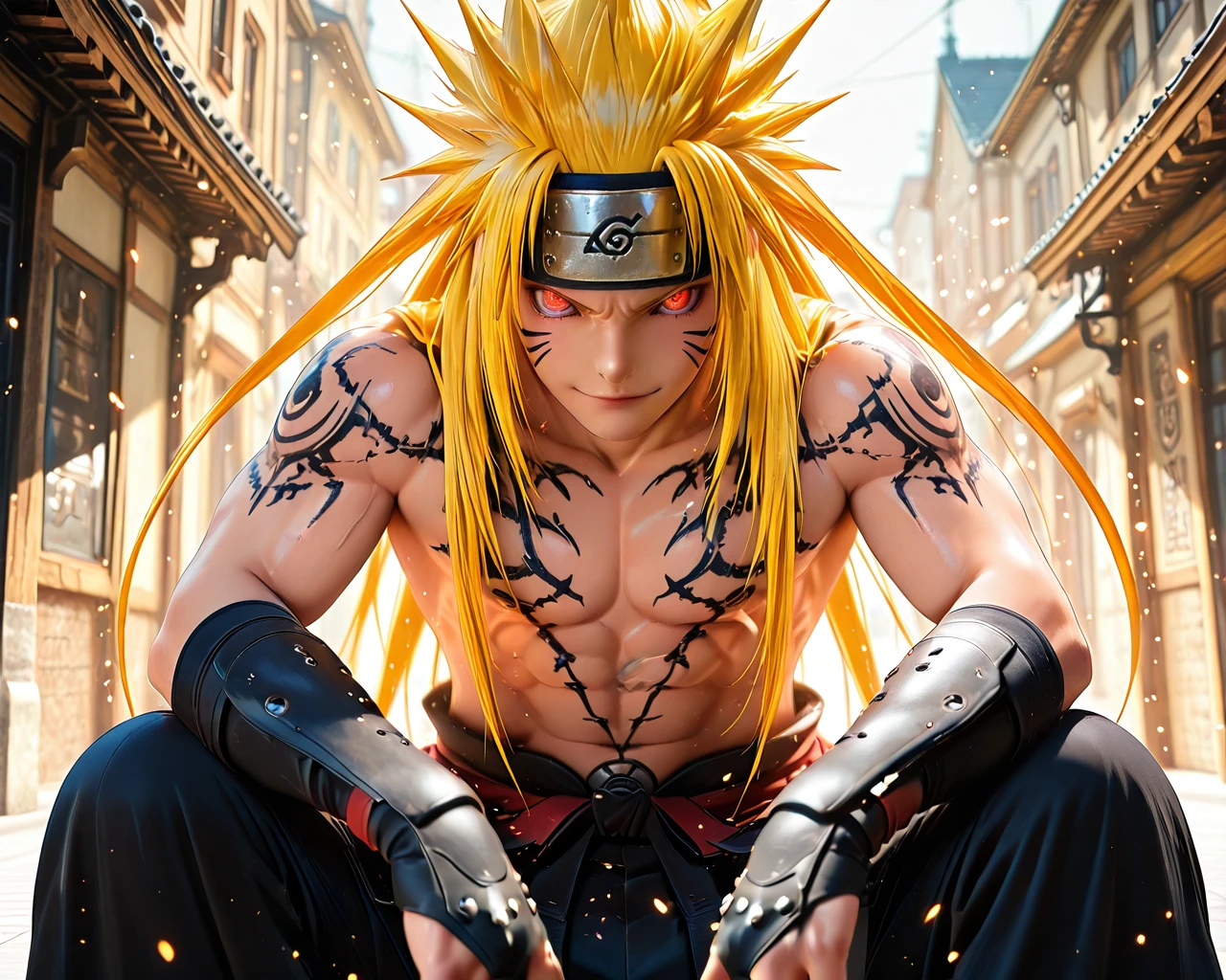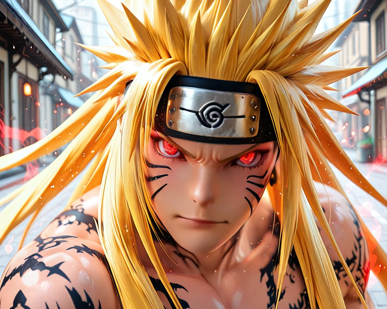 blonde hair, long hair, spiky hair, claws, red eyes, tattoos all over the body, facial mark, forehead protector, black arm guard, black red kimono with belt, black pants, sandals,