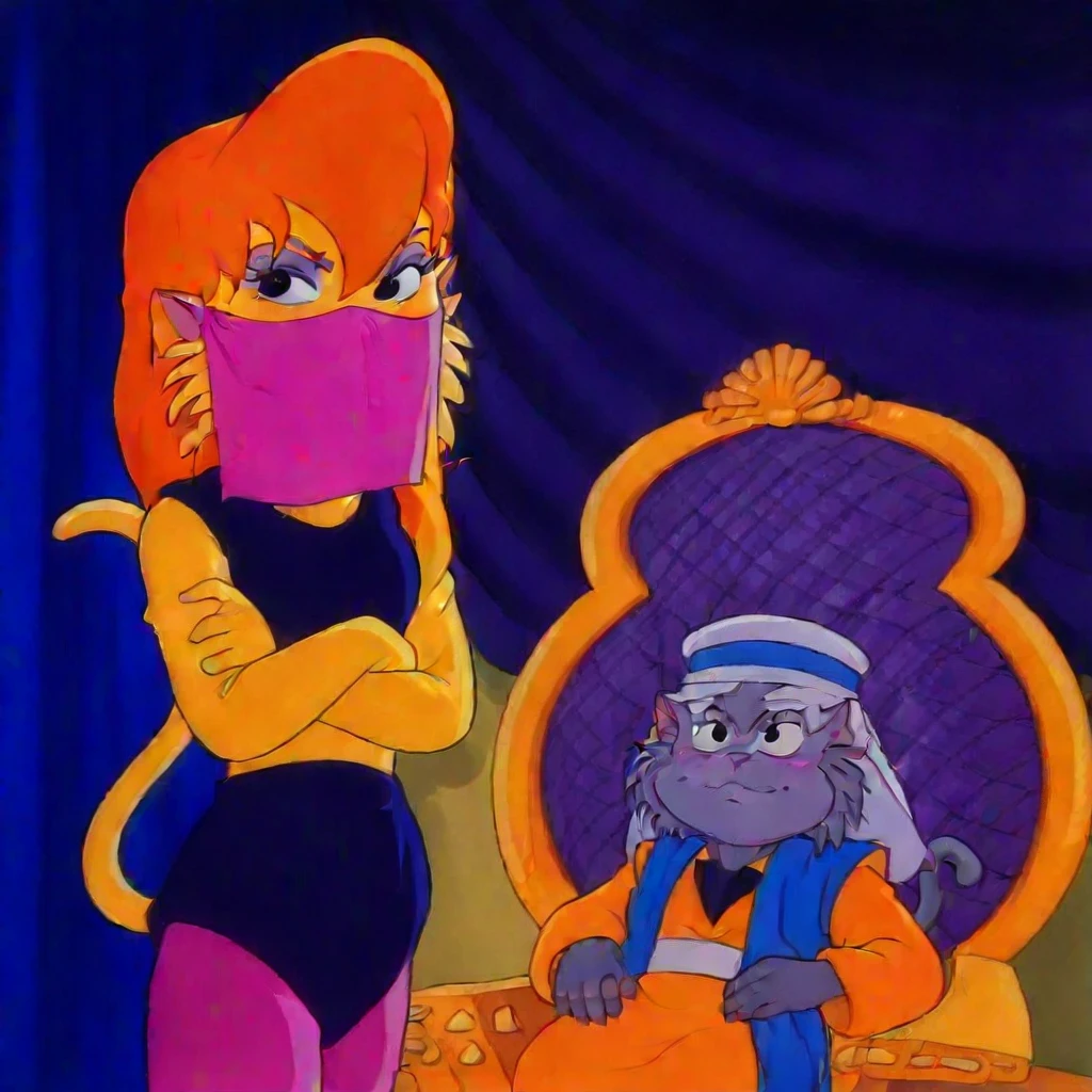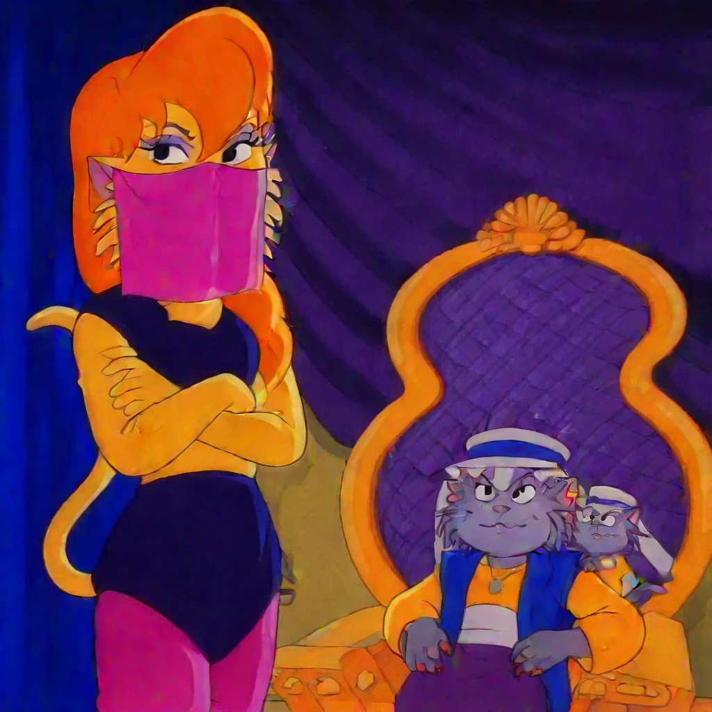 Cleo,cat,white fur,blonde hair,blue eyes,cat ears,female, Pink face veil, blue bandeau,blue pants,harem pants, red shoes,arabian shoes, Red vest,open vest, gold armlet,gold choker
