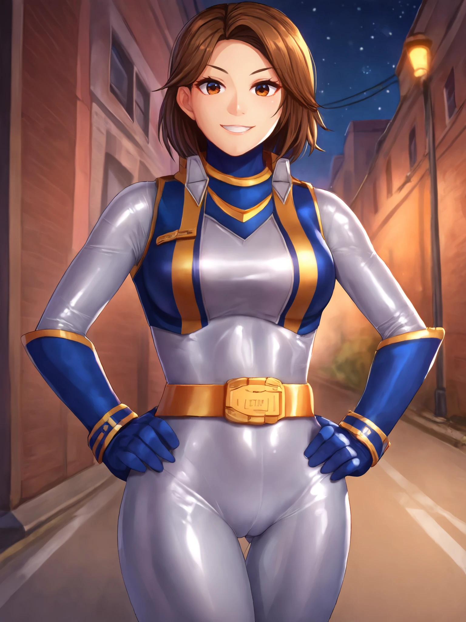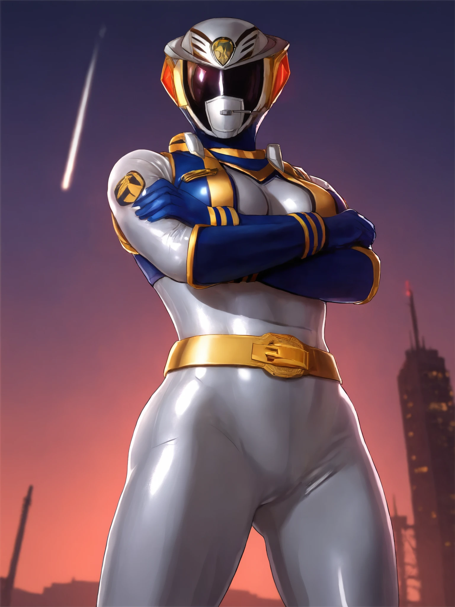 dekabright, silver bodysuit, gold belt, blue gloves, shiny clothesboots, blue footwearhelmet, wearing helmethelmet, helmet removed, no headwear, unworn helmet, holding helmethelmet removed, no headwear