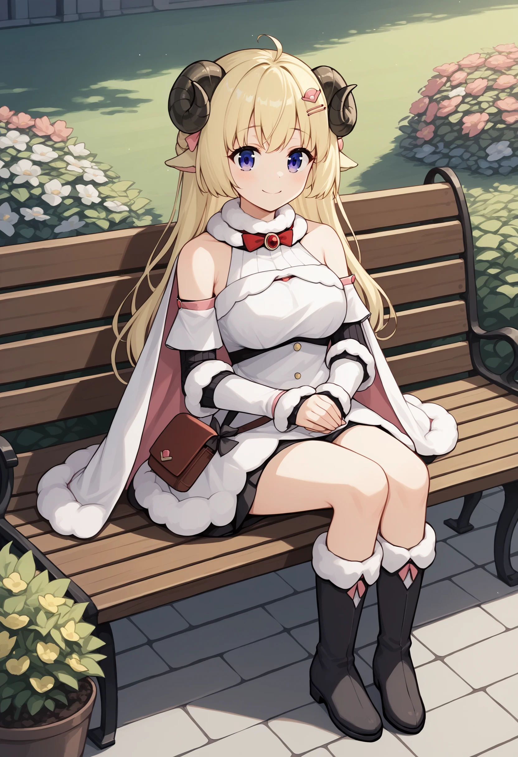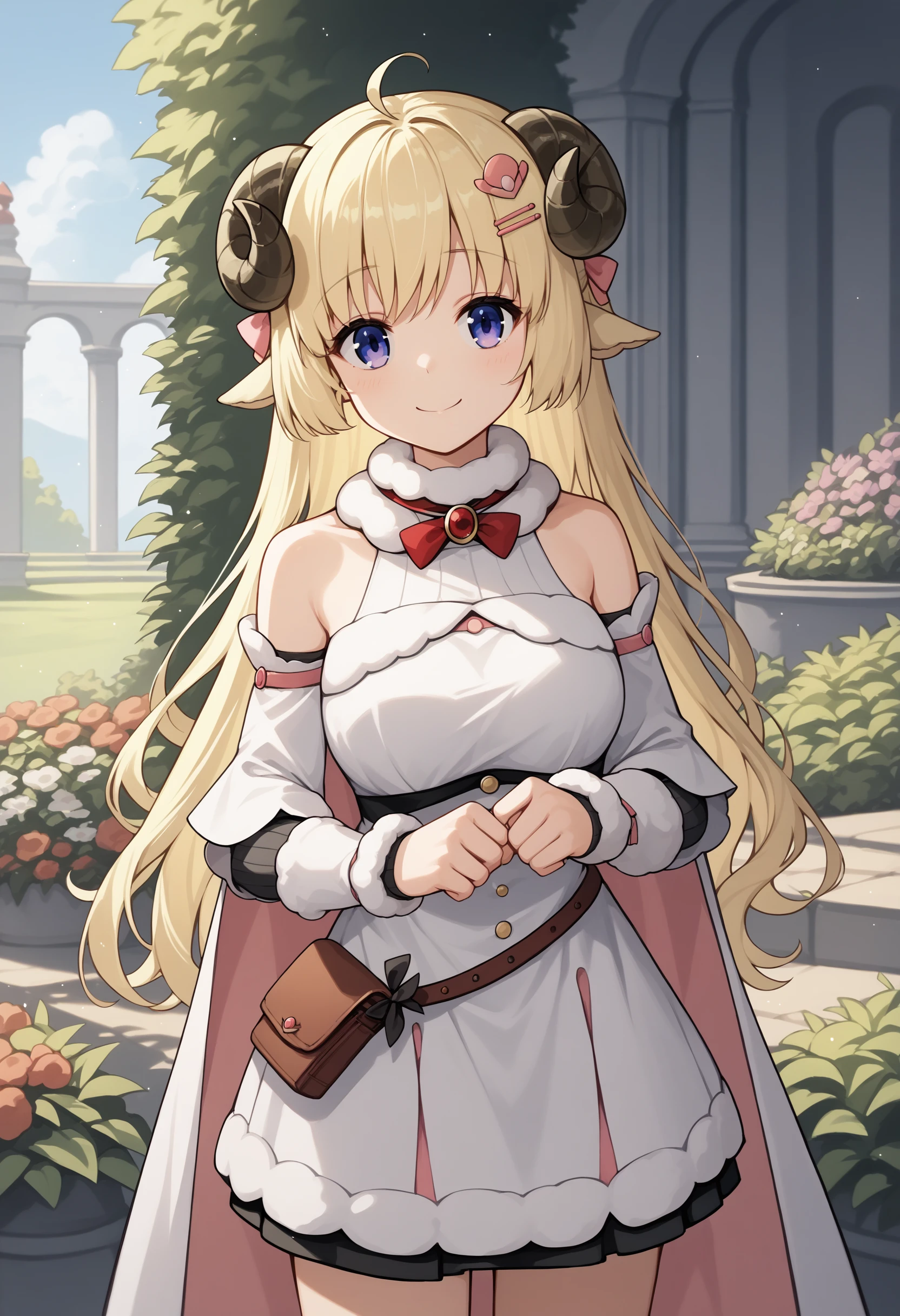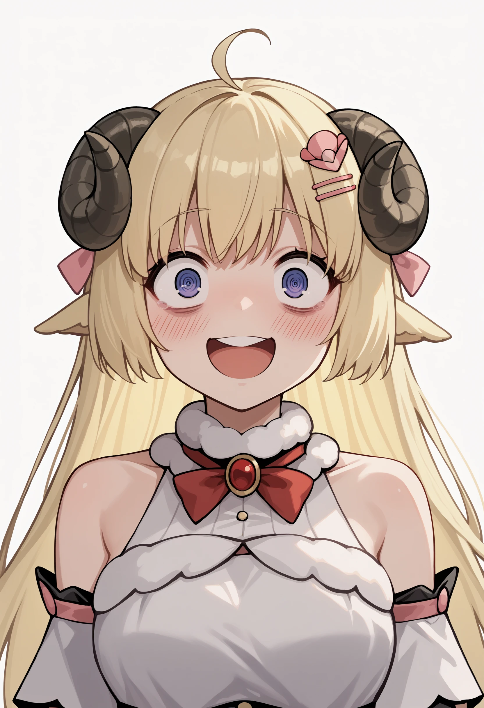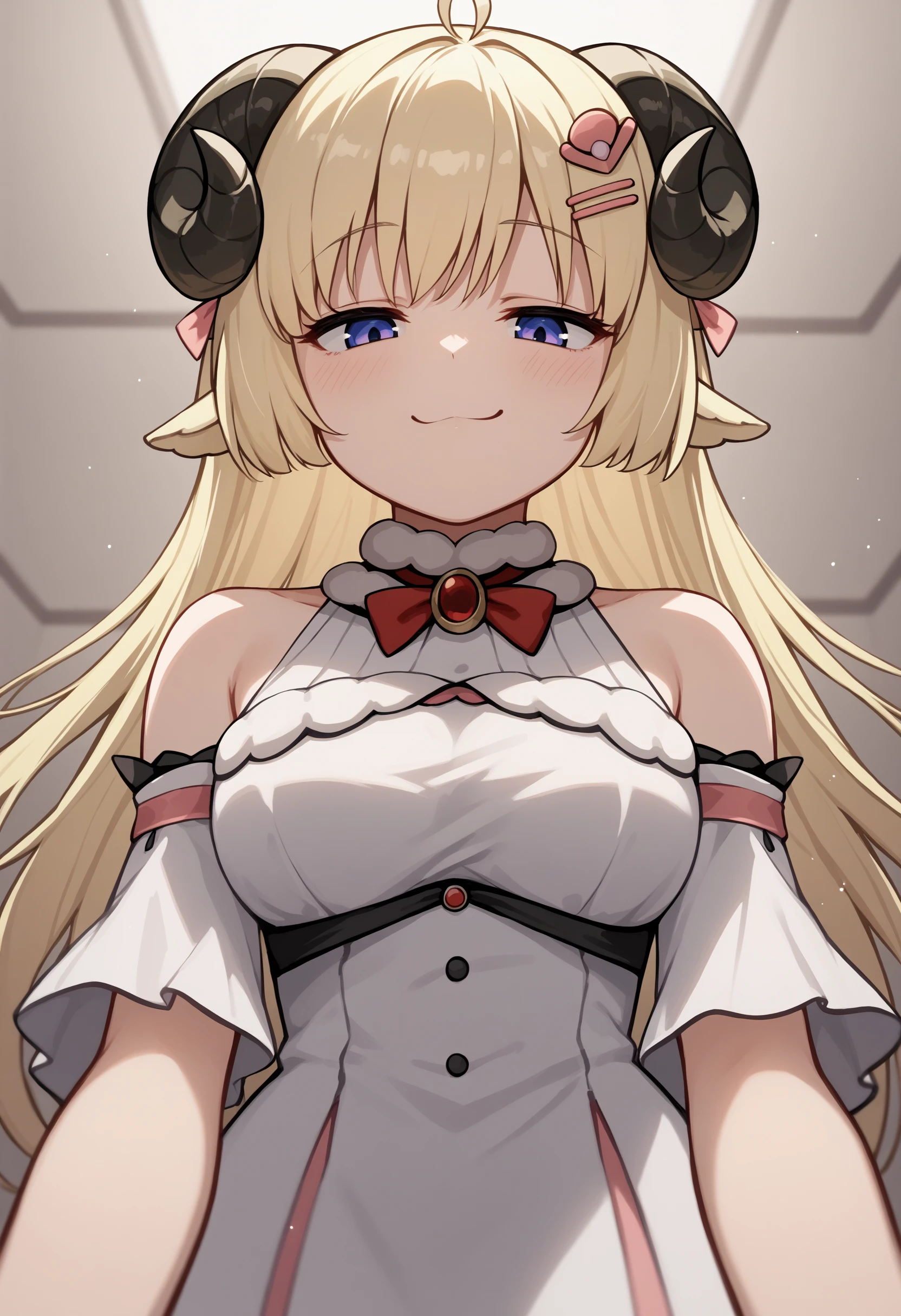 tsdef, blue eyes, purple eyes, horns, sheep horns, sheep ears, ahoge, bangs, blonde hair, long hair, hairclip, hair ornament