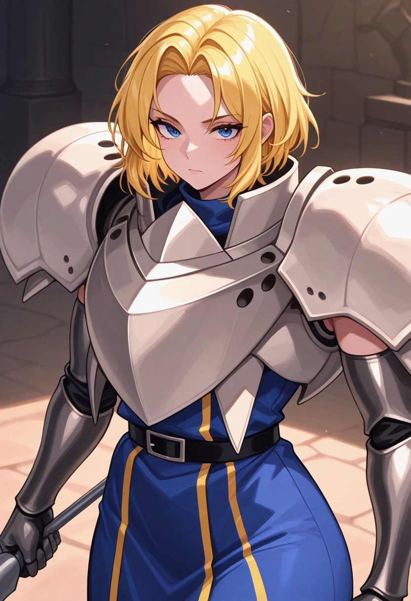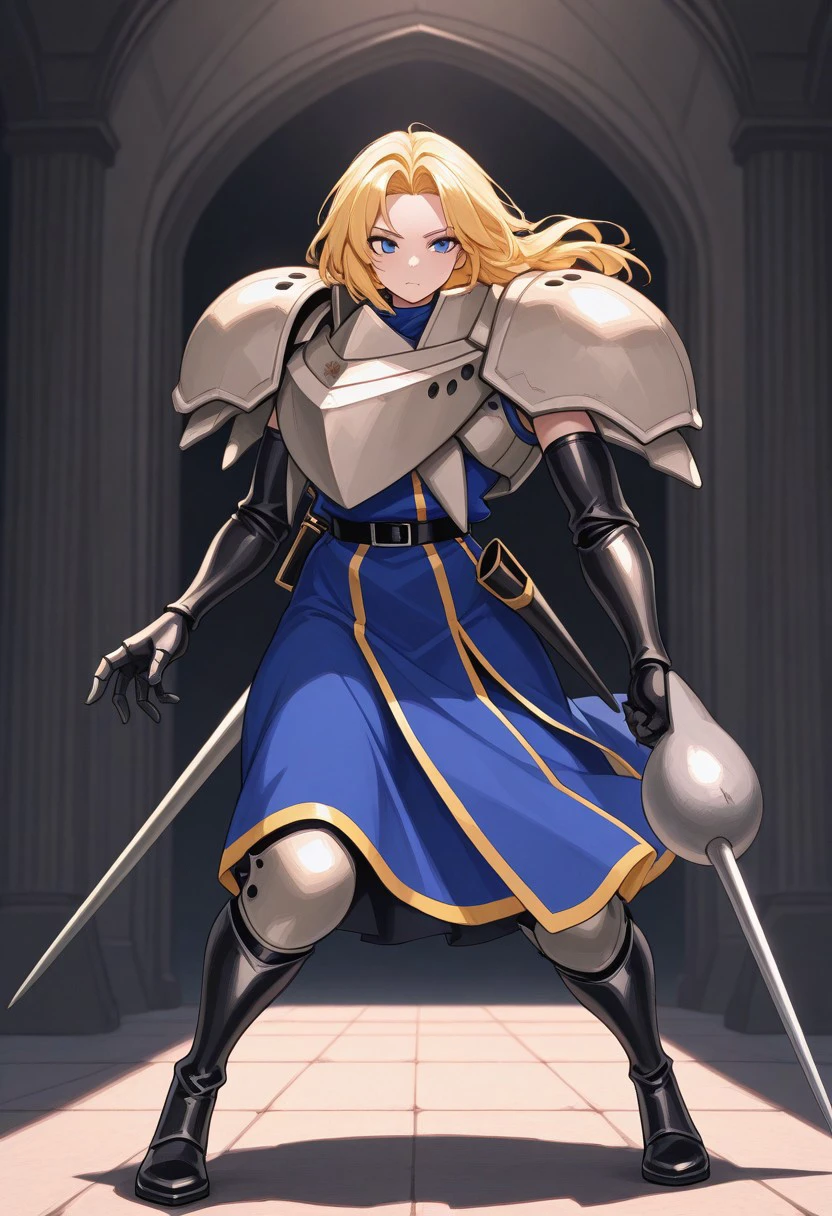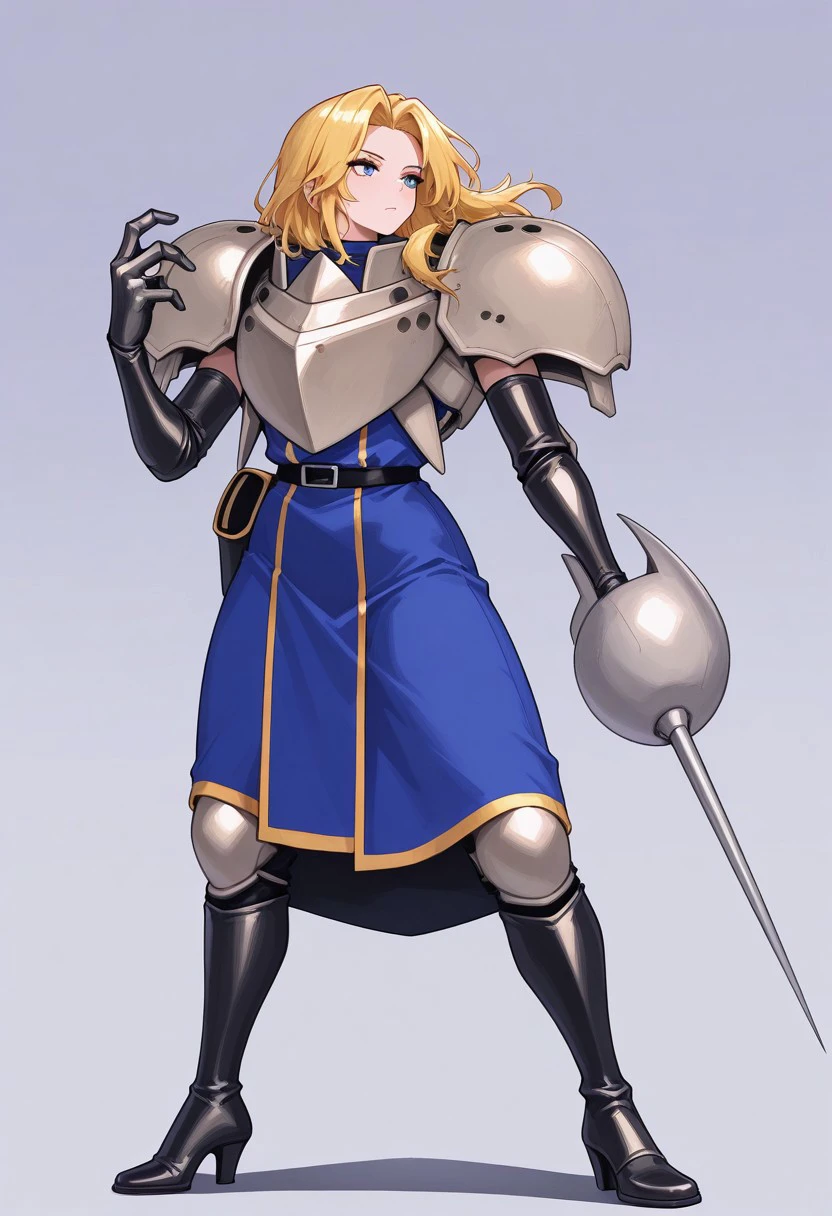 Charlottess, solo ,armor, blonde hair ,1girl, weapon, blue eyes ,gauntlets ,boots ,shoulder armor ,polearm, dress, pauldrons ,breastplate, long hair