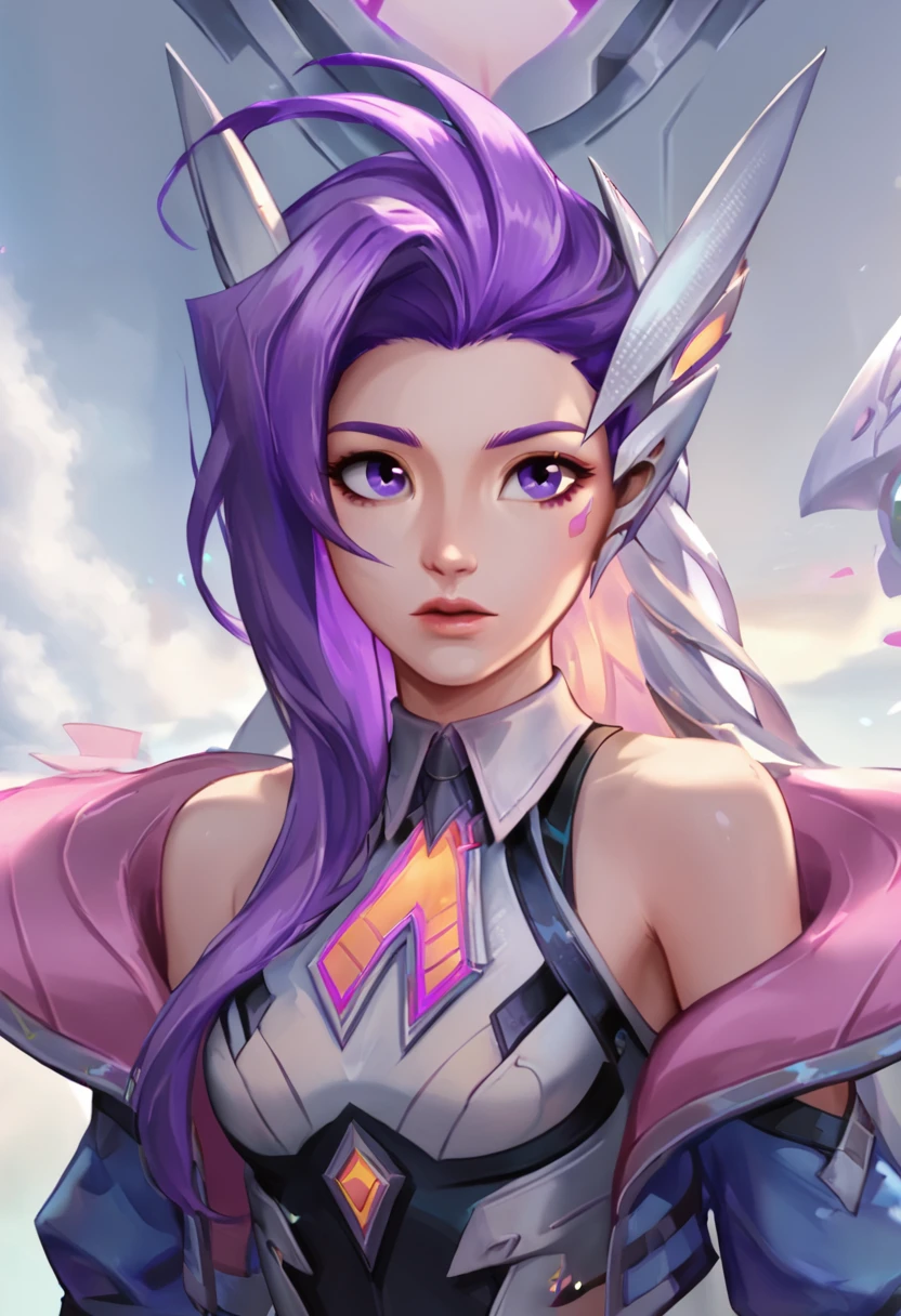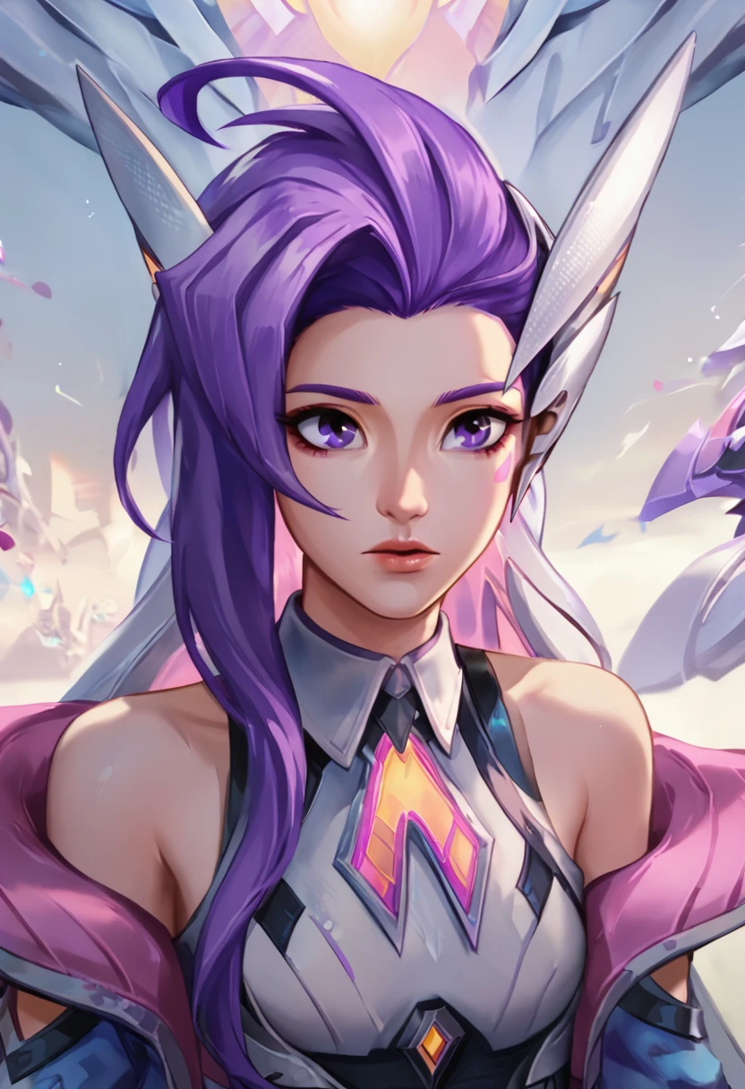 BDSera, purple hair, long hair, purple eyes, upper body, cropped jacket, bare shoulders, battle leotard, silver thighhighs, wing, fingerless glove, high heels