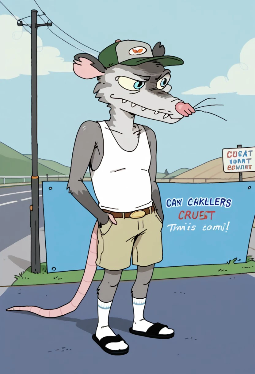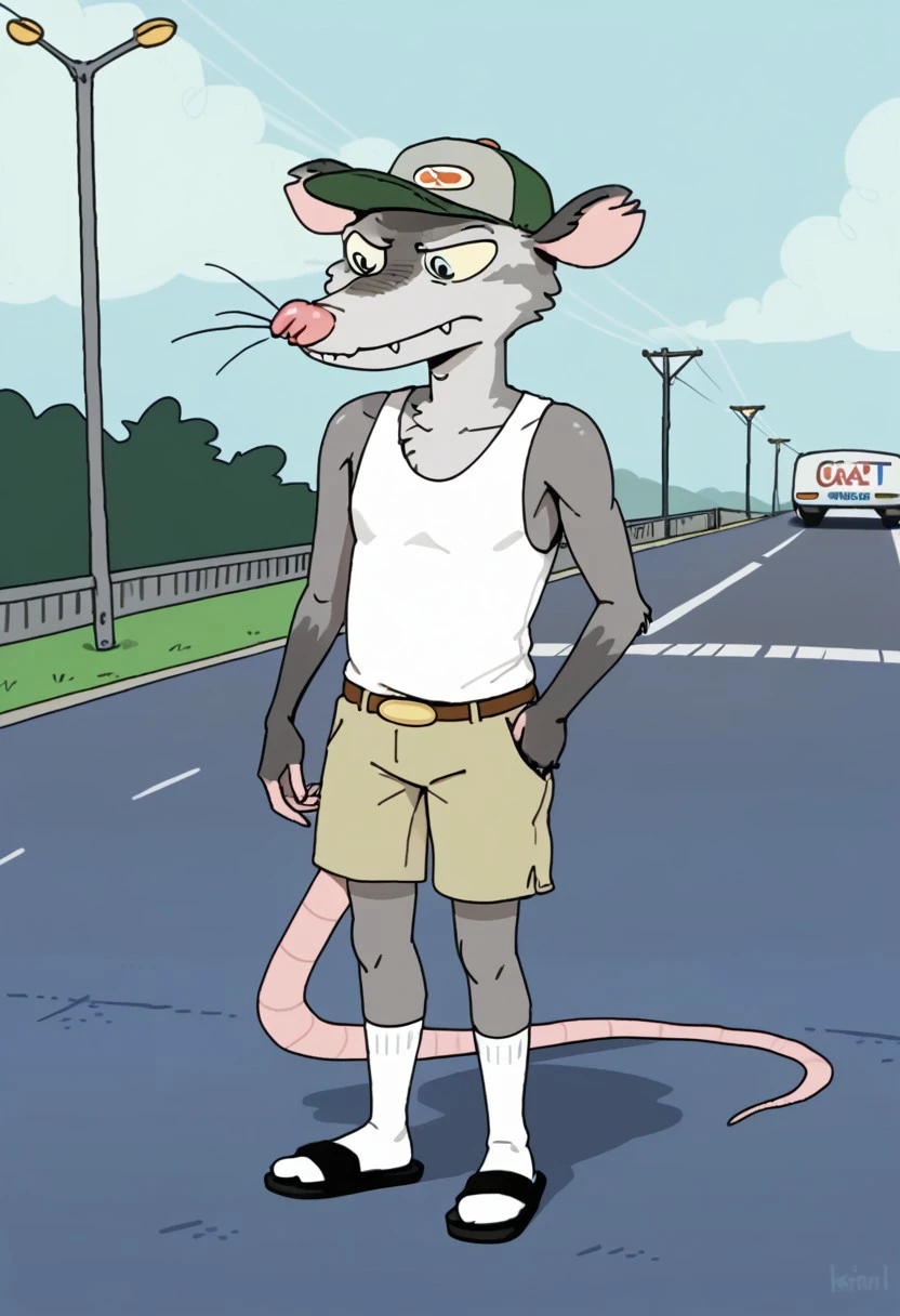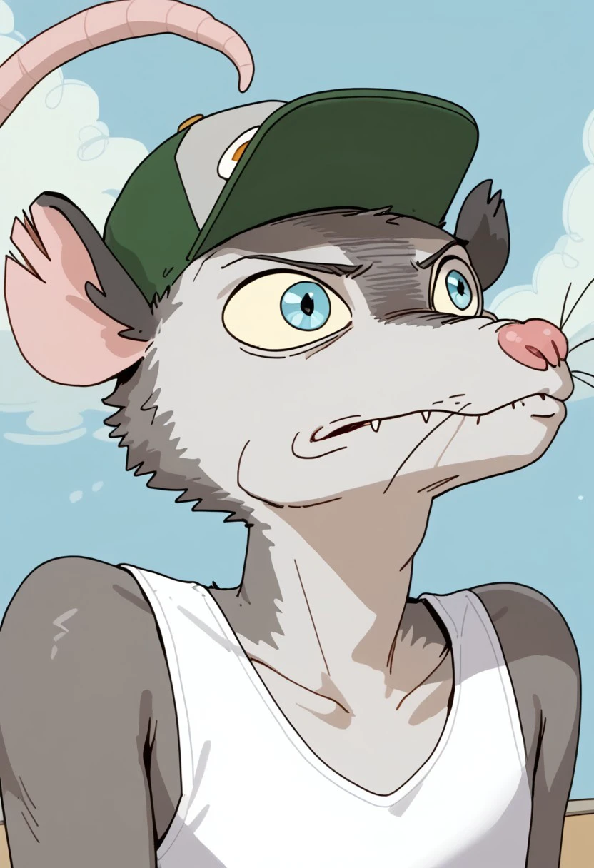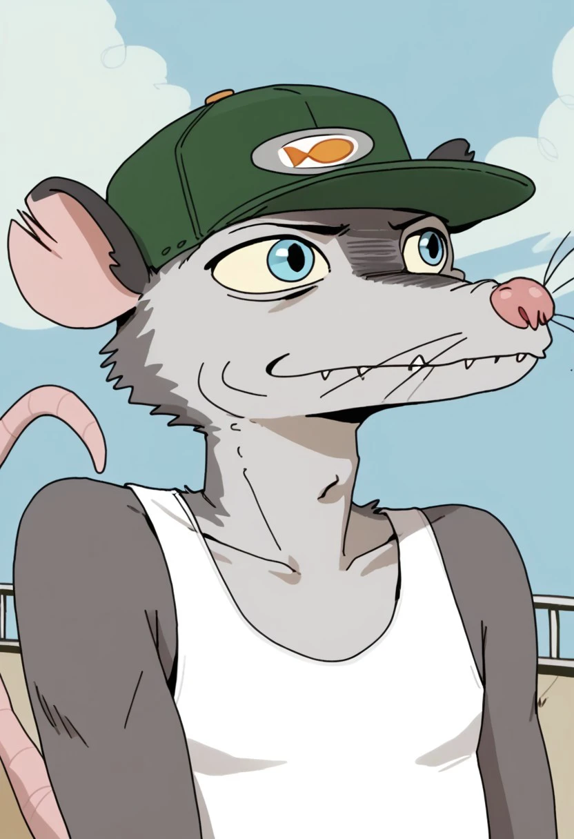1boy, furry, animal, oppossum, pink nose, blue eyes, grey fur, rat tail, opossum tail, animal ears, tank top, cap, green cap, shorts, socks, flip flops, sandals, whiskers
