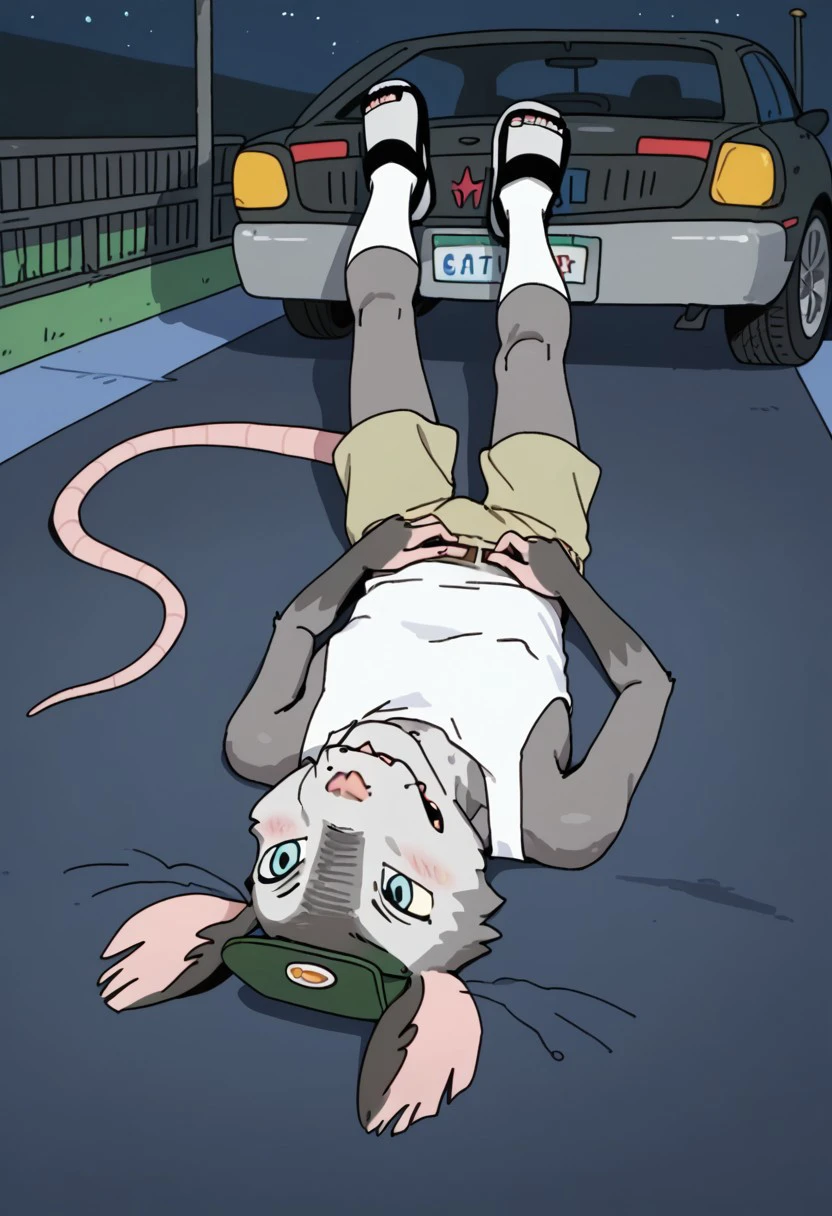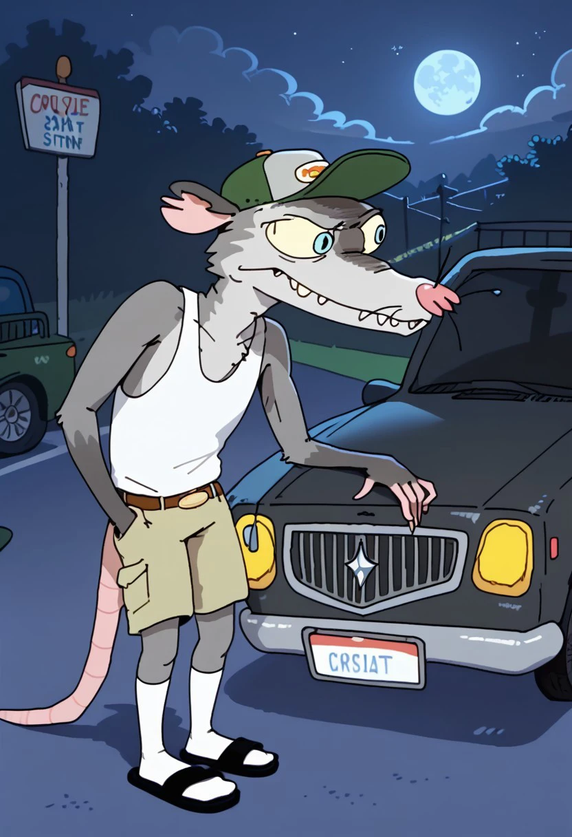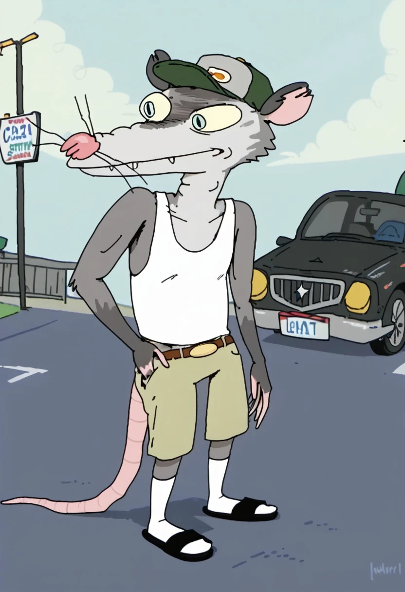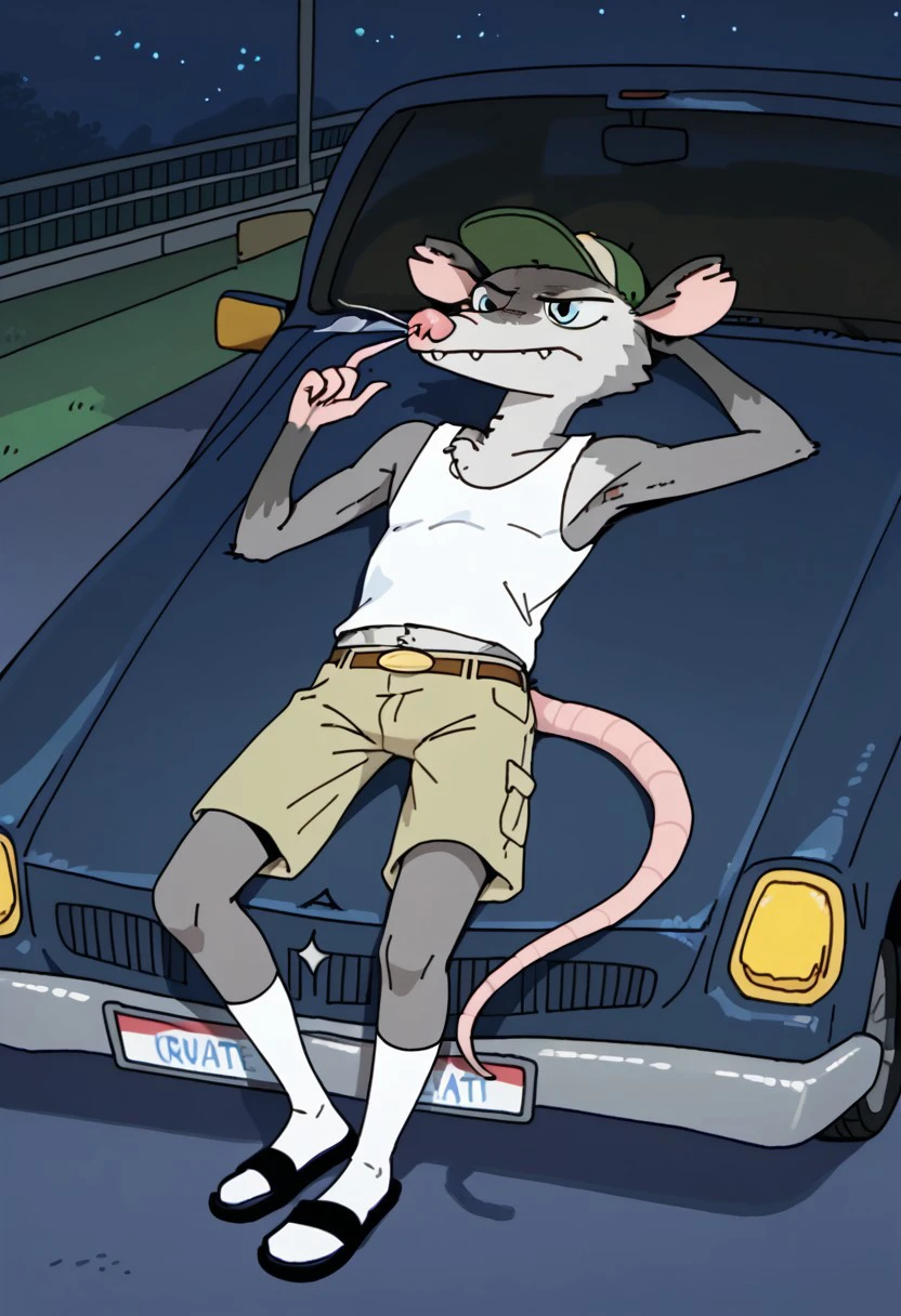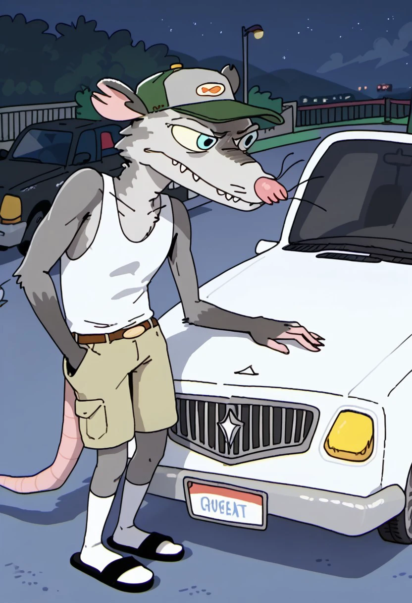 1boy, furry, animal, oppossum, pink nose, blue eyes, grey fur, rat tail, opossum tail, animal ears, tank top, cap, green cap, shorts, socks, flip flops, sandals, whiskers