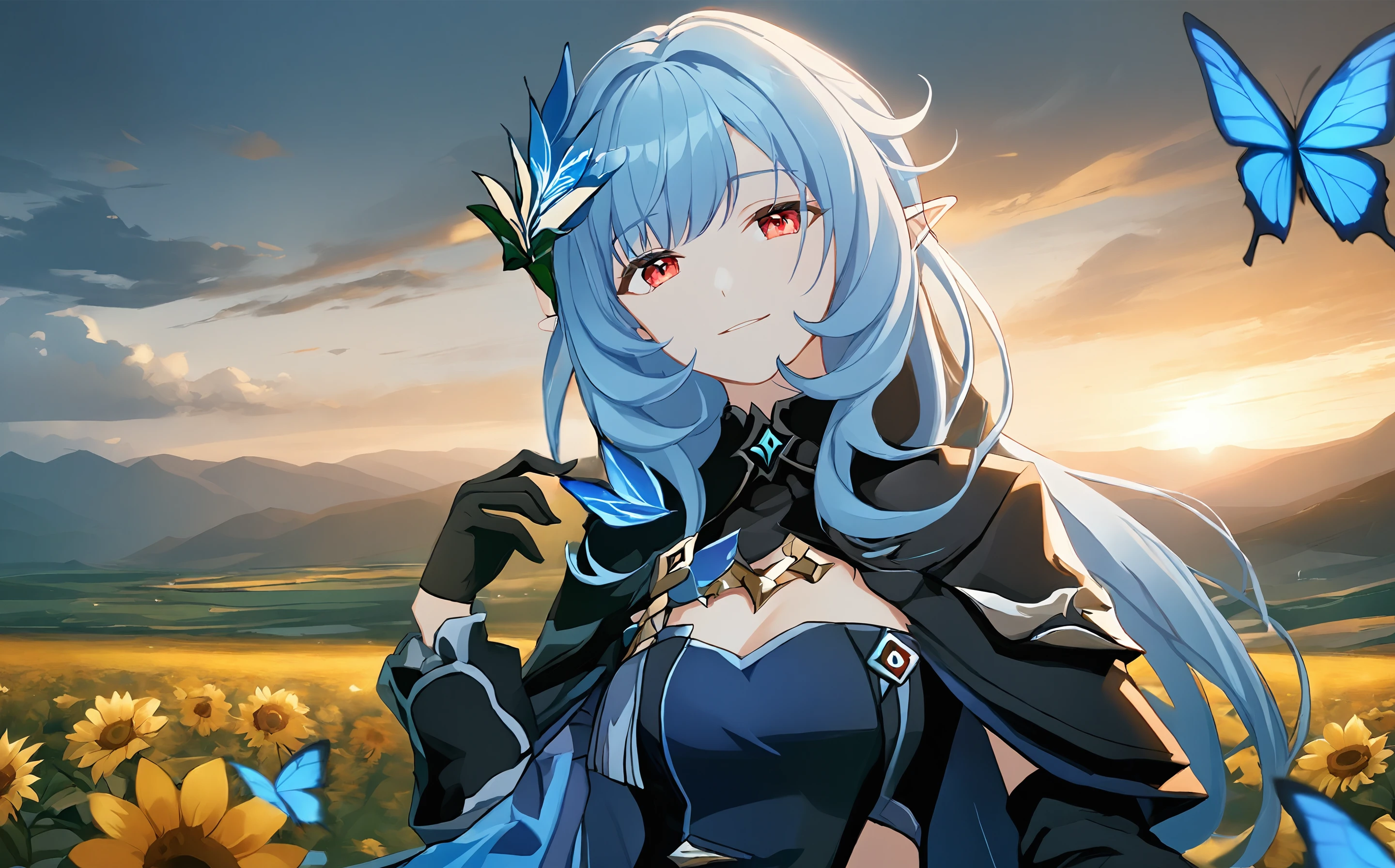 1girl,pointy ears,long hair,(hair ornament:0.8),looking at viewer,solo,breasts,bangs,smile,cleavage,closed mouth,elf,gloves,indoors,blue hair,black gloves,red eyes,yellow red eyes,