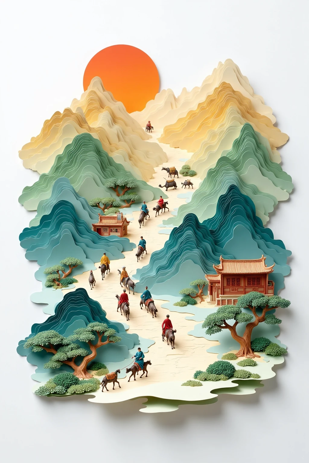 Paper - cut art with Chinese landscape elements, with a desert - like mountain range, a caravan traveling, setting sun hues of orange and yellow.