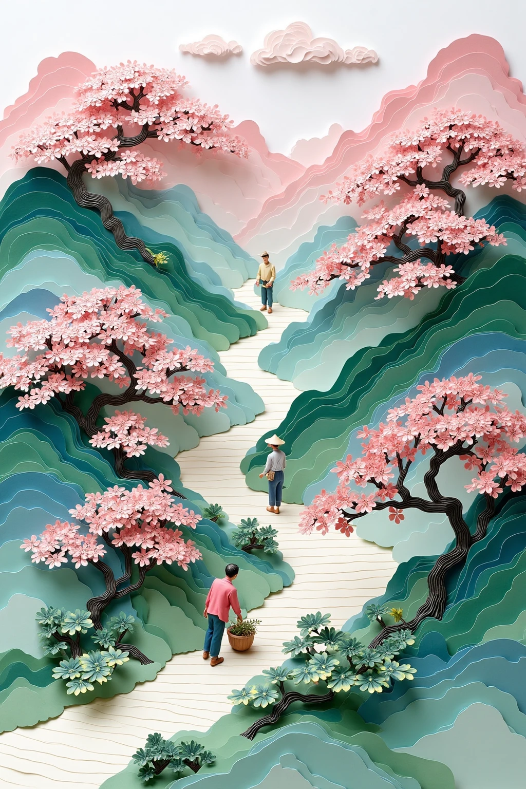Paper - cut art with Chinese landscape elements, depicting a valley with blooming peach trees, a farmer working, bright pink and green colors.