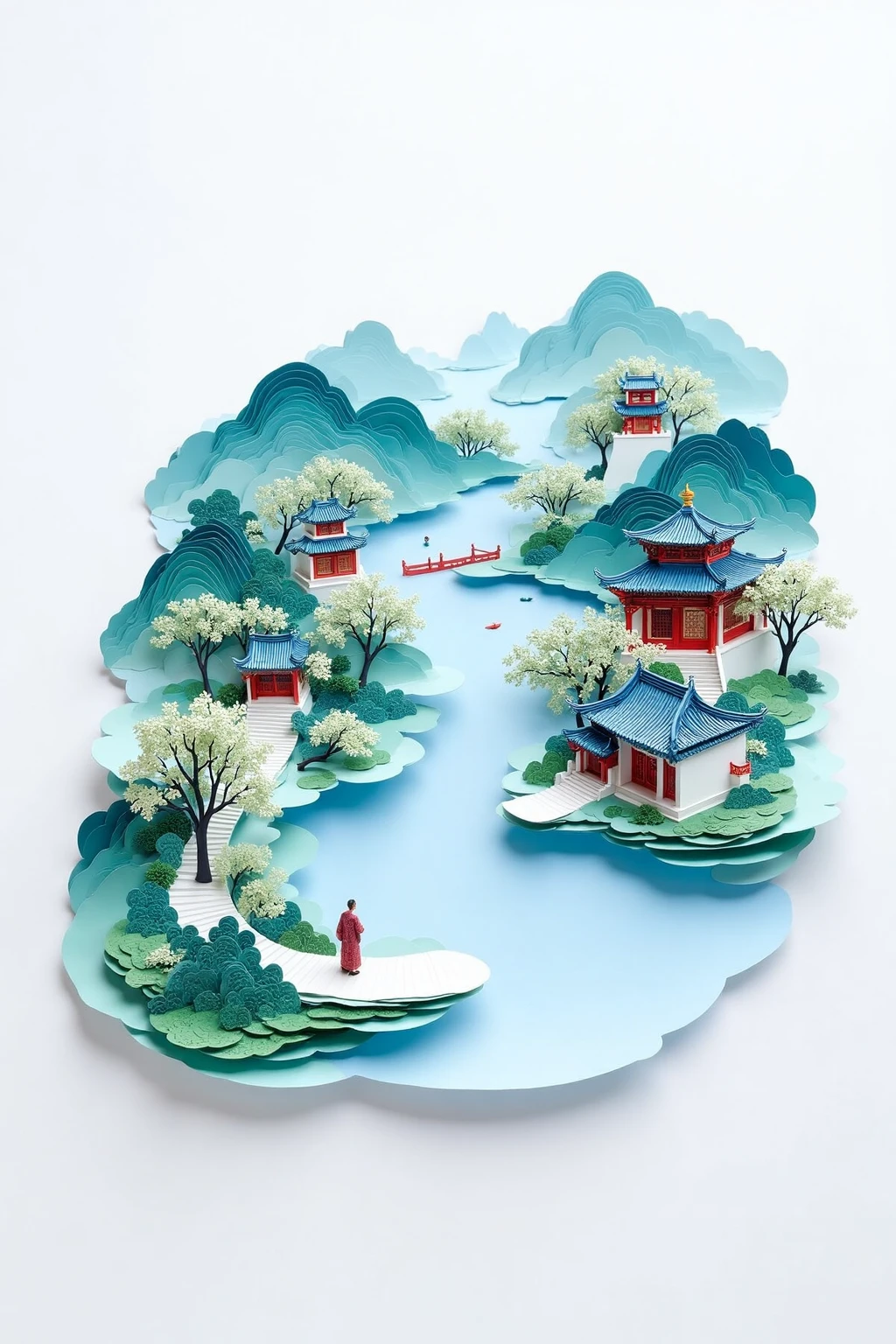 Paper - cut art with Chinese landscape elements, presenting a tranquil lake surrounded by pagodas, willow trees, and a poet by the shore, gentle blue and white shades.