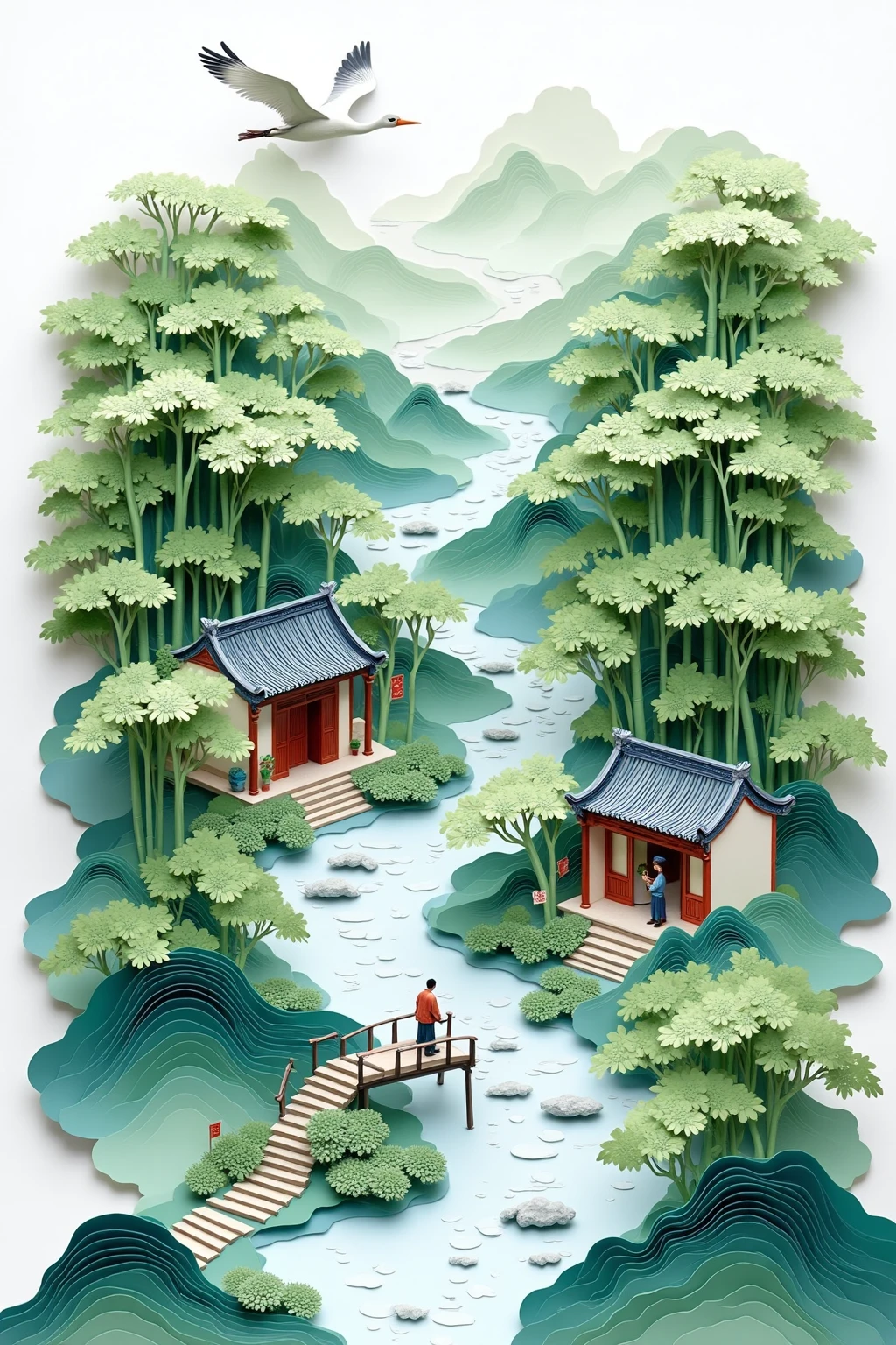 Paper - cut art with Chinese landscape elements, showcasing a bamboo forest by a stream, a hermit's cottage, and a crane flying overhead, fresh green and brown tones.