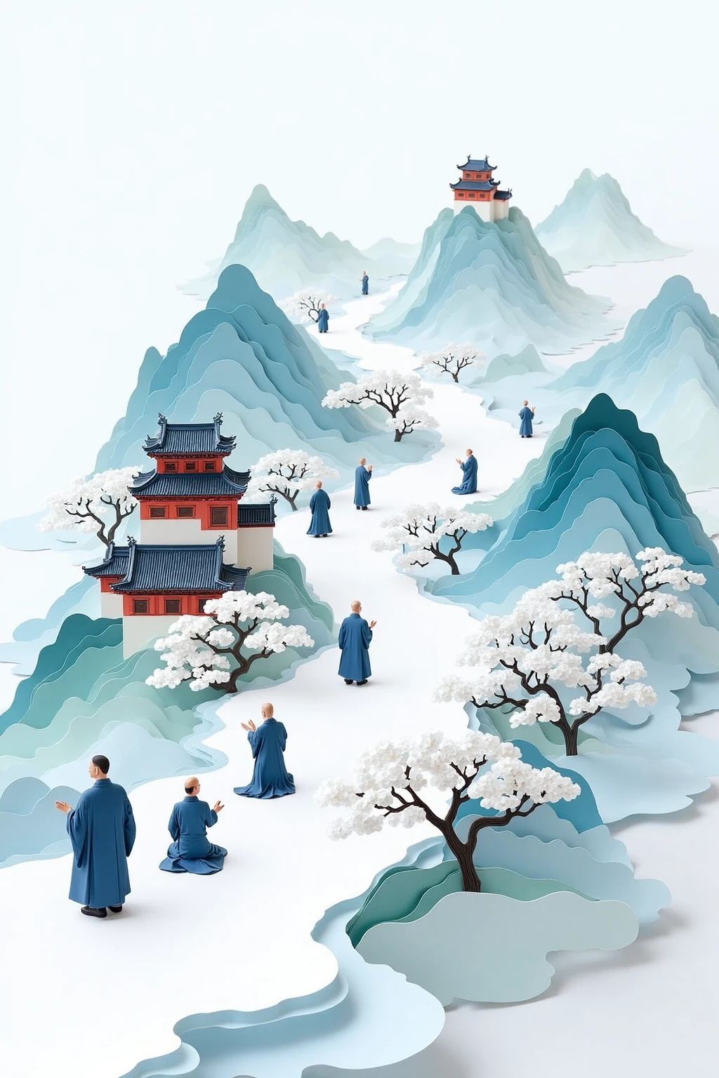 Paper - cut art with Chinese landscape elements, featuring a snowy peak with a monastery, monks praying, white and blue wintry colors.
