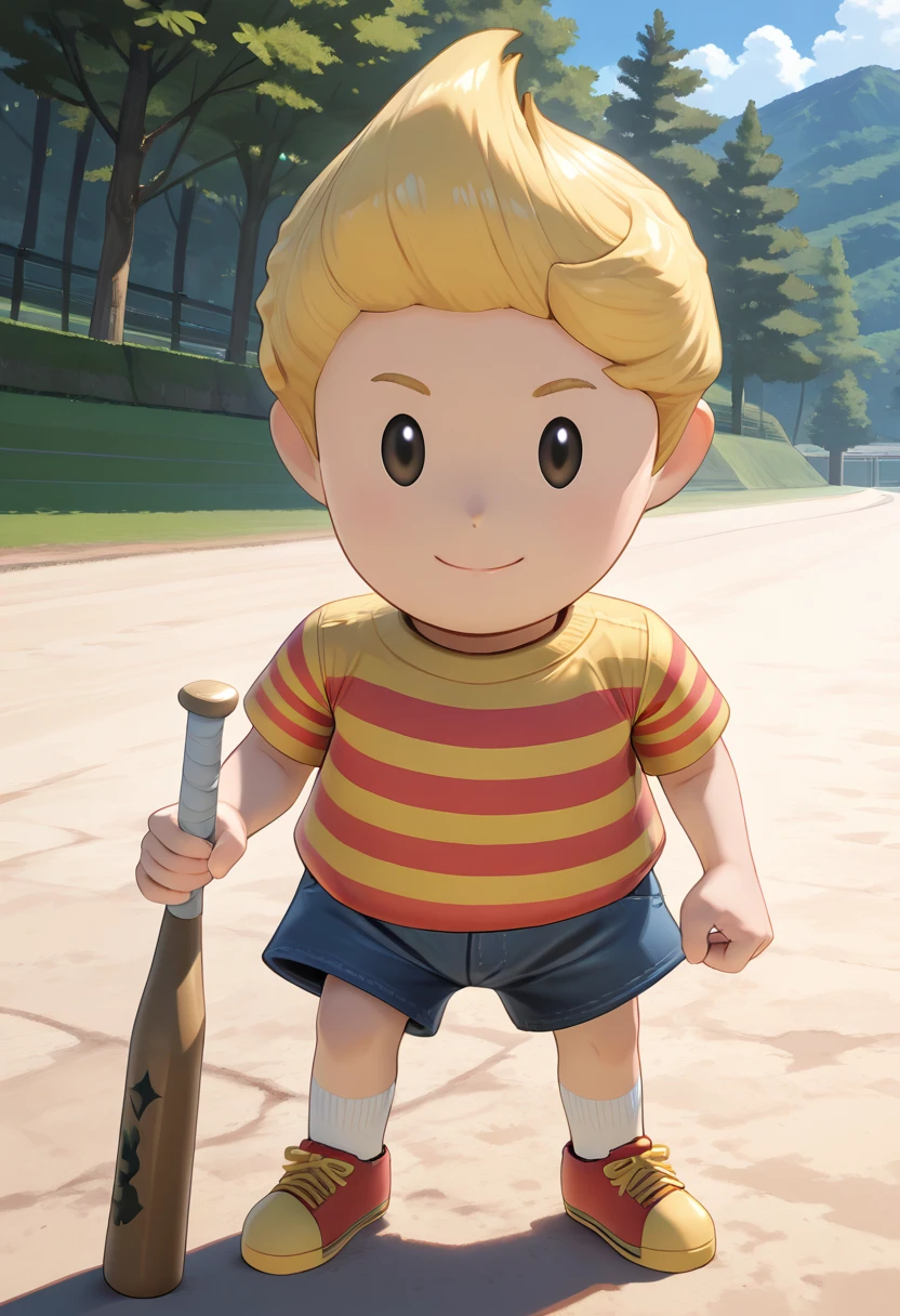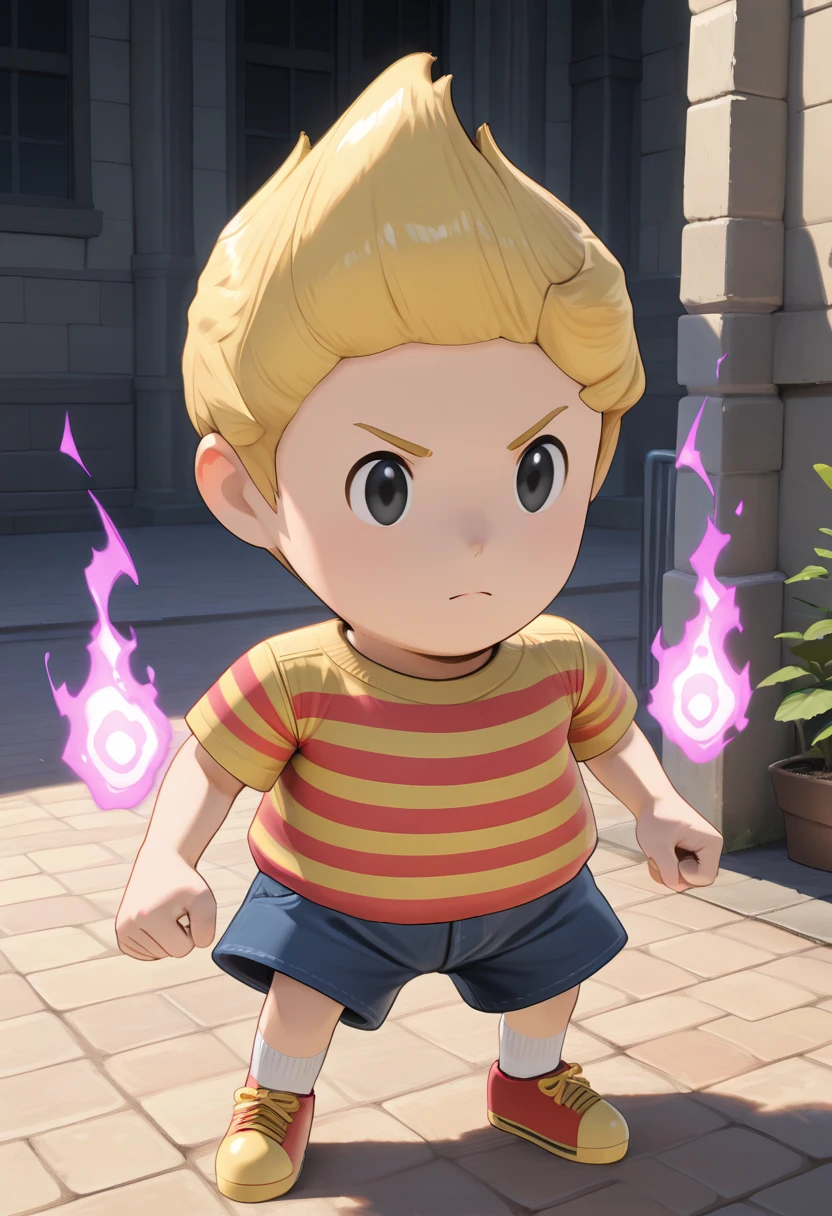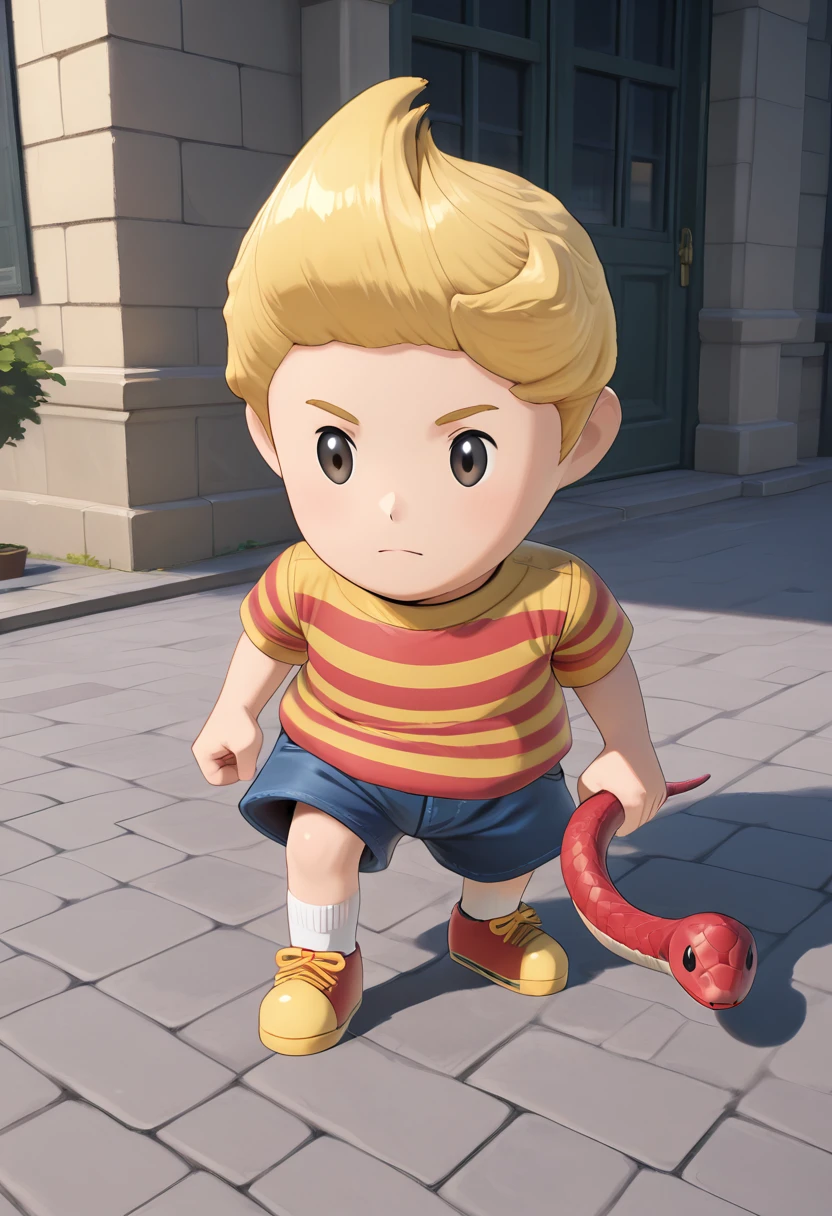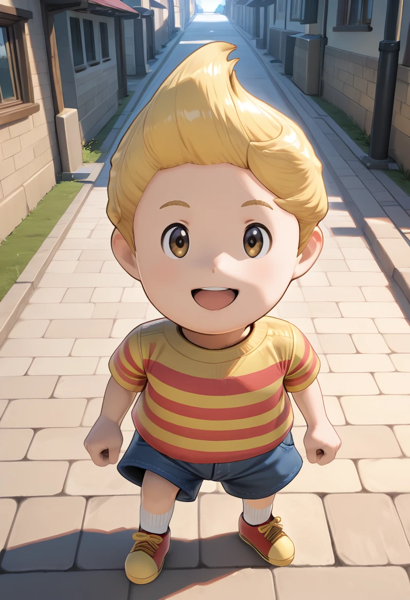 lucasm3xl, striped shirt, shoes, blonde hair, 1boy