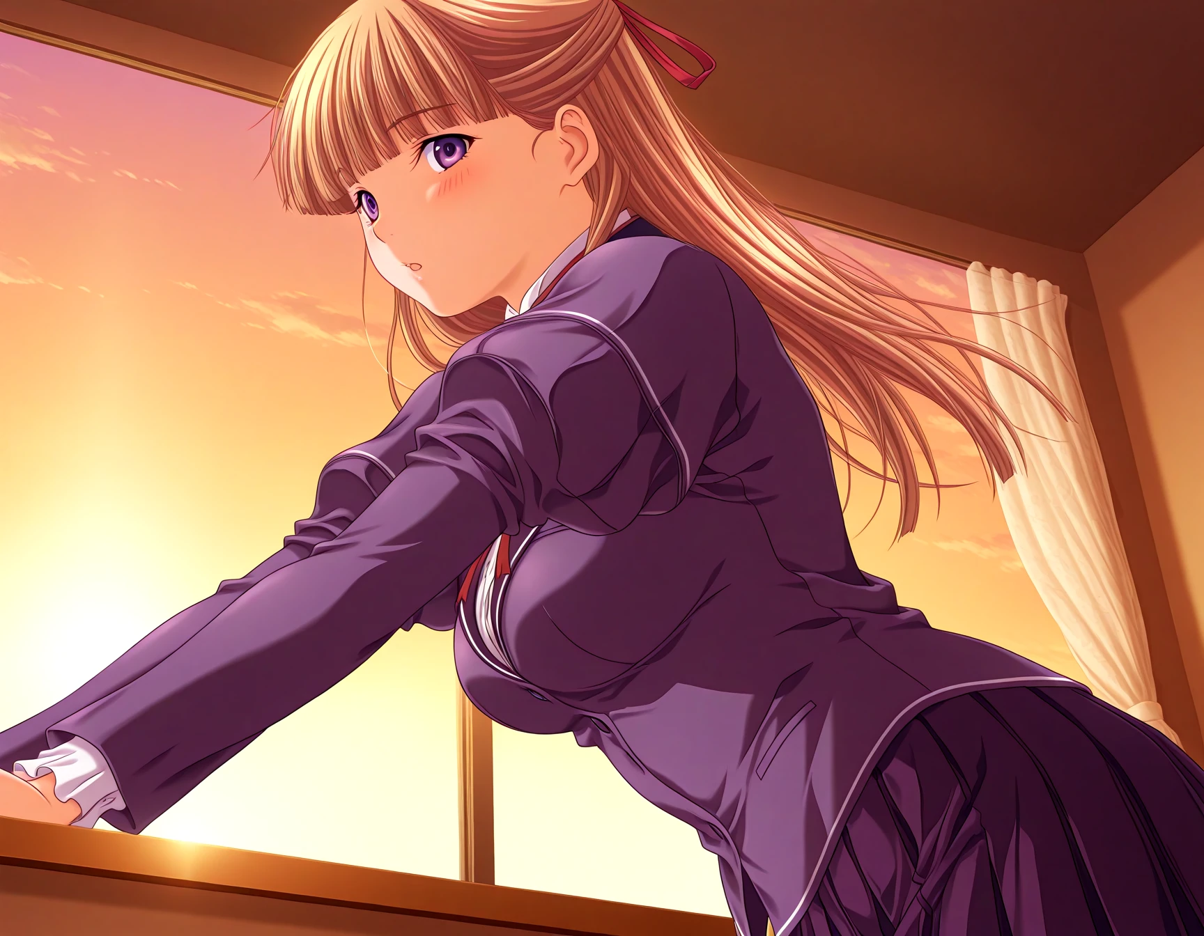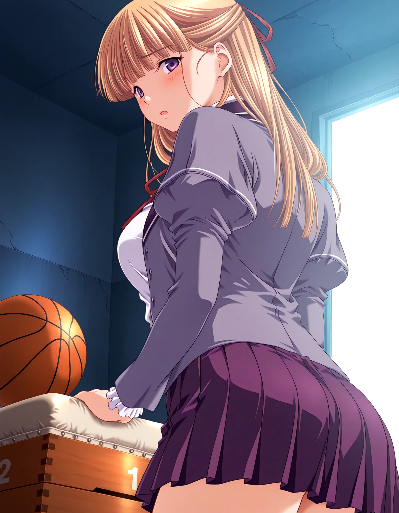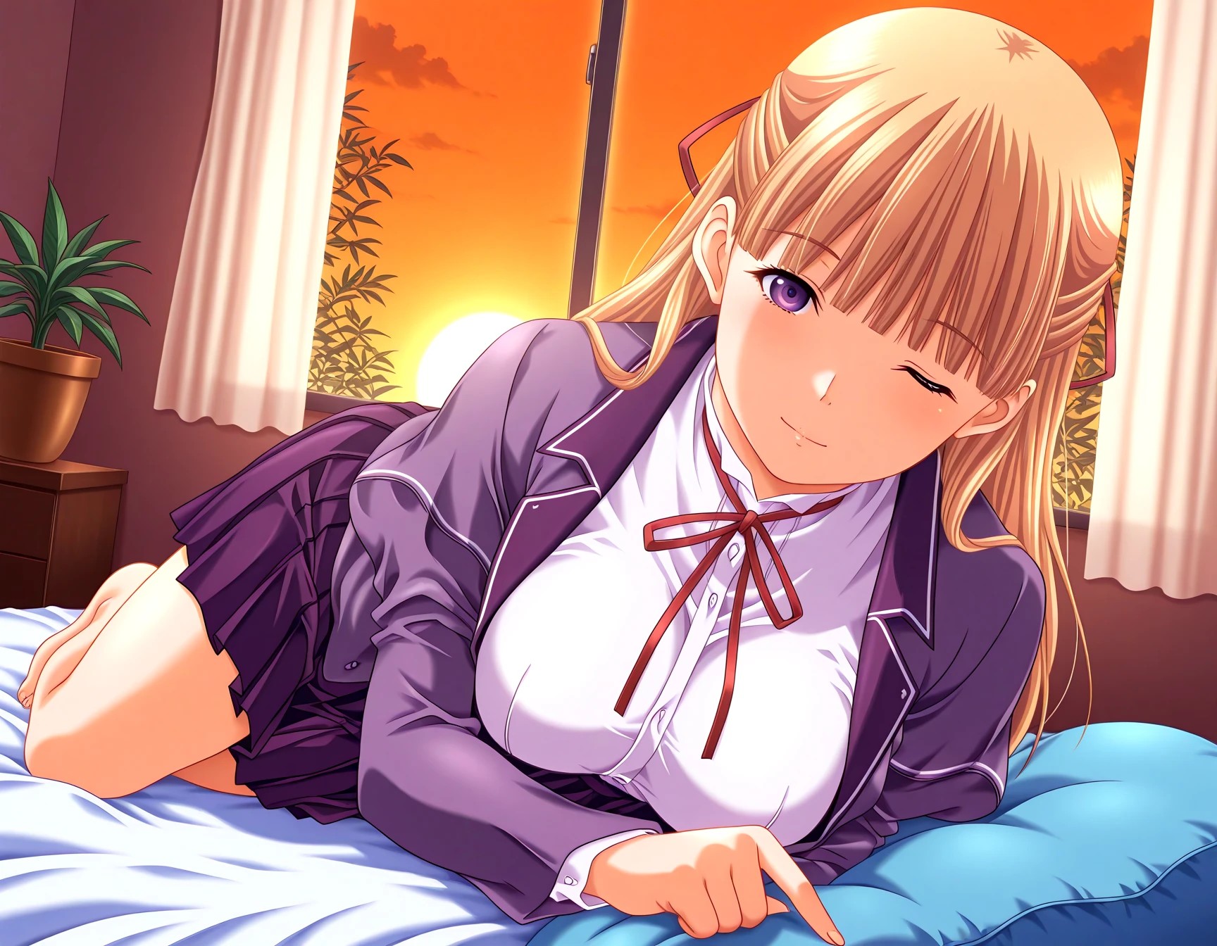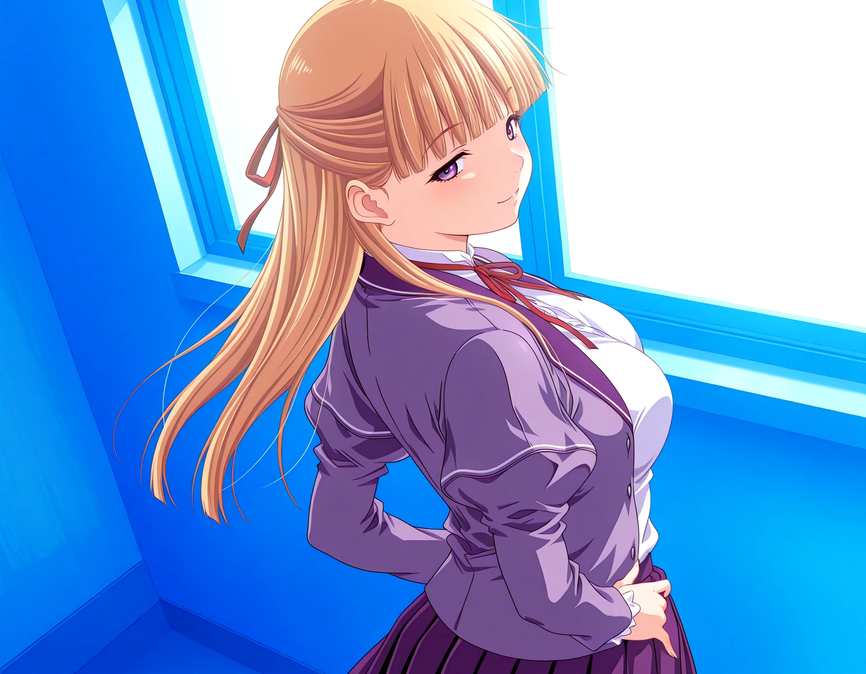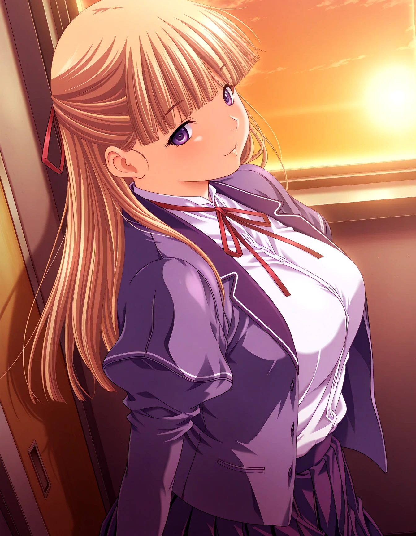 Kanzaki Asuka, 1girl, purple eyes, blonde hair, long hair, blunt bangs, half updo, hair ribbon, school uniform, purple jacket, collared shirt, white shirt, long sleeves, neck ribbon, pleated skirt, purple skirt, {|open jacket}Description