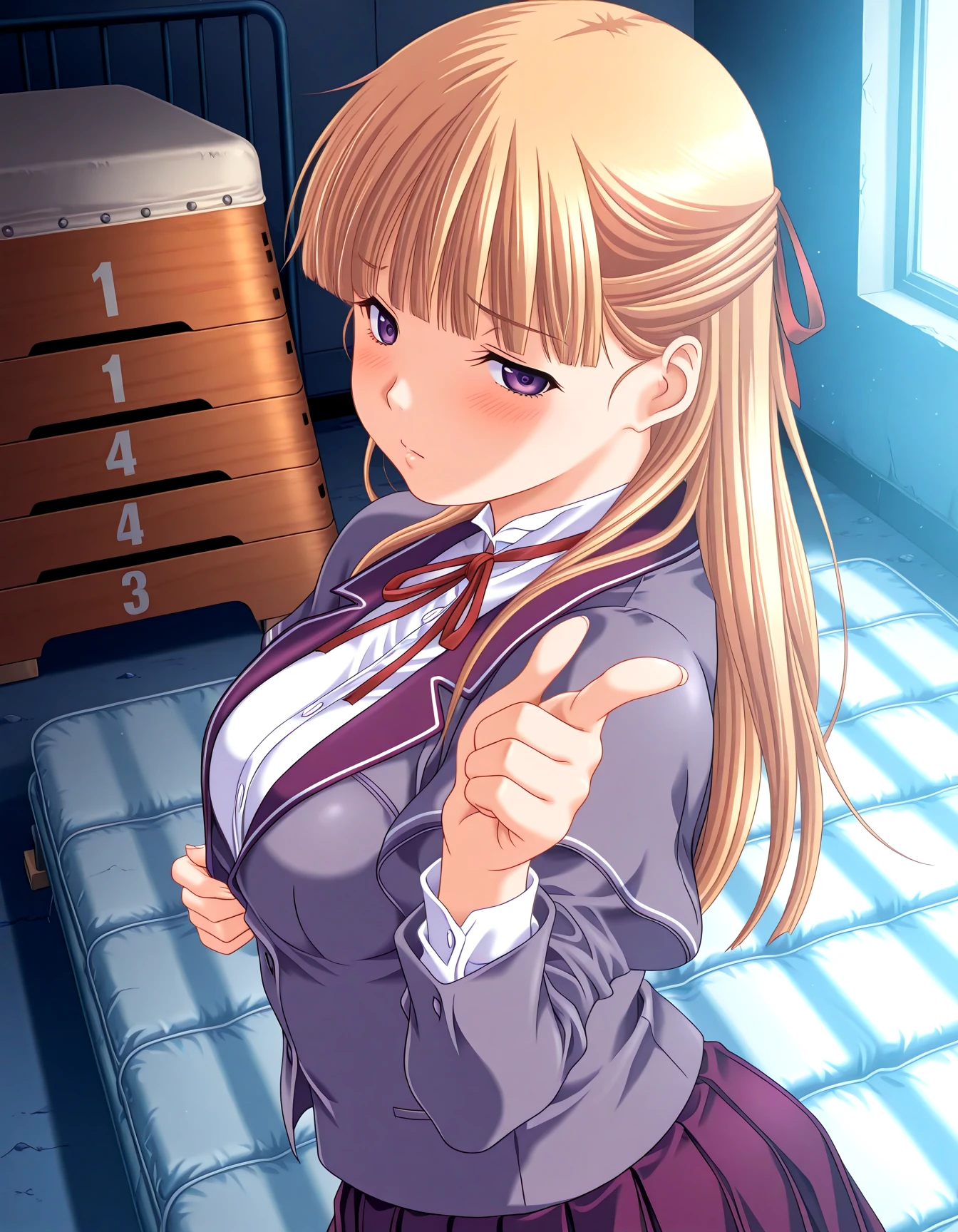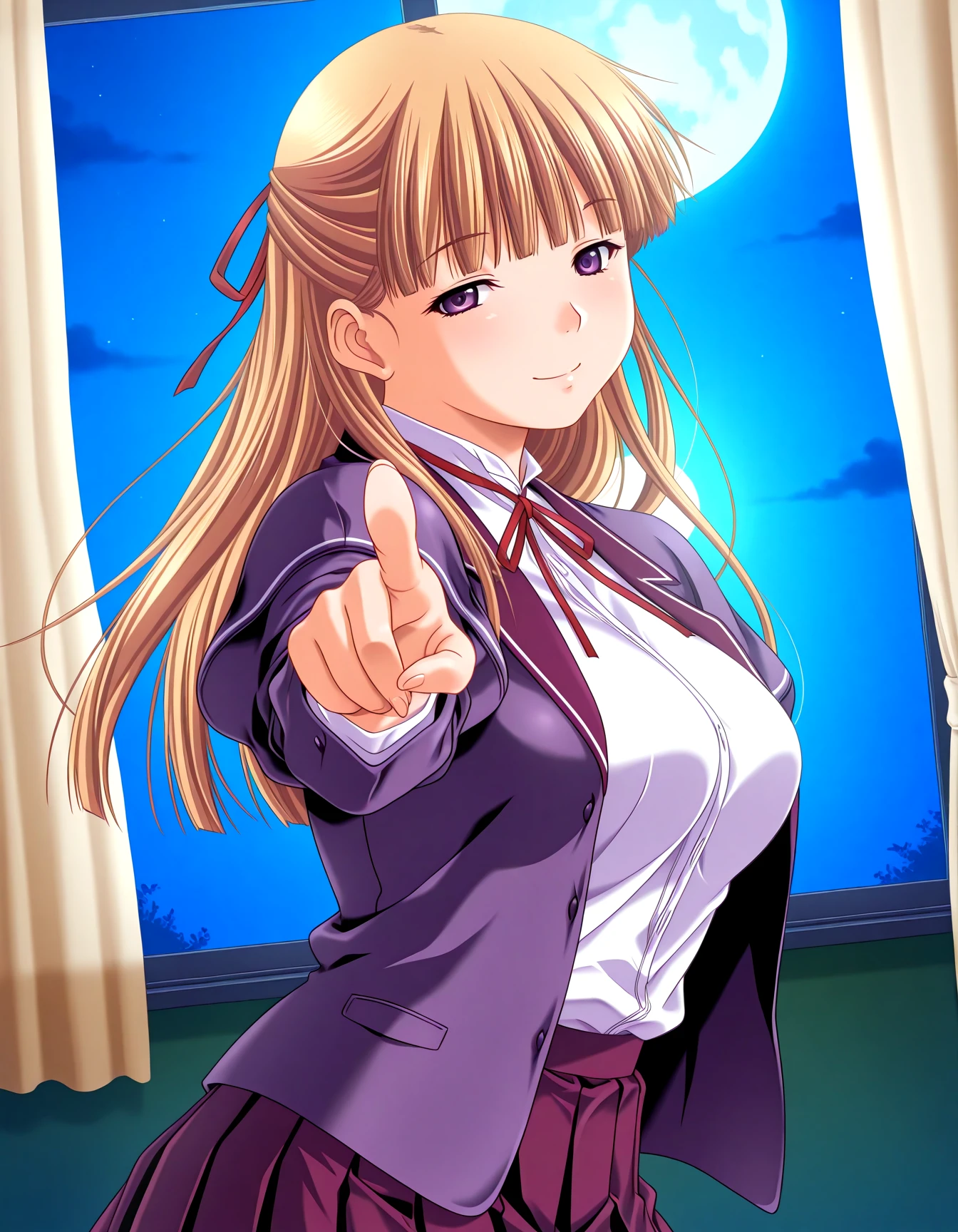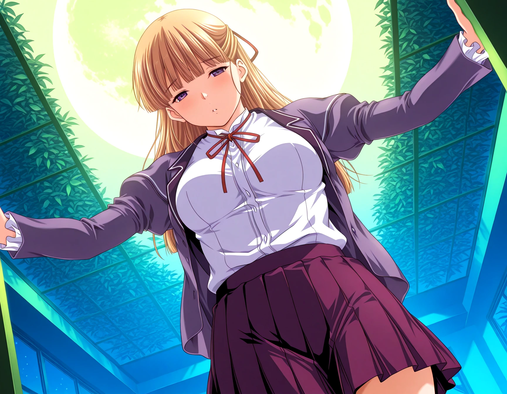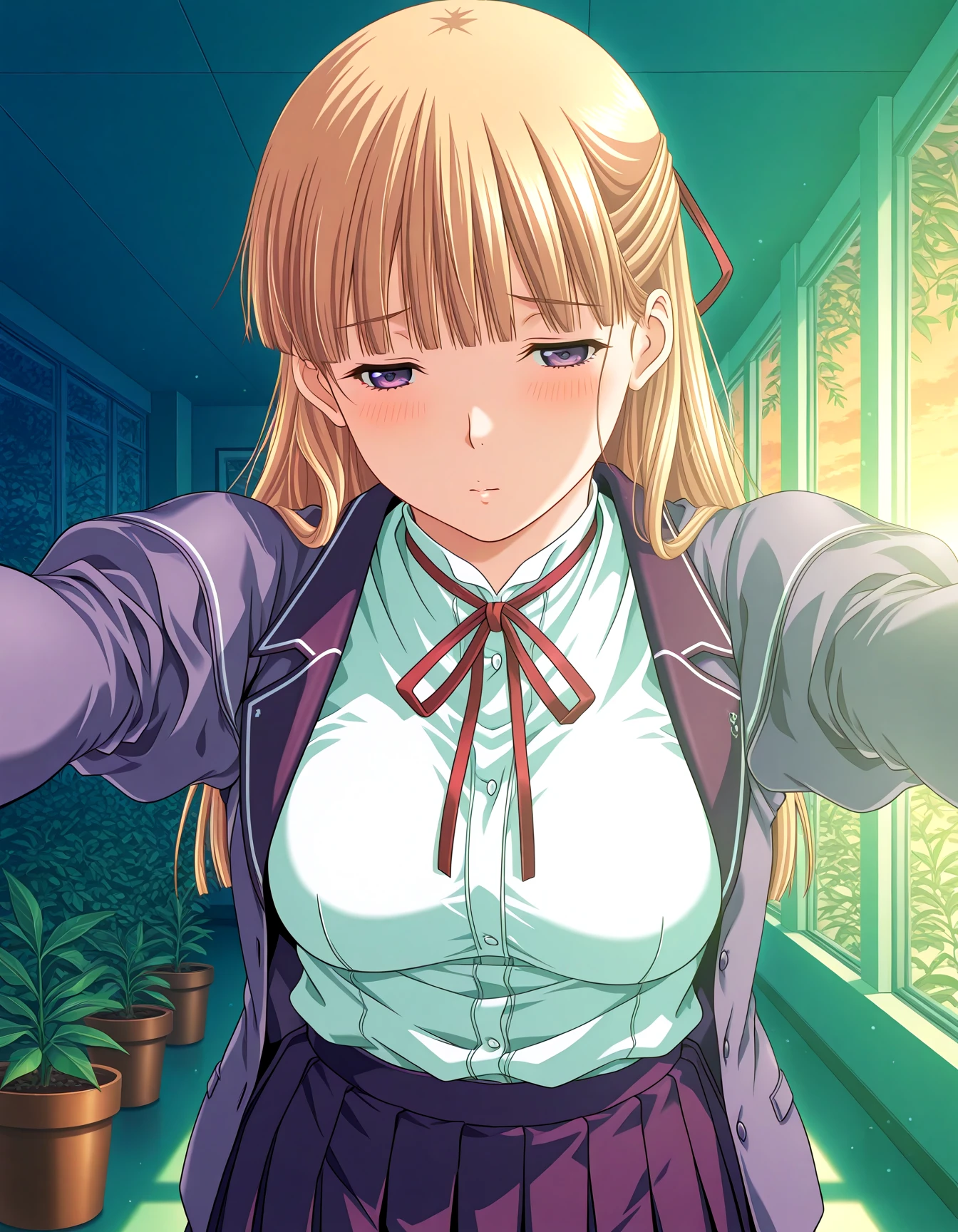 Kanzaki Asuka, 1girl, purple eyes, blonde hair, long hair, blunt bangs, half updo, hair ribbon, school uniform, purple jacket, collared shirt, white shirt, long sleeves, neck ribbon, pleated skirt, purple skirt, {|open jacket}